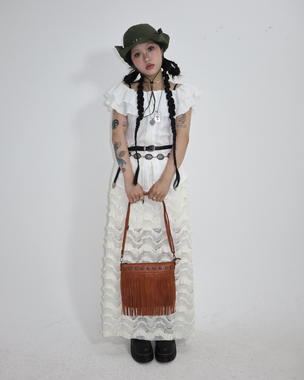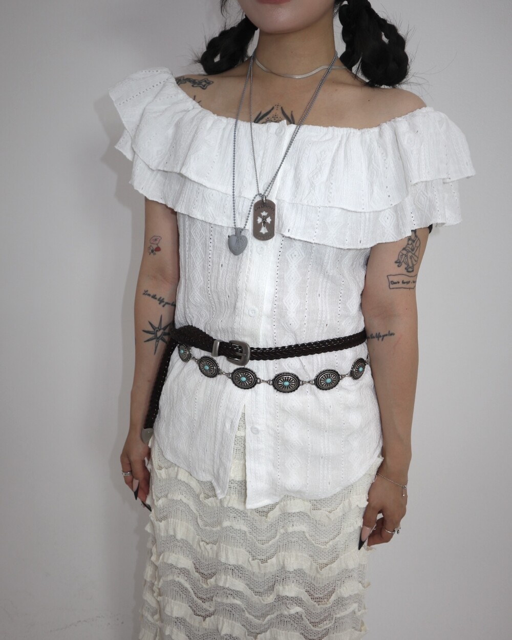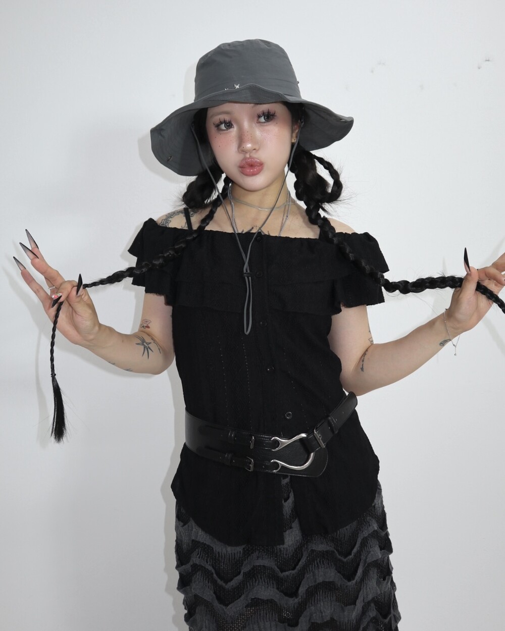 어깨 라인을 따라 흐르는 프릴 레이스 디테일이