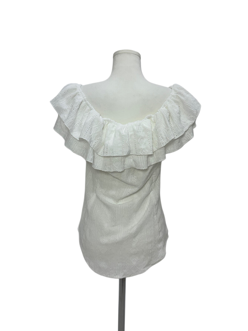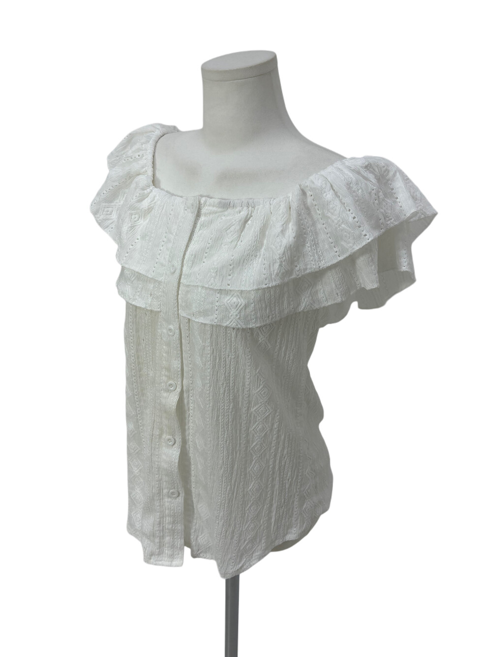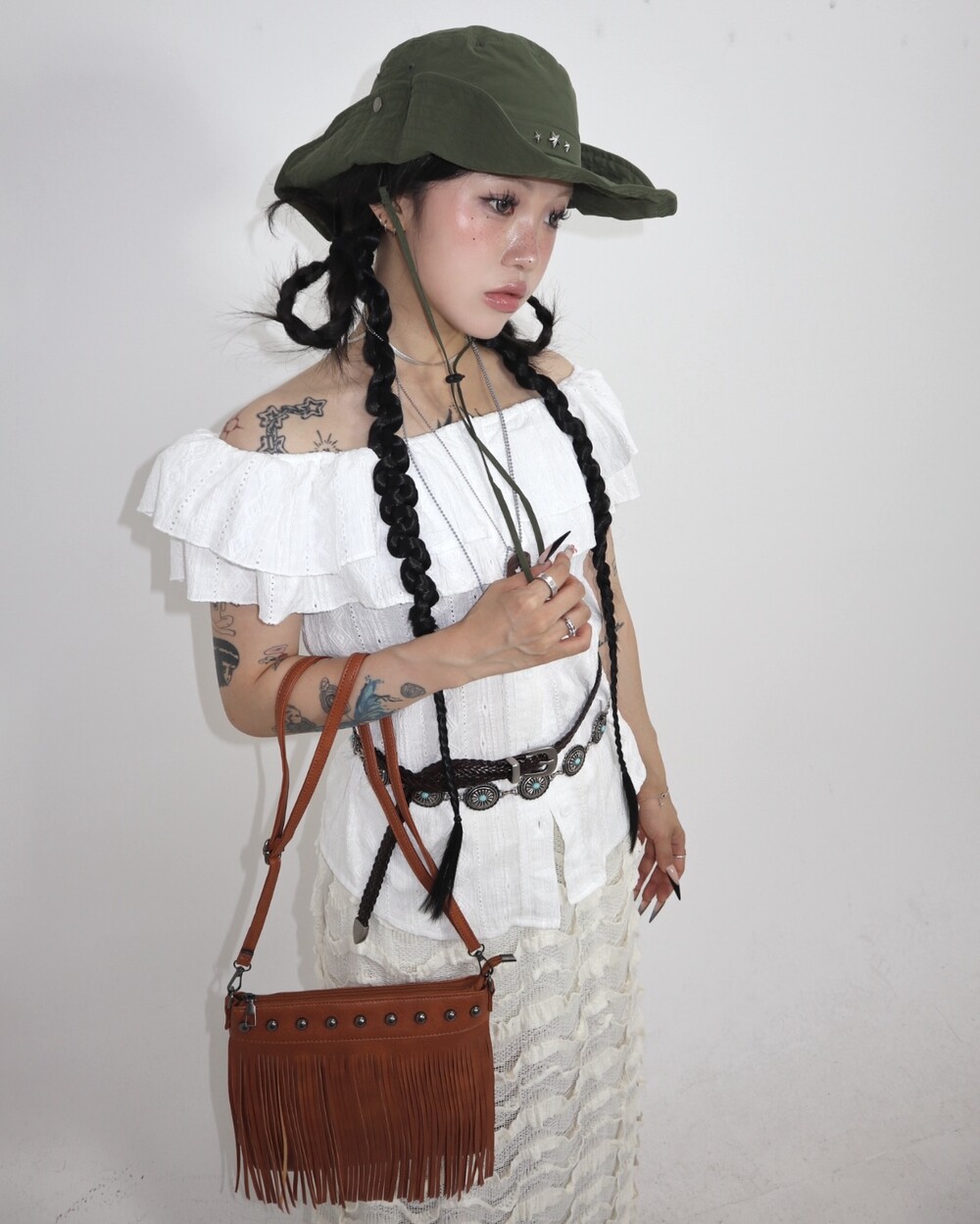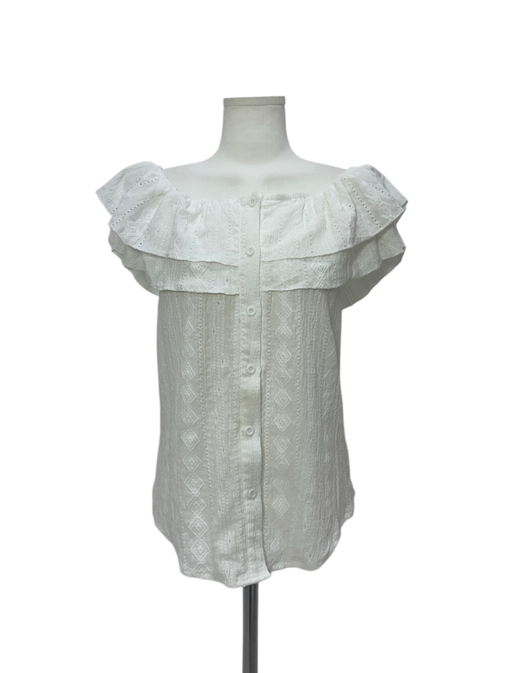 어깨 라인을 따라 흐르는 프릴 레이스 디테일이