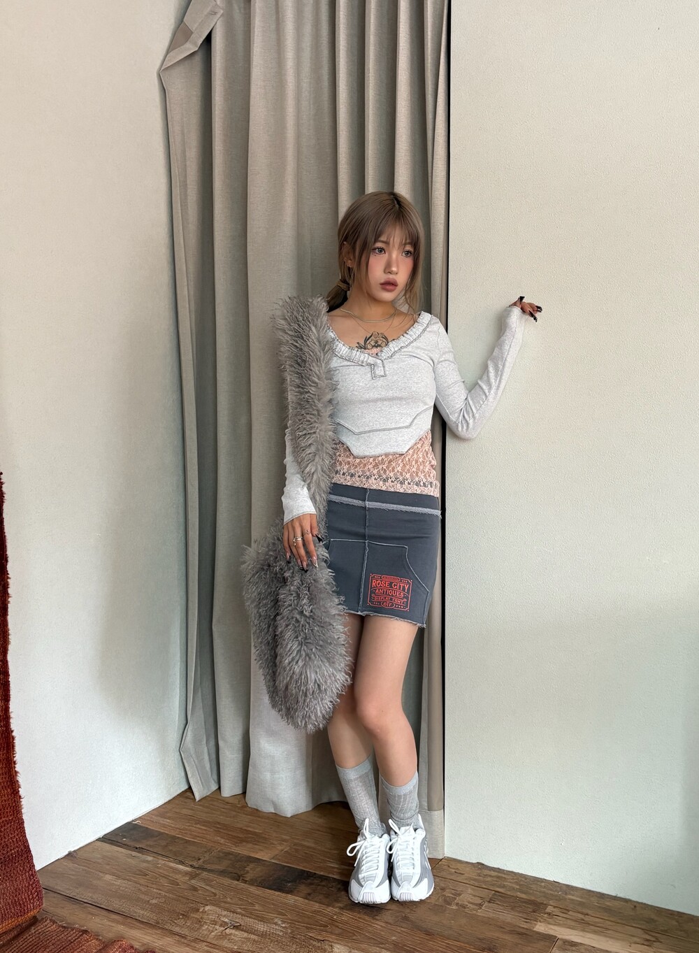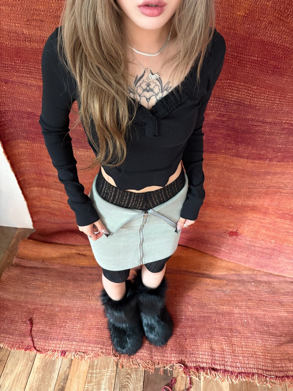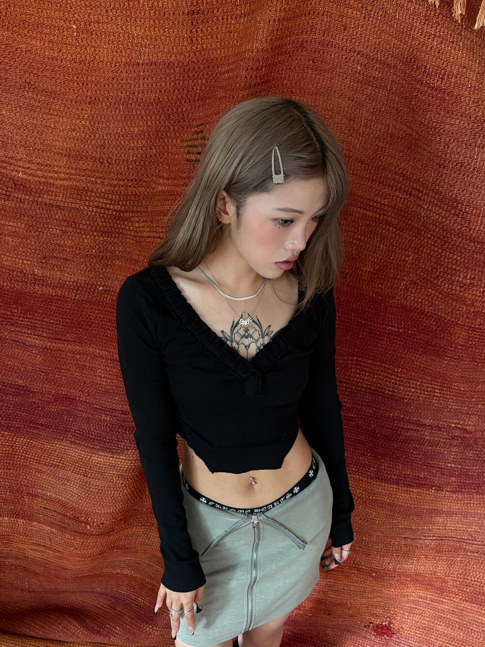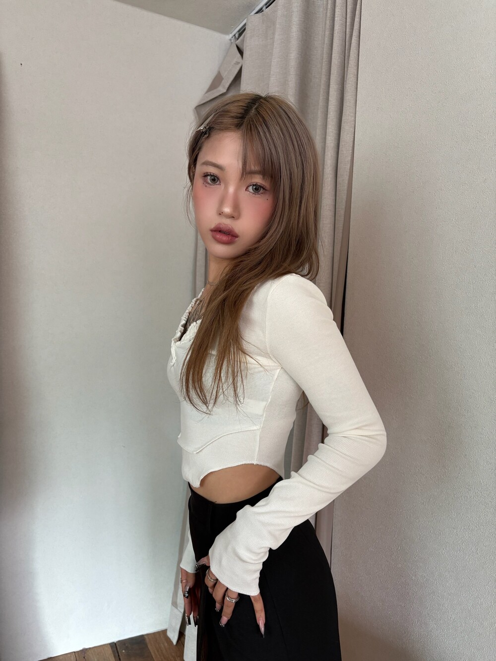 딥한 v넥으로 단독으로 입어도 좋지만 슬리브리스와 레이어드 코디하여도 너무 예뻐요 :)