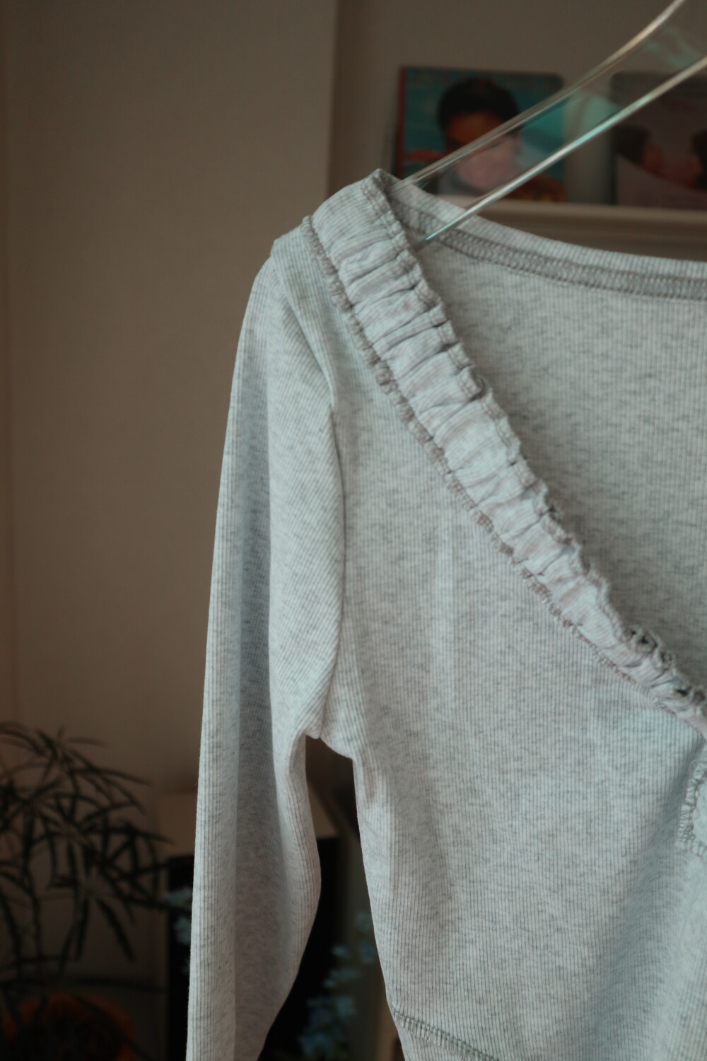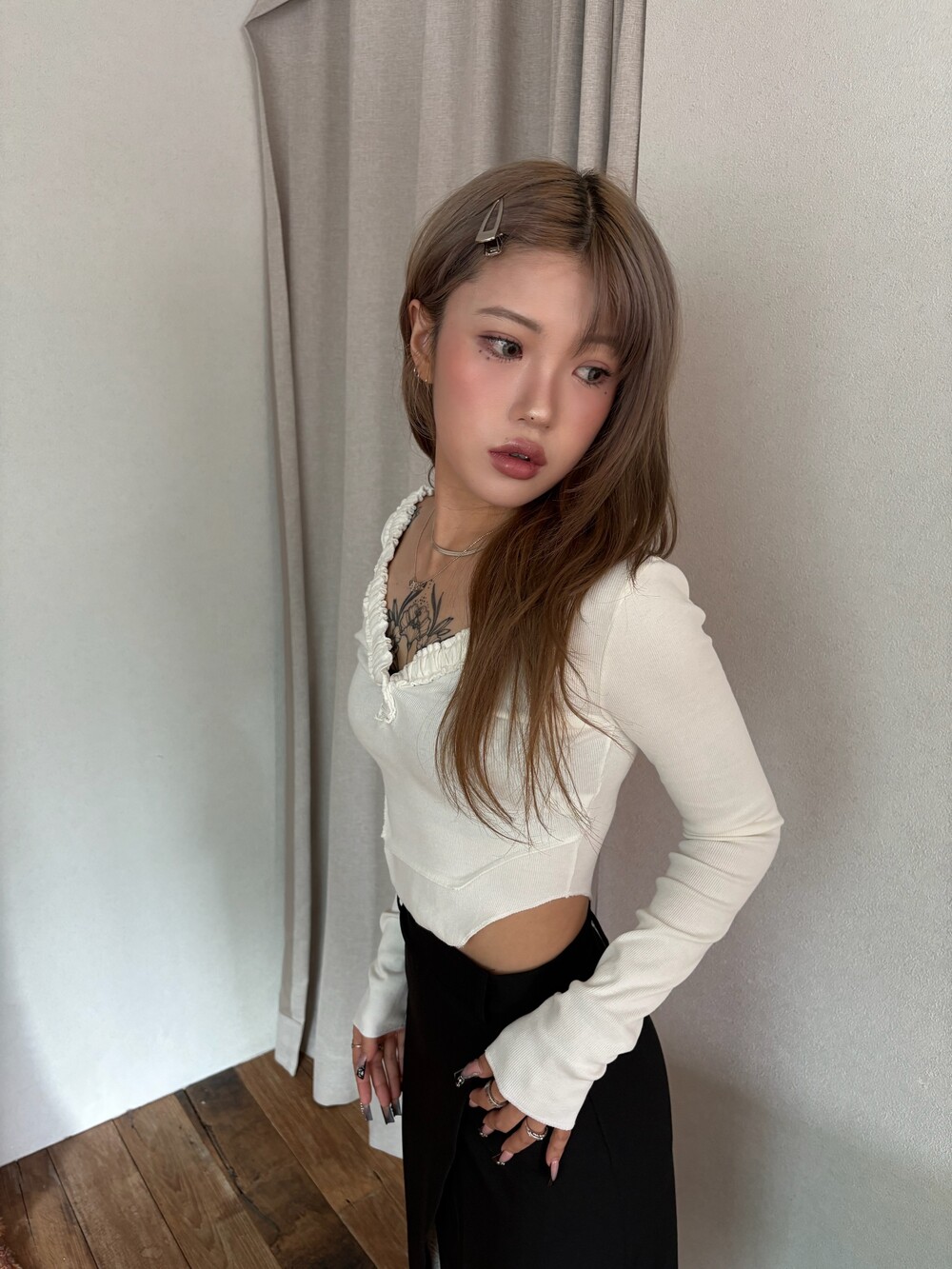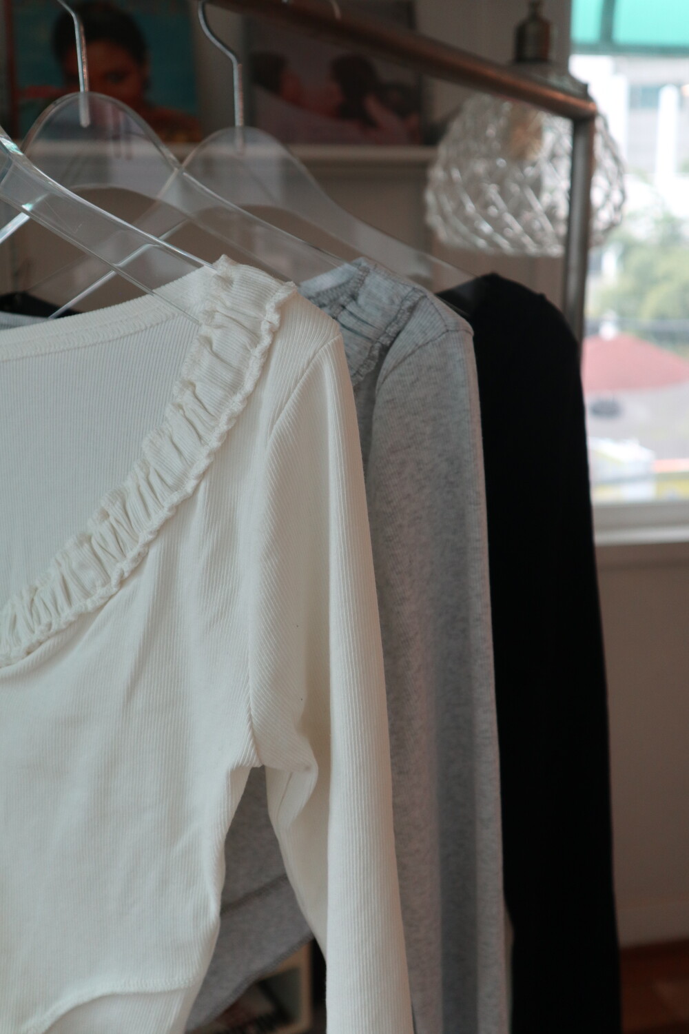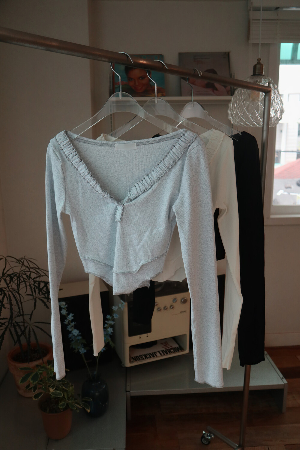넥라인 프릴 디테일로 페미닌한 무드의 롱슬리브 티셔츠