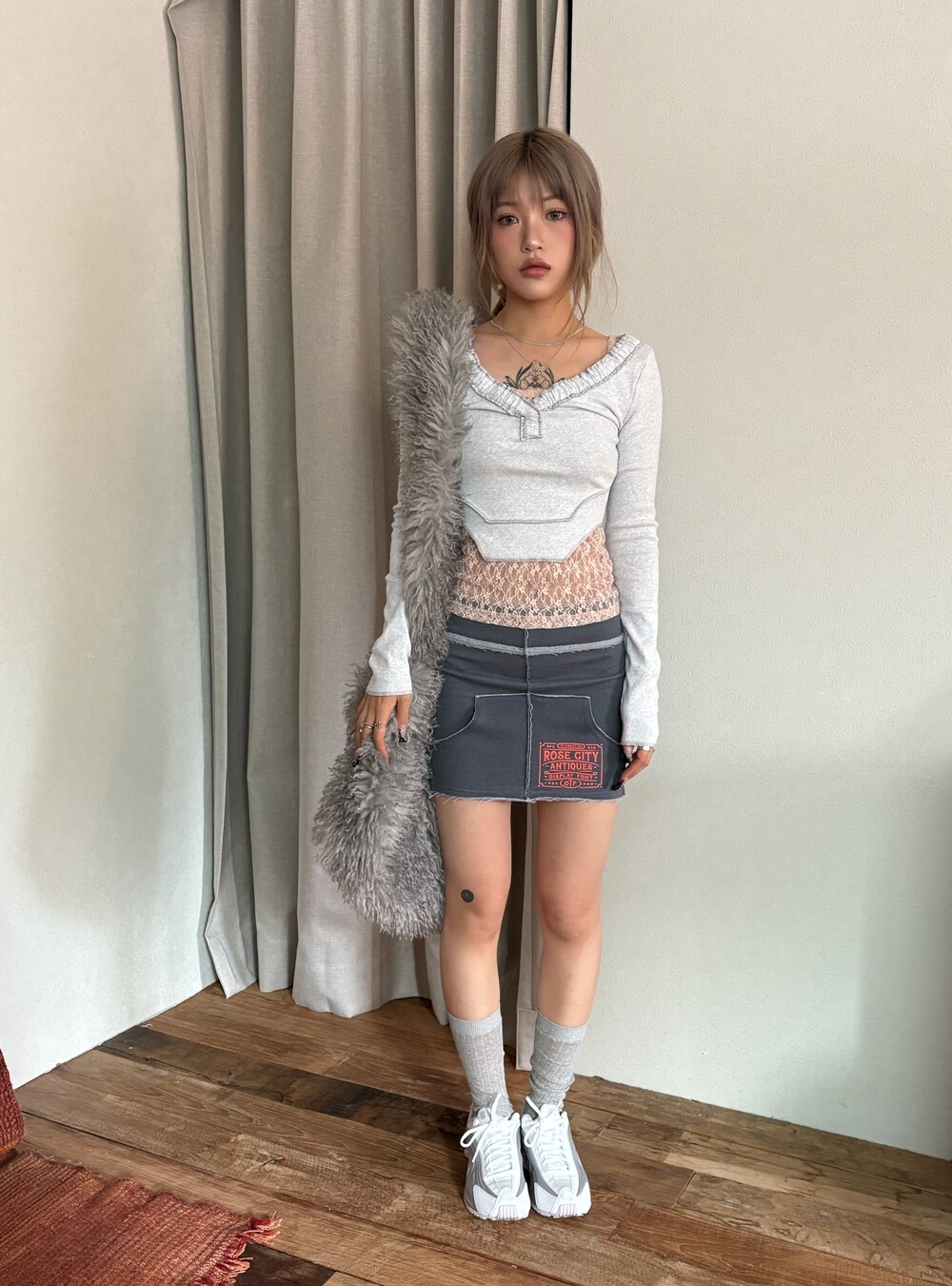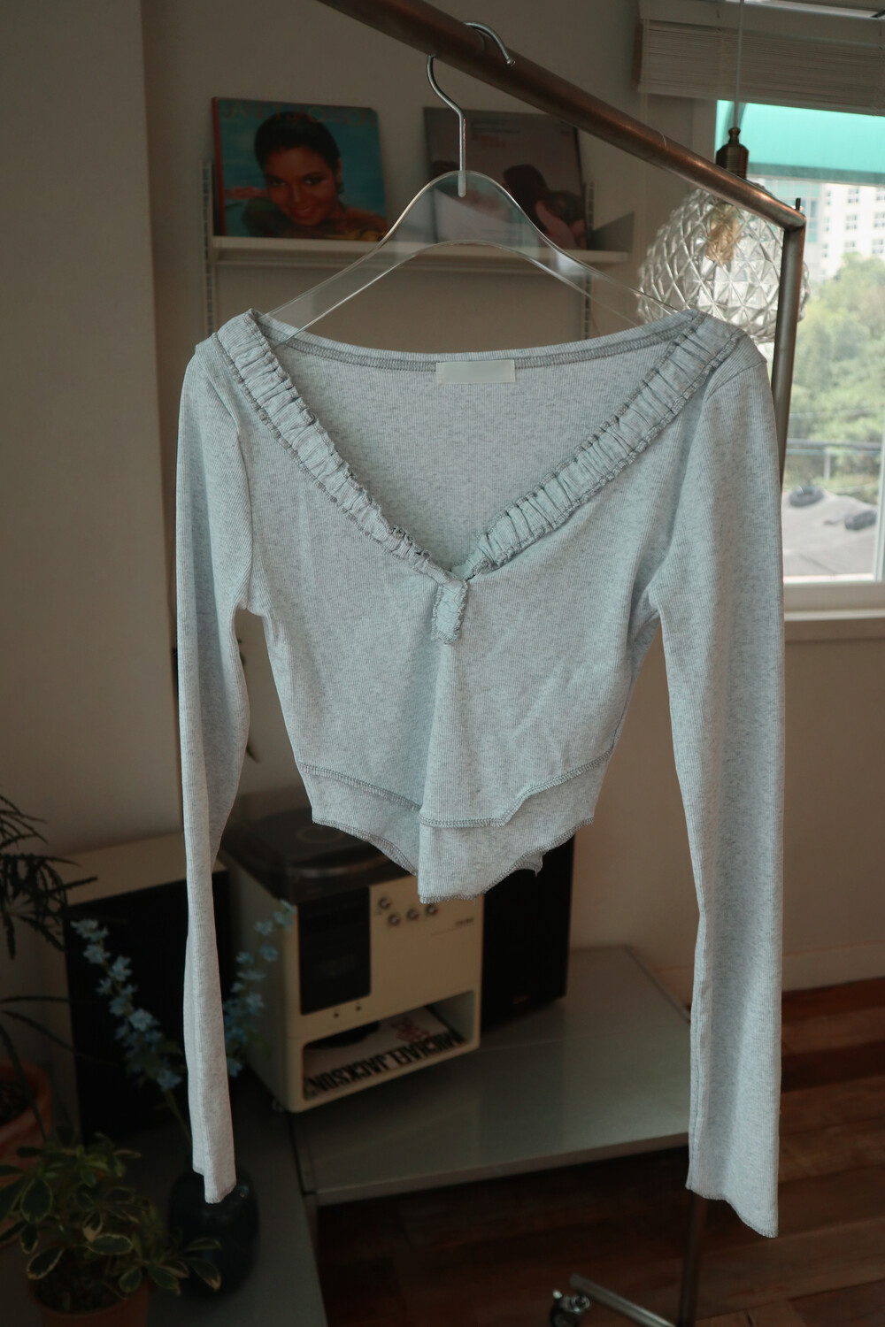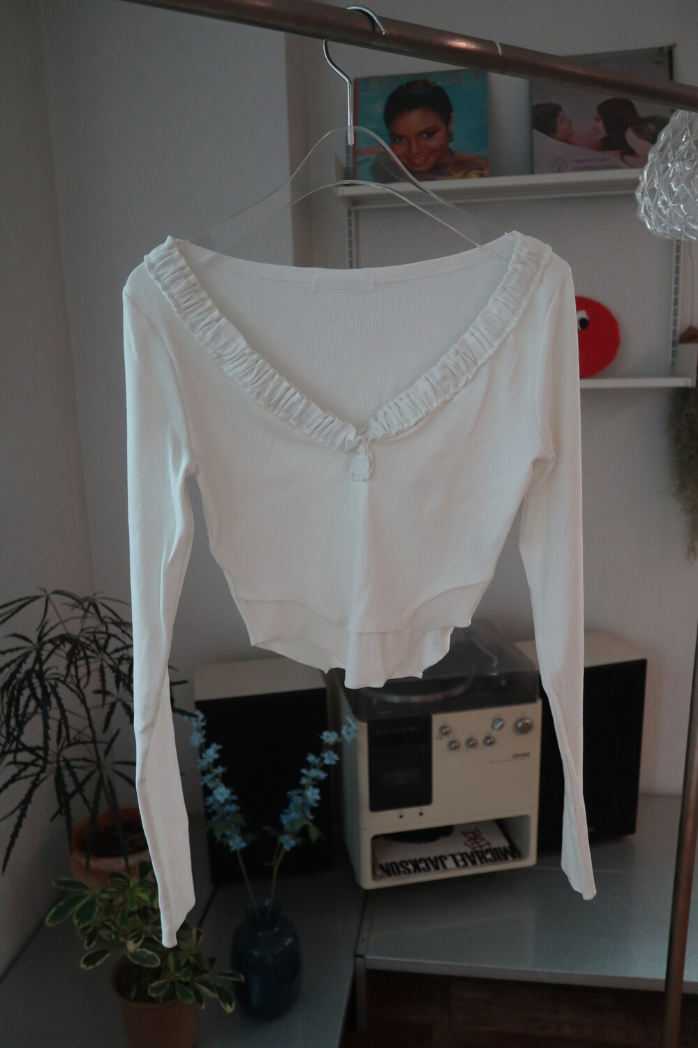 넥라인 프릴 디테일로 페미닌한 무드의 롱슬리브 티셔츠