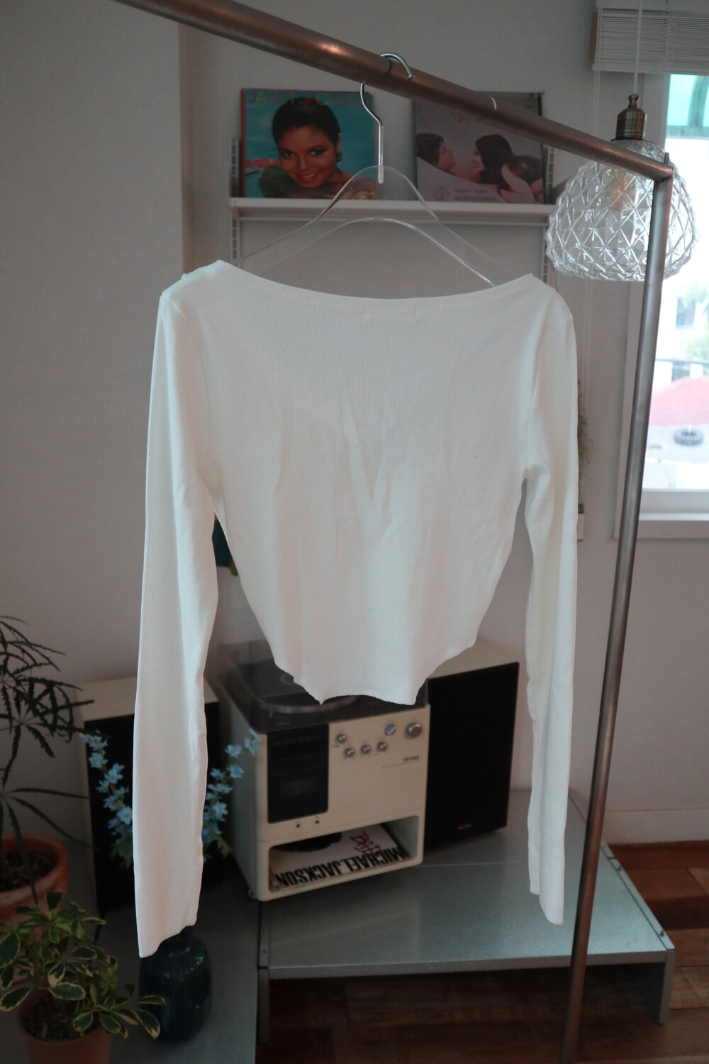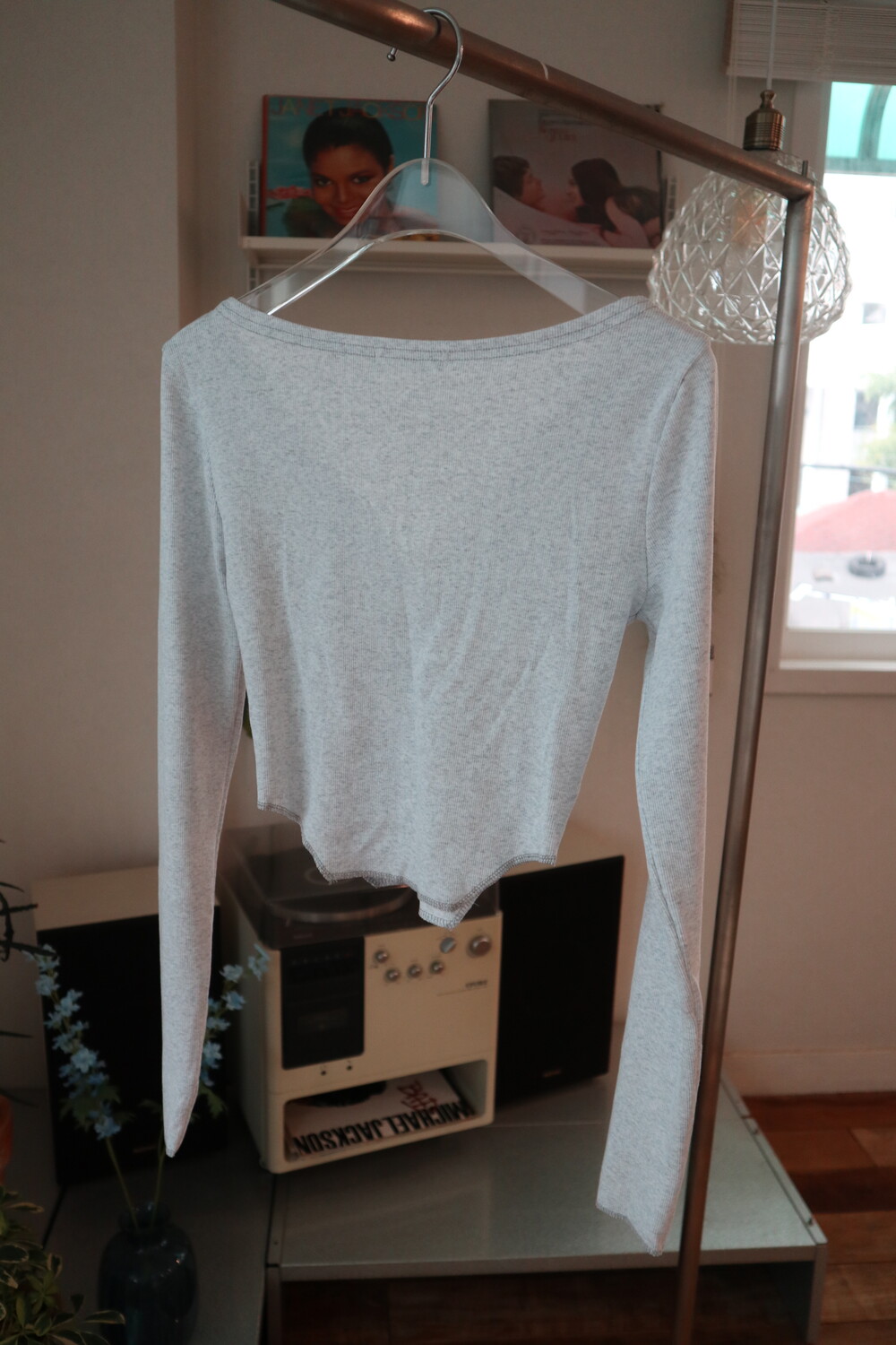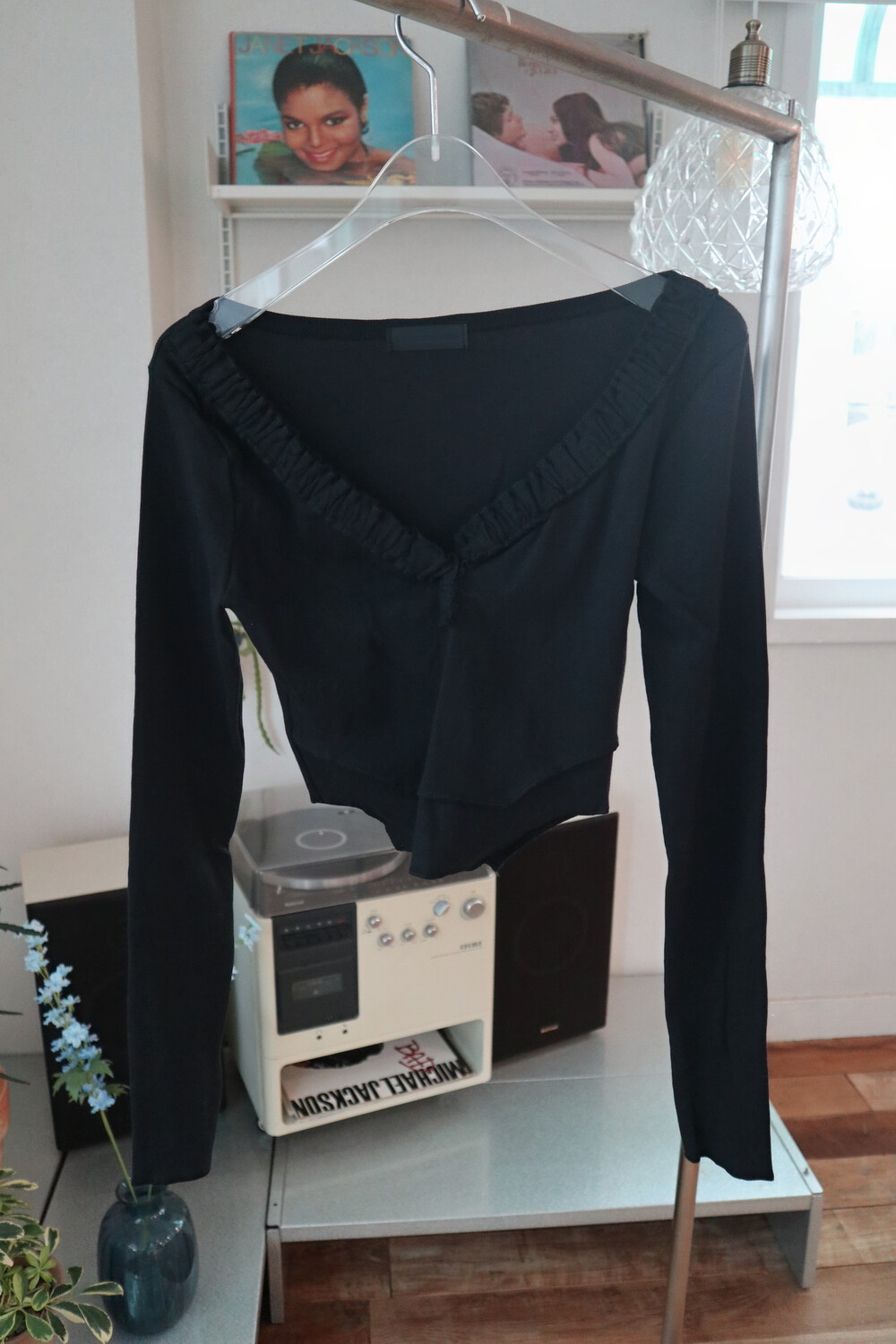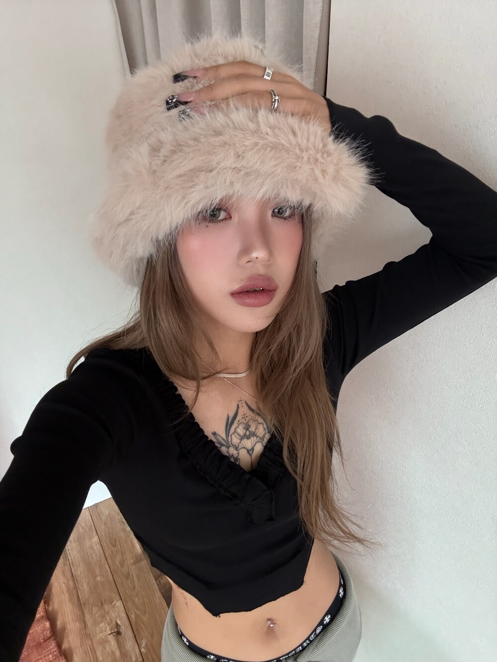 넥라인 프릴 디테일로 페미닌한 무드의 롱슬리브 티셔츠