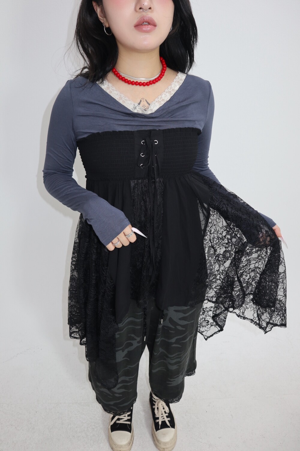 허리 코르셋 디테일과 언발란스한 컷팅으로