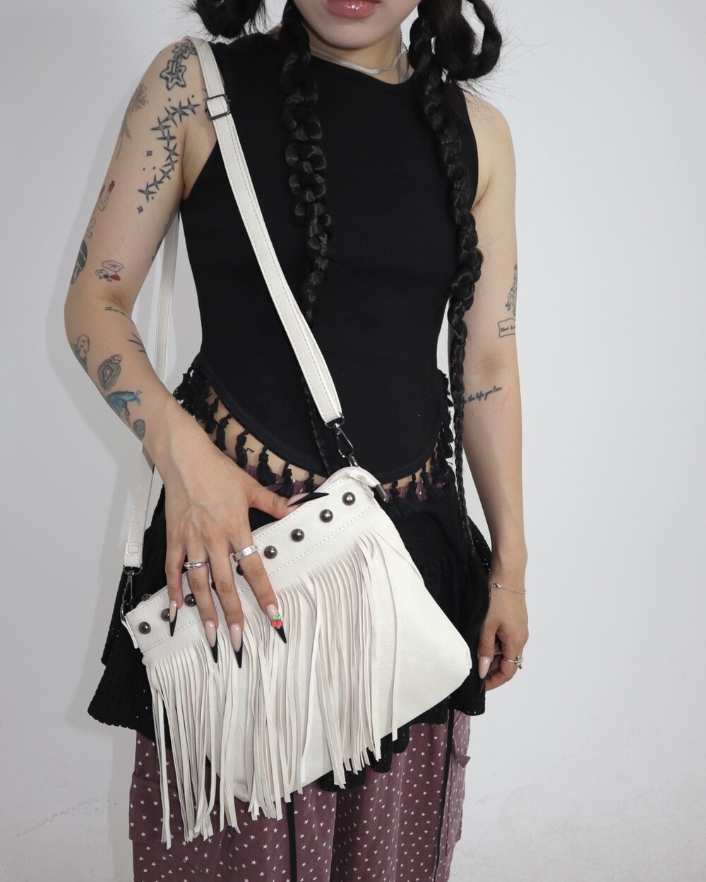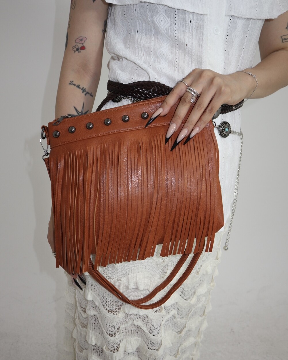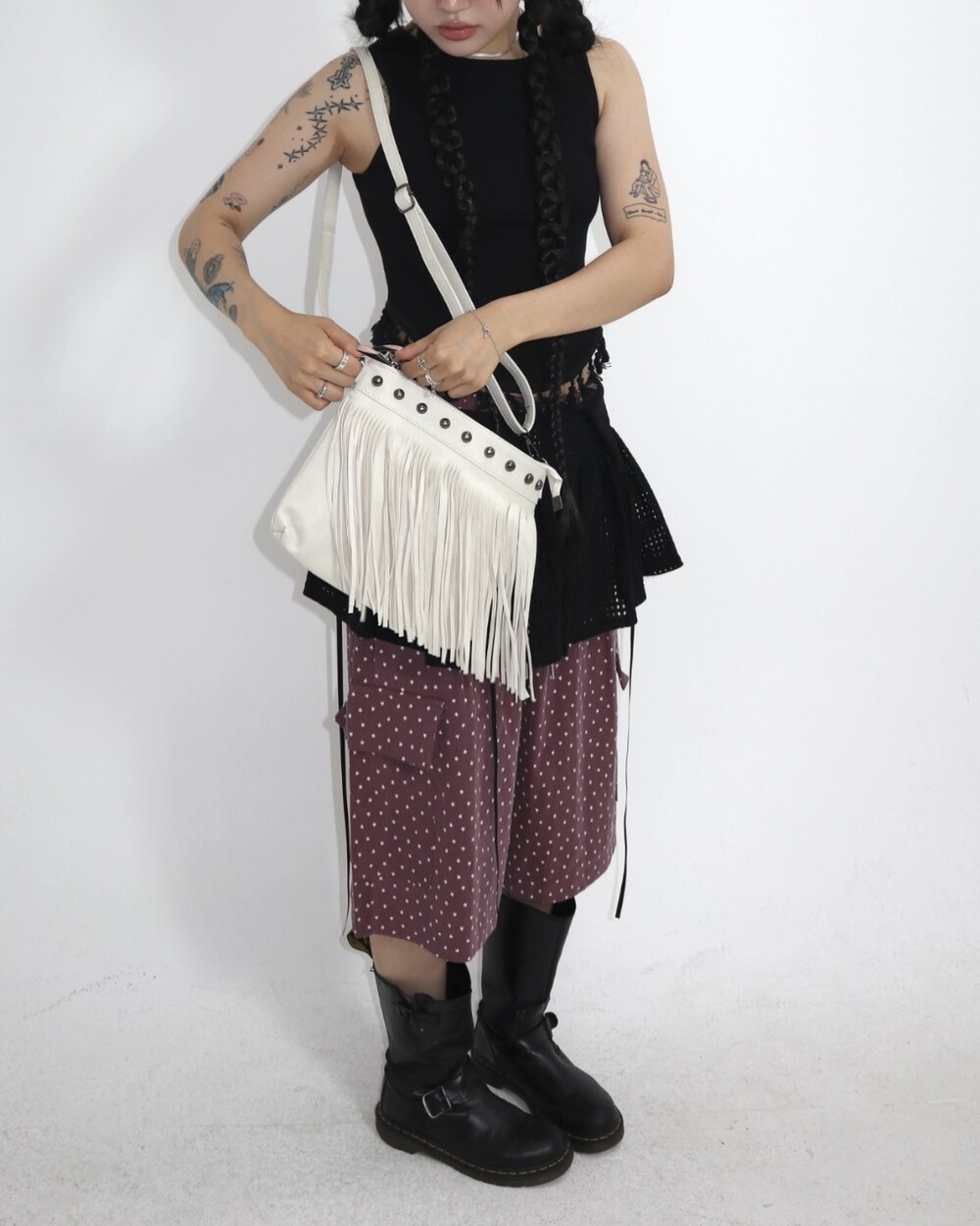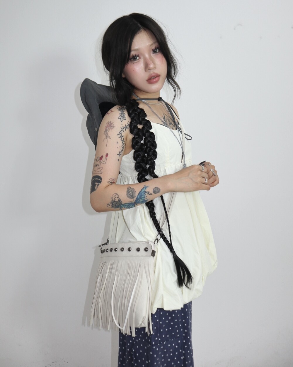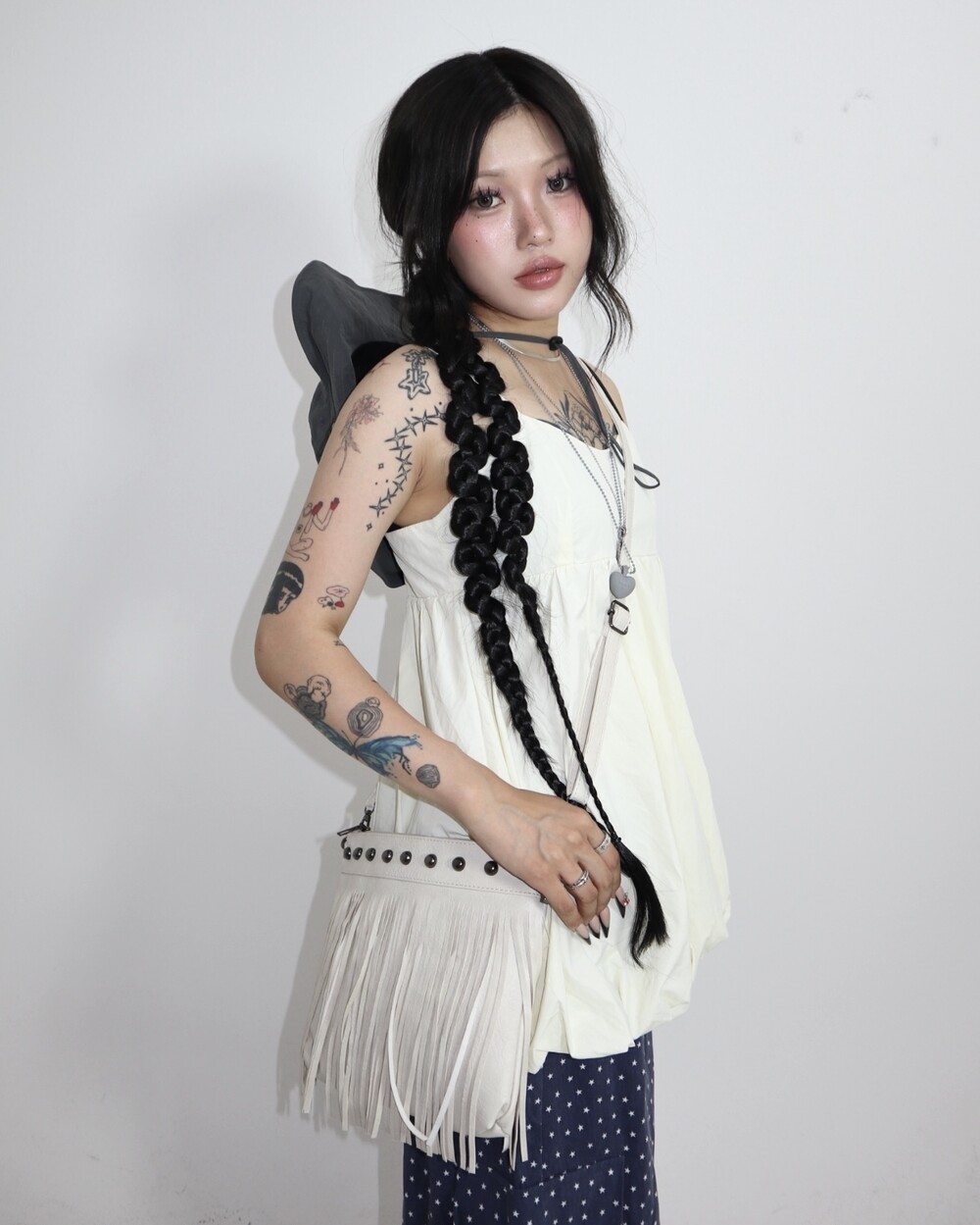 러프한 프린지와 스터드 디테일이 조화를 이루는