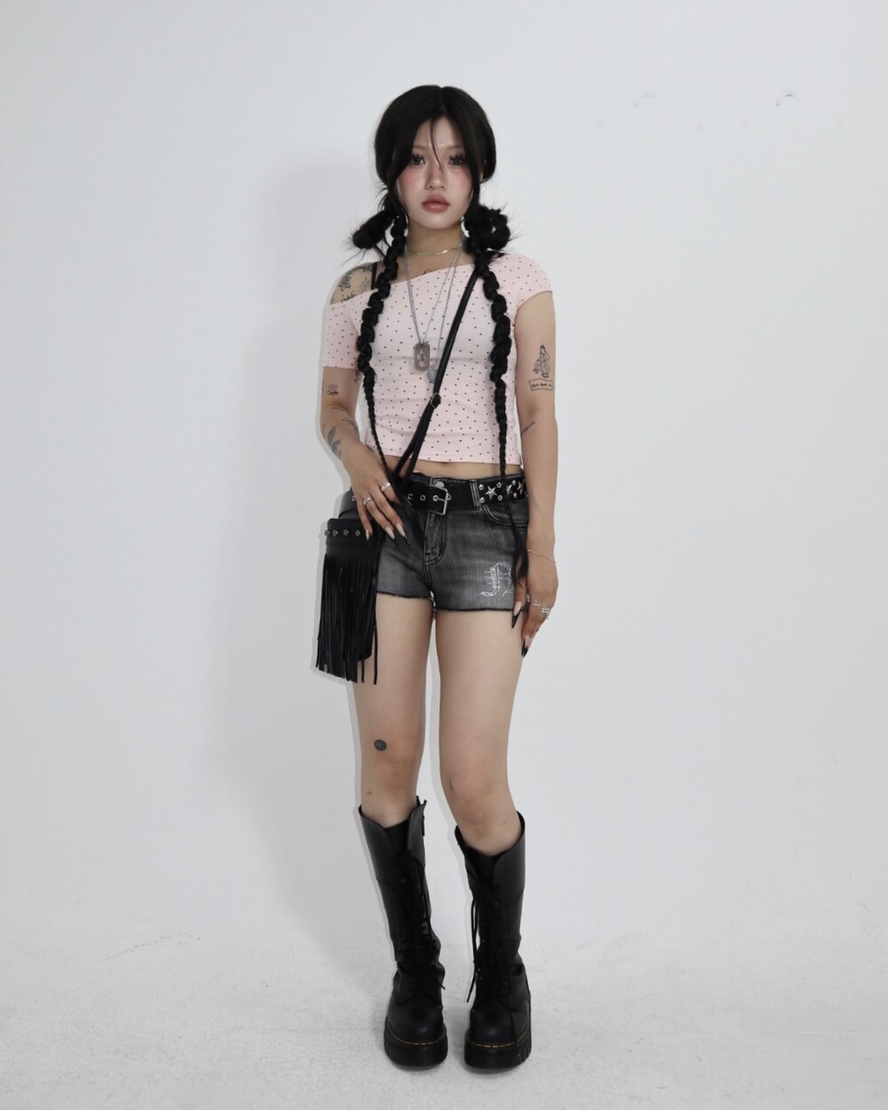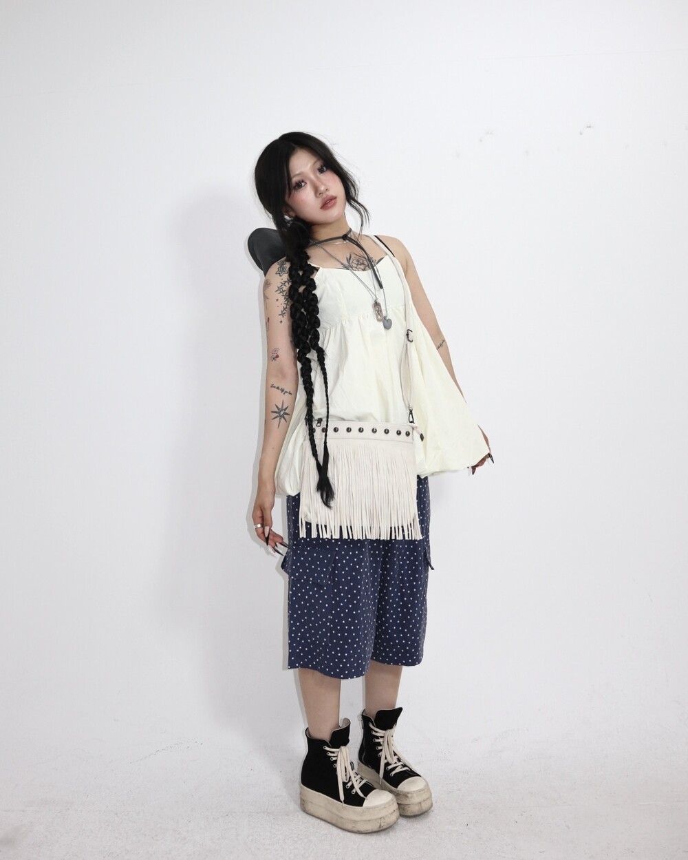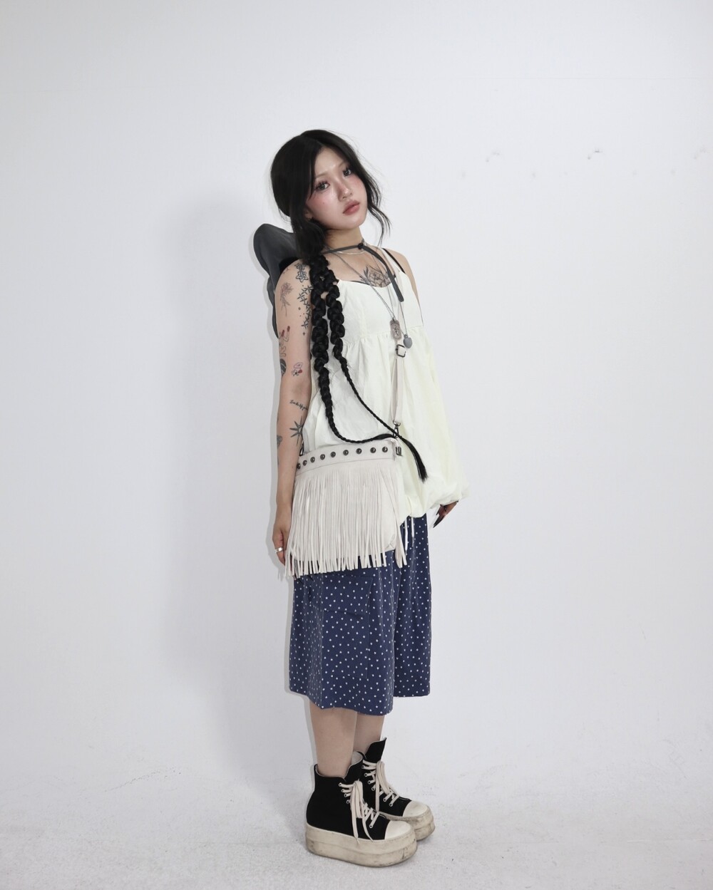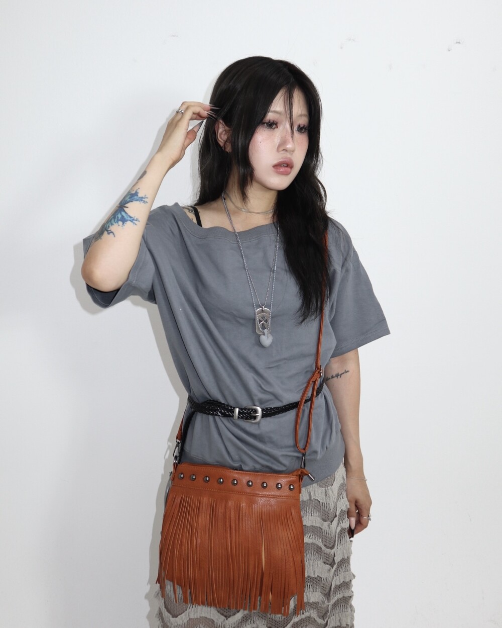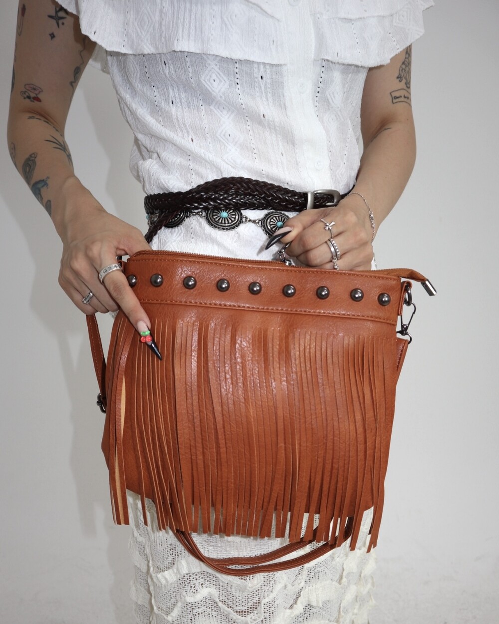 러프한 프린지와 스터드 디테일이 조화를 이루는