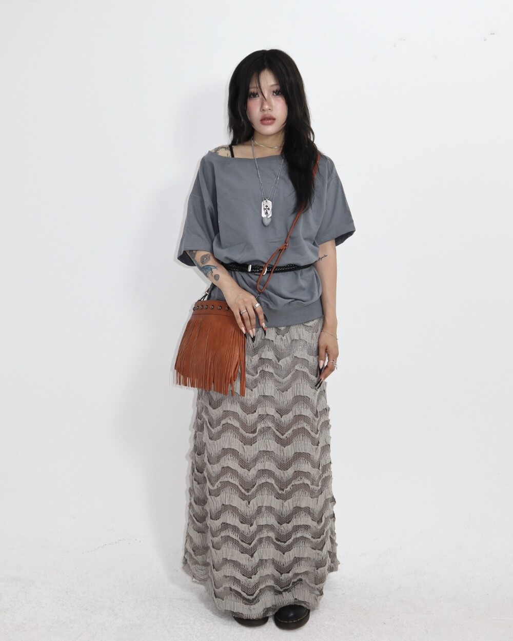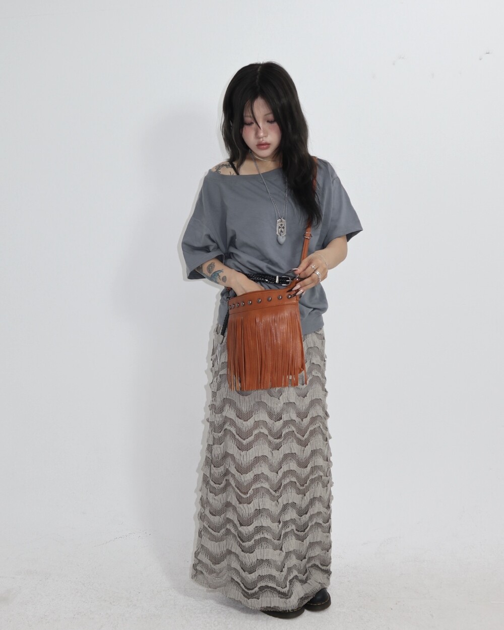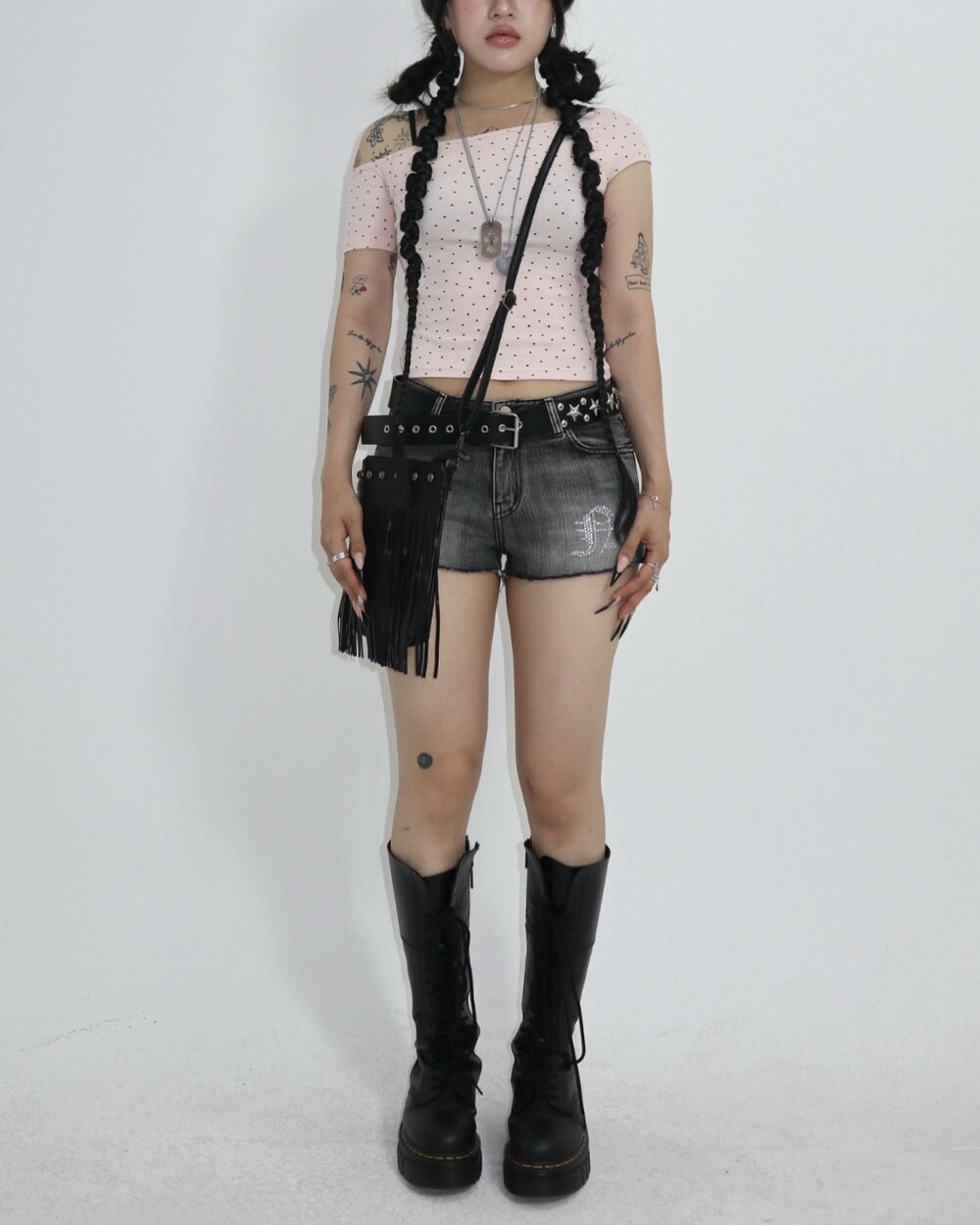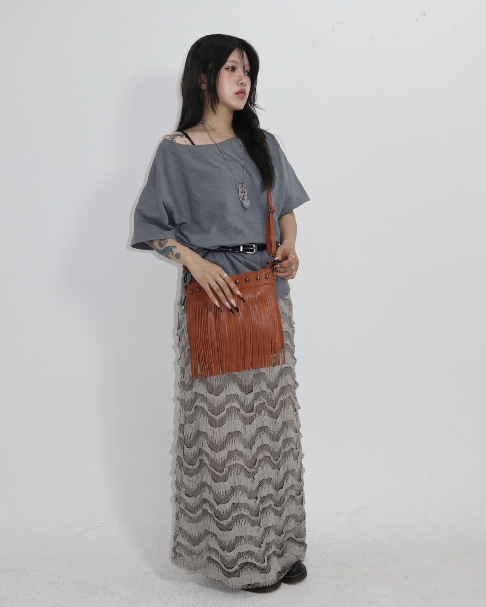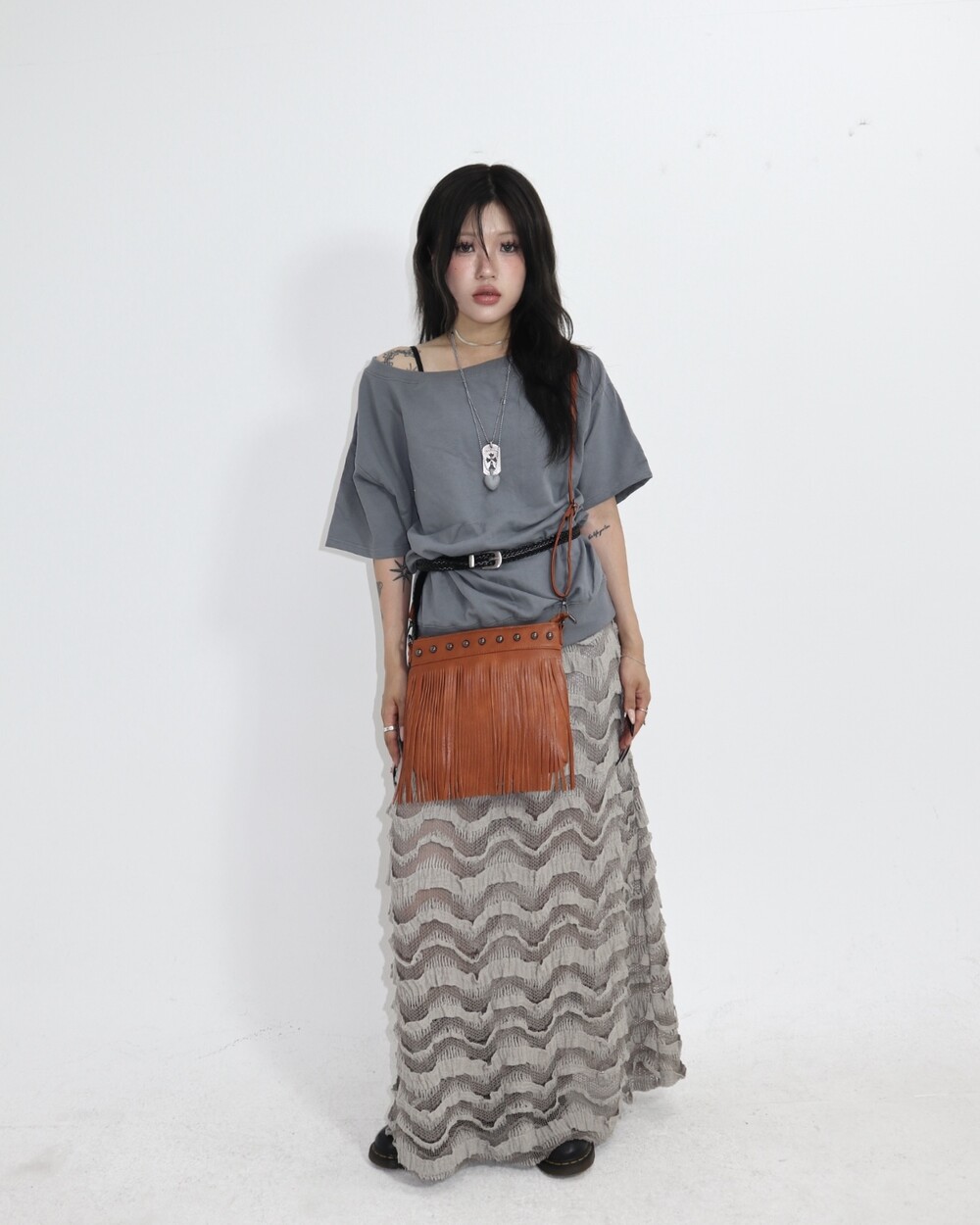 러프한 프린지와 스터드 디테일이 조화를 이루는