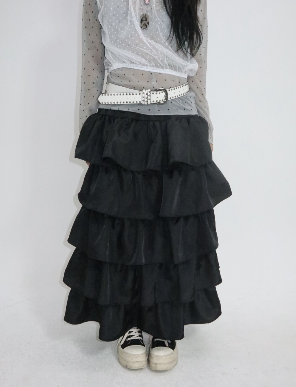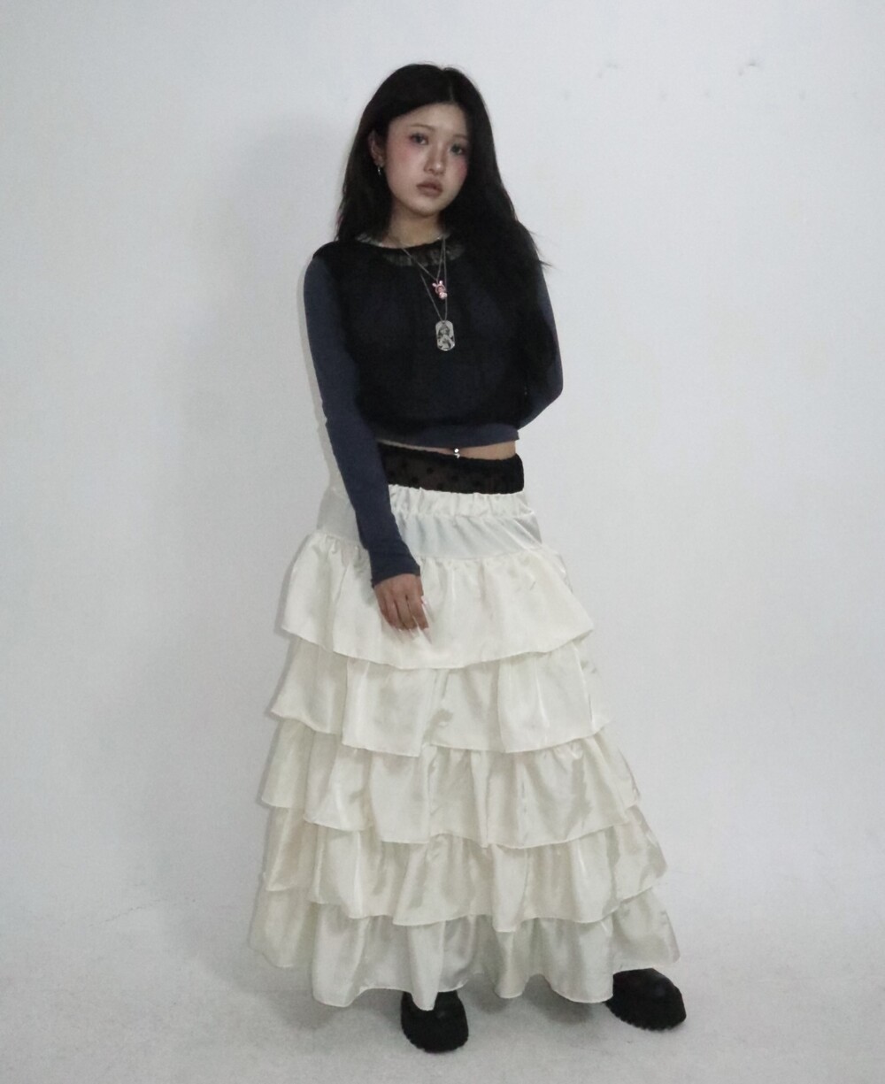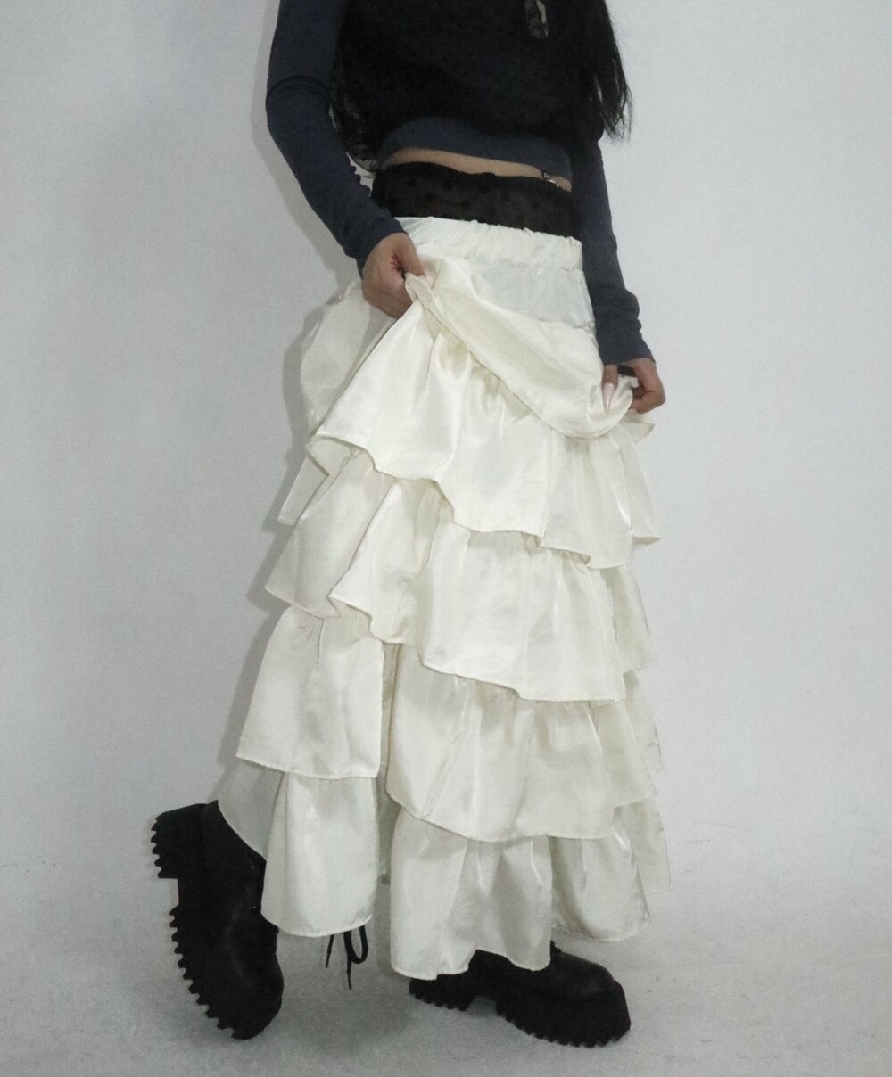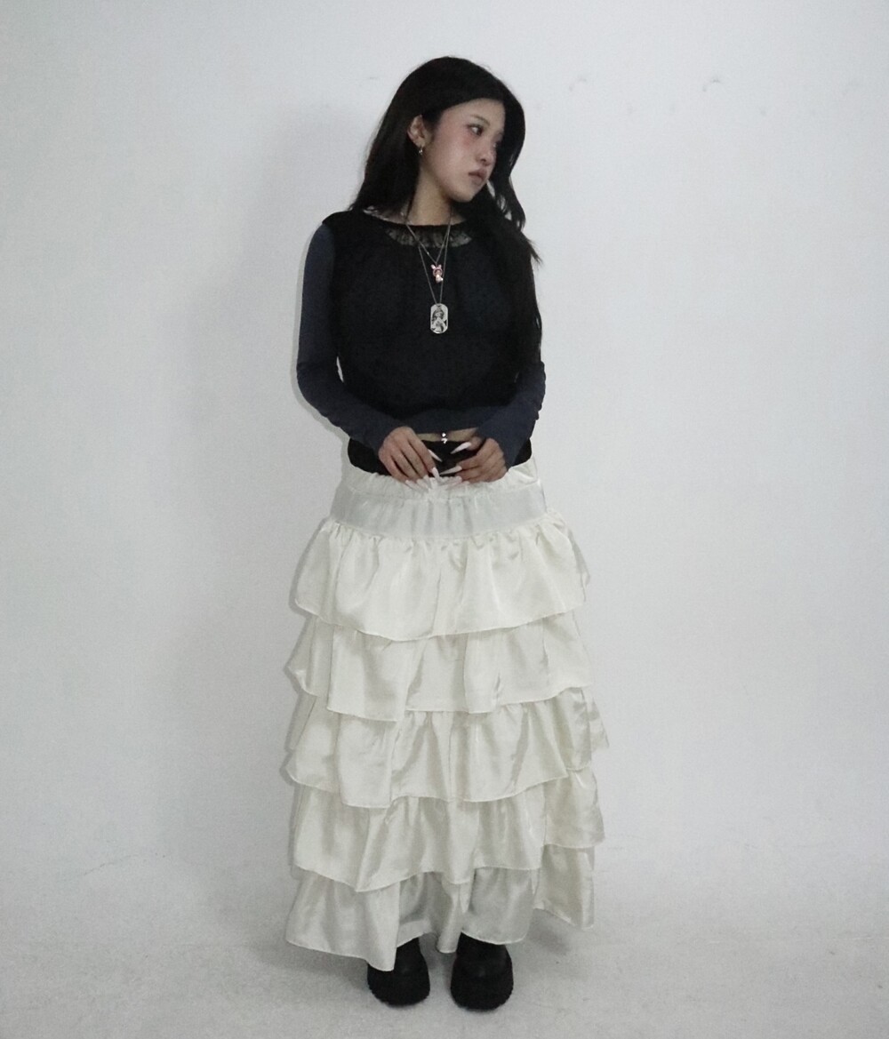 캉캉 러플 디테일로 로맨틱한 무드를 더한 맥시 스커트예요.