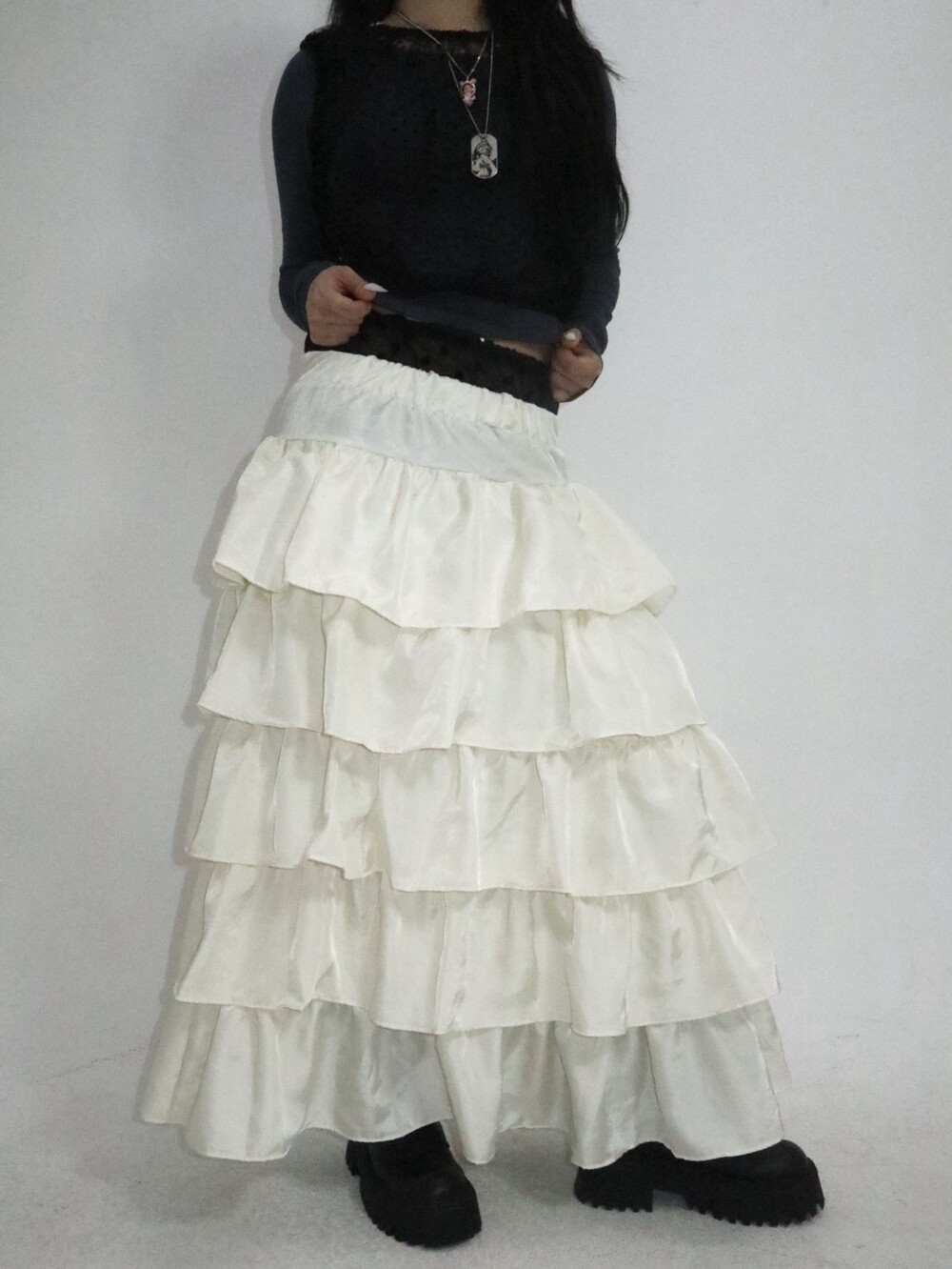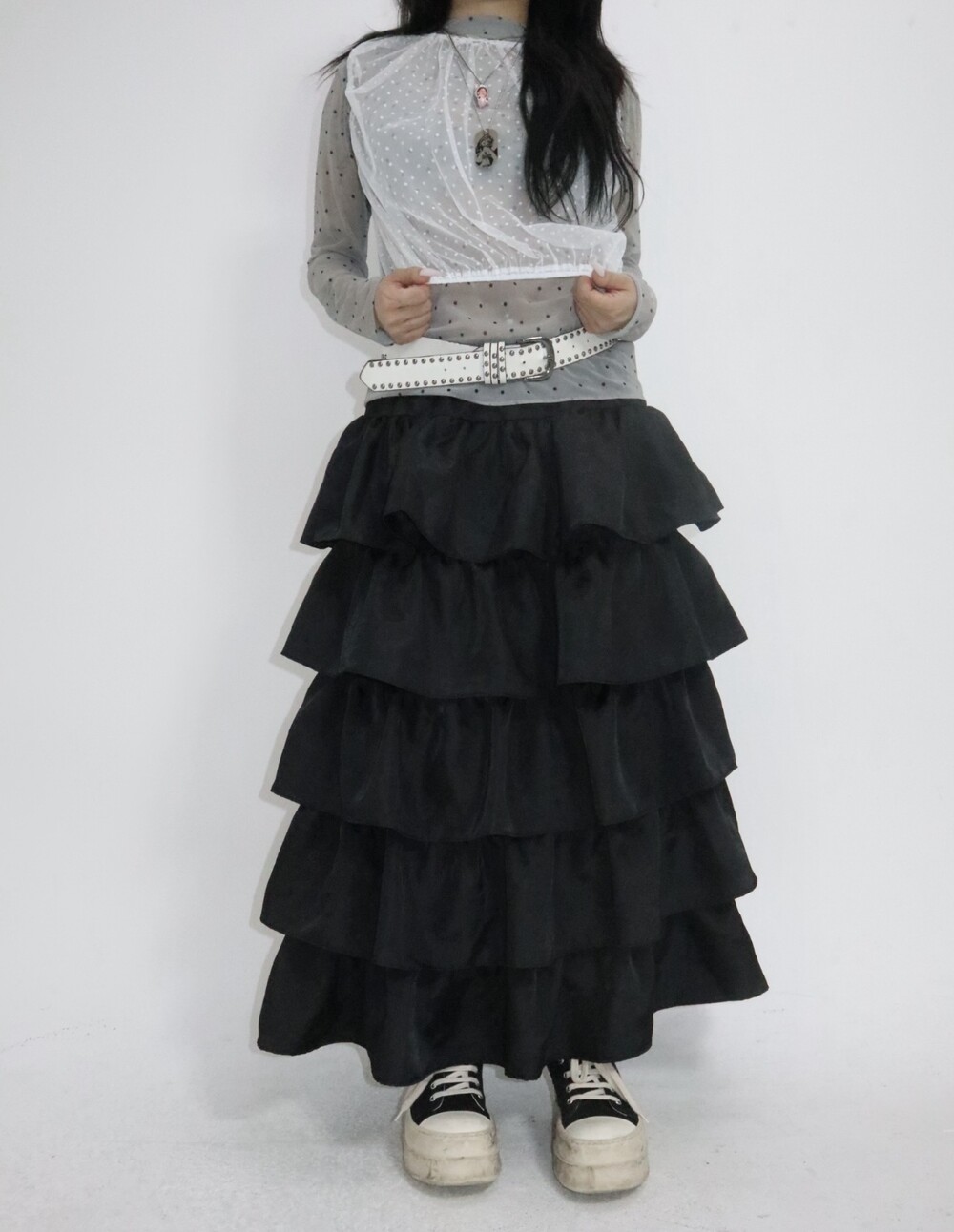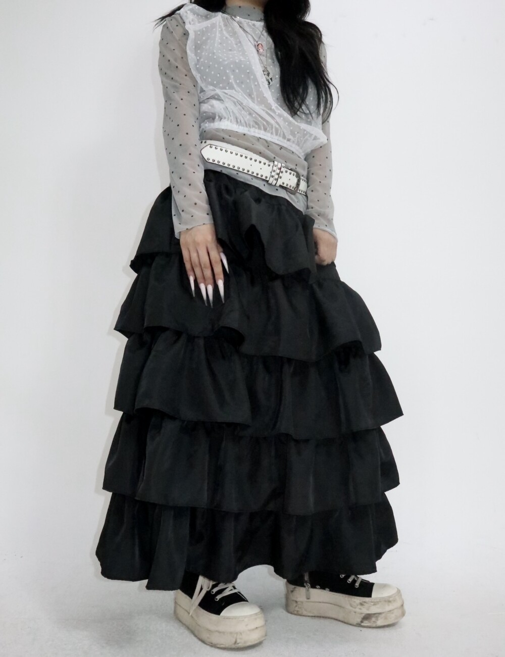 캉캉 러플 디테일로 로맨틱한 무드를 더한 맥시 스커트예요.