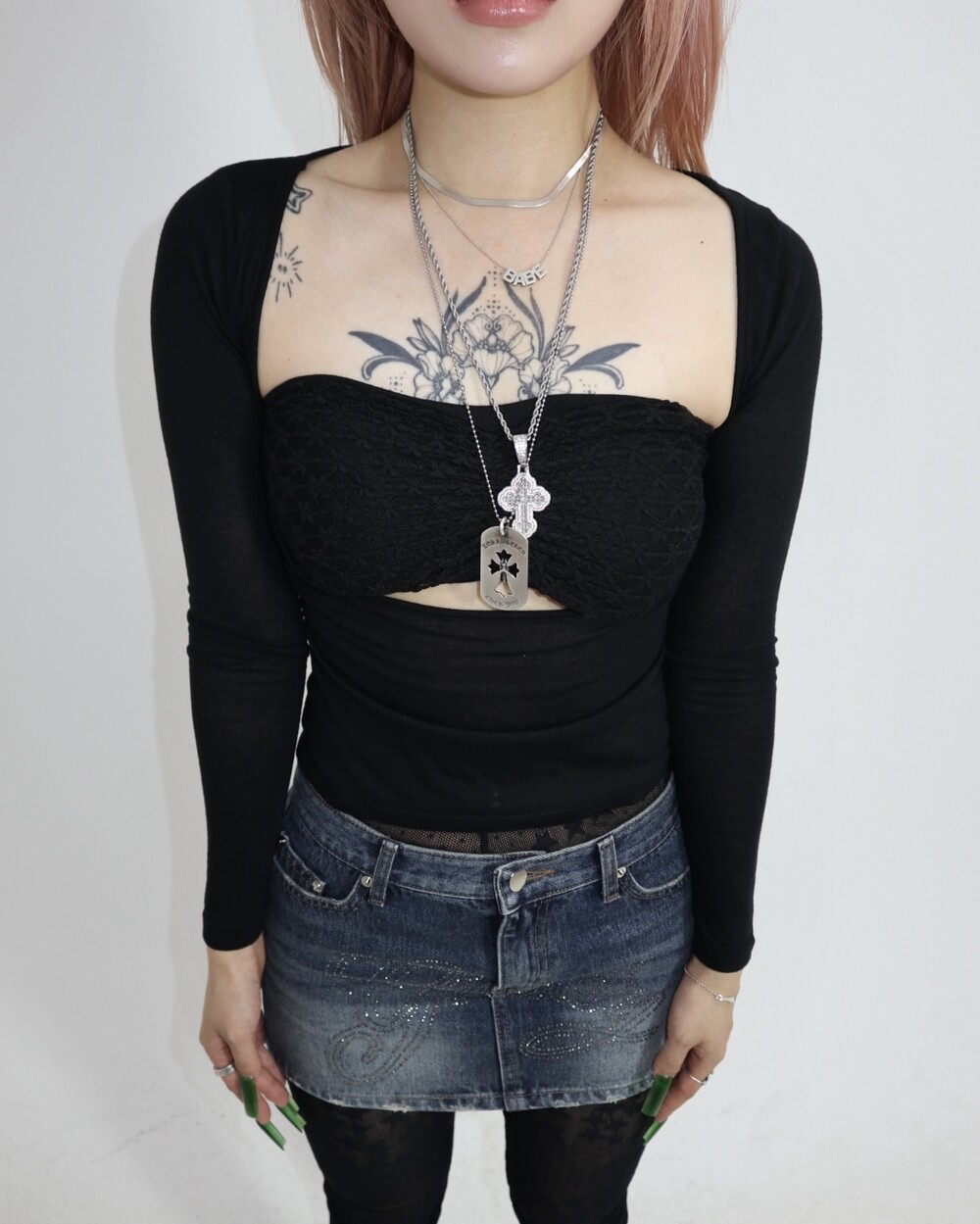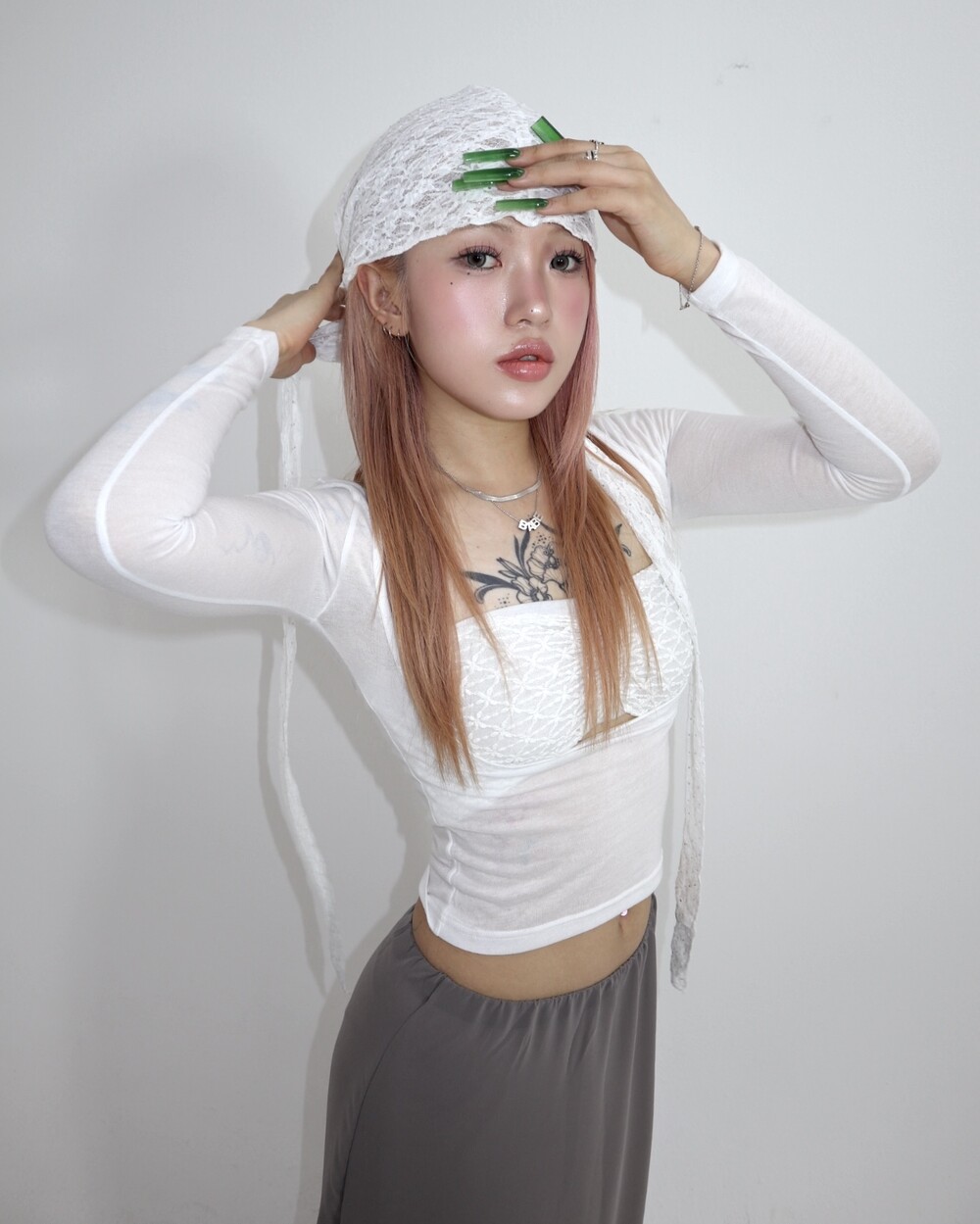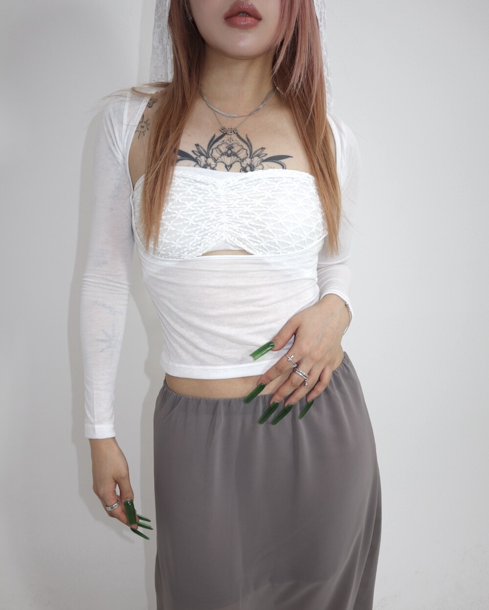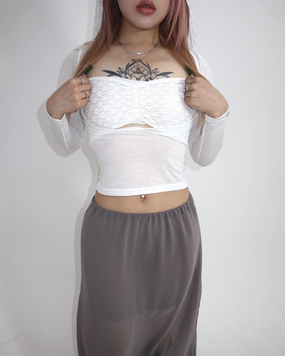 페미닌한 무드에 유니크함을 더한 플라워 레이스 튜브탑 & 시스루 긴팔 탑 세트 소개드려요.