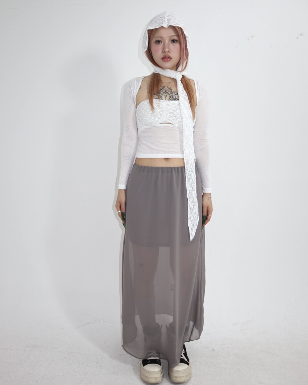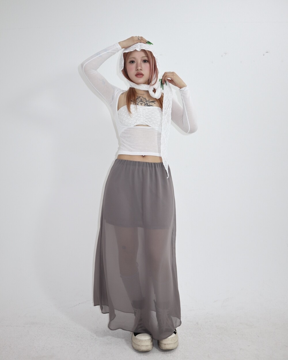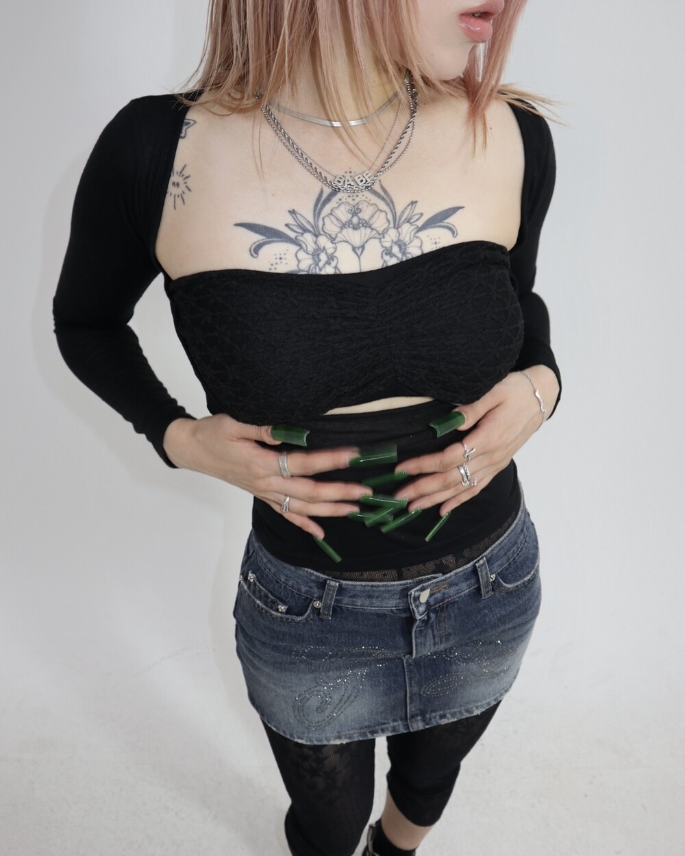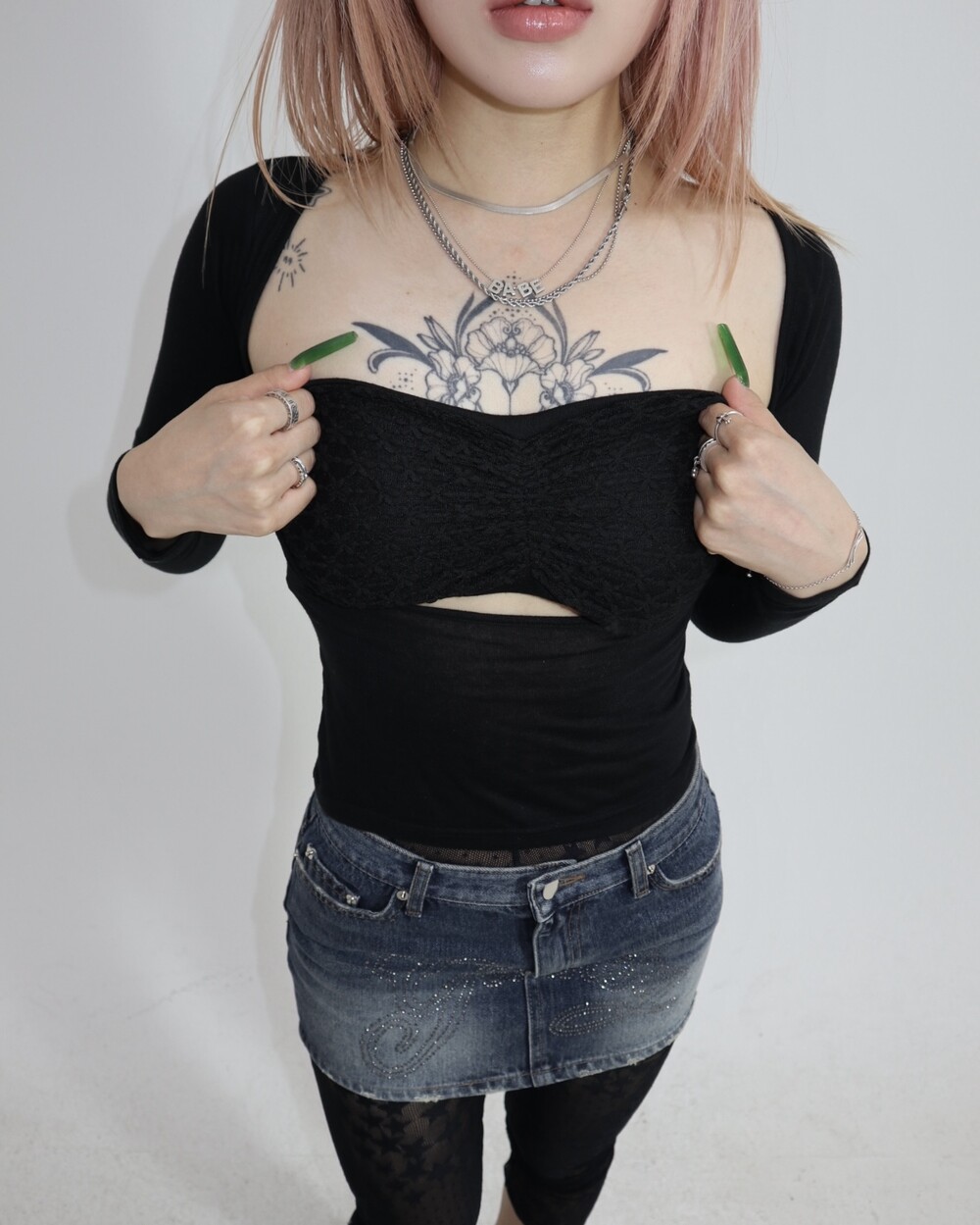 페미닌한 무드에 유니크함을 더한 플라워 레이스 튜브탑 & 시스루 긴팔 탑 세트 소개드려요.