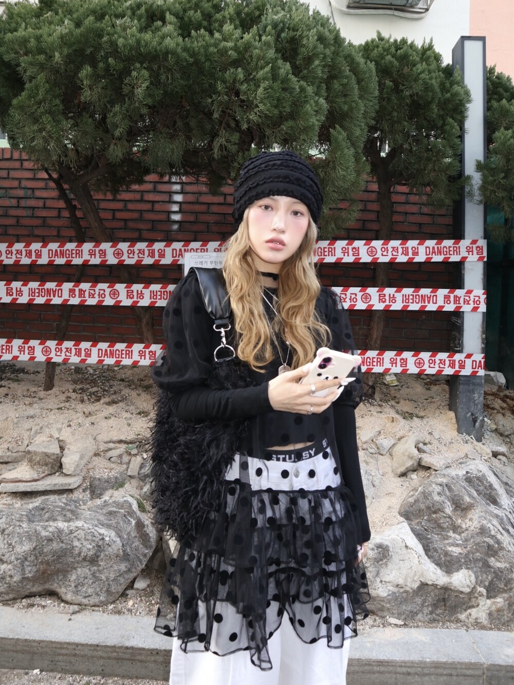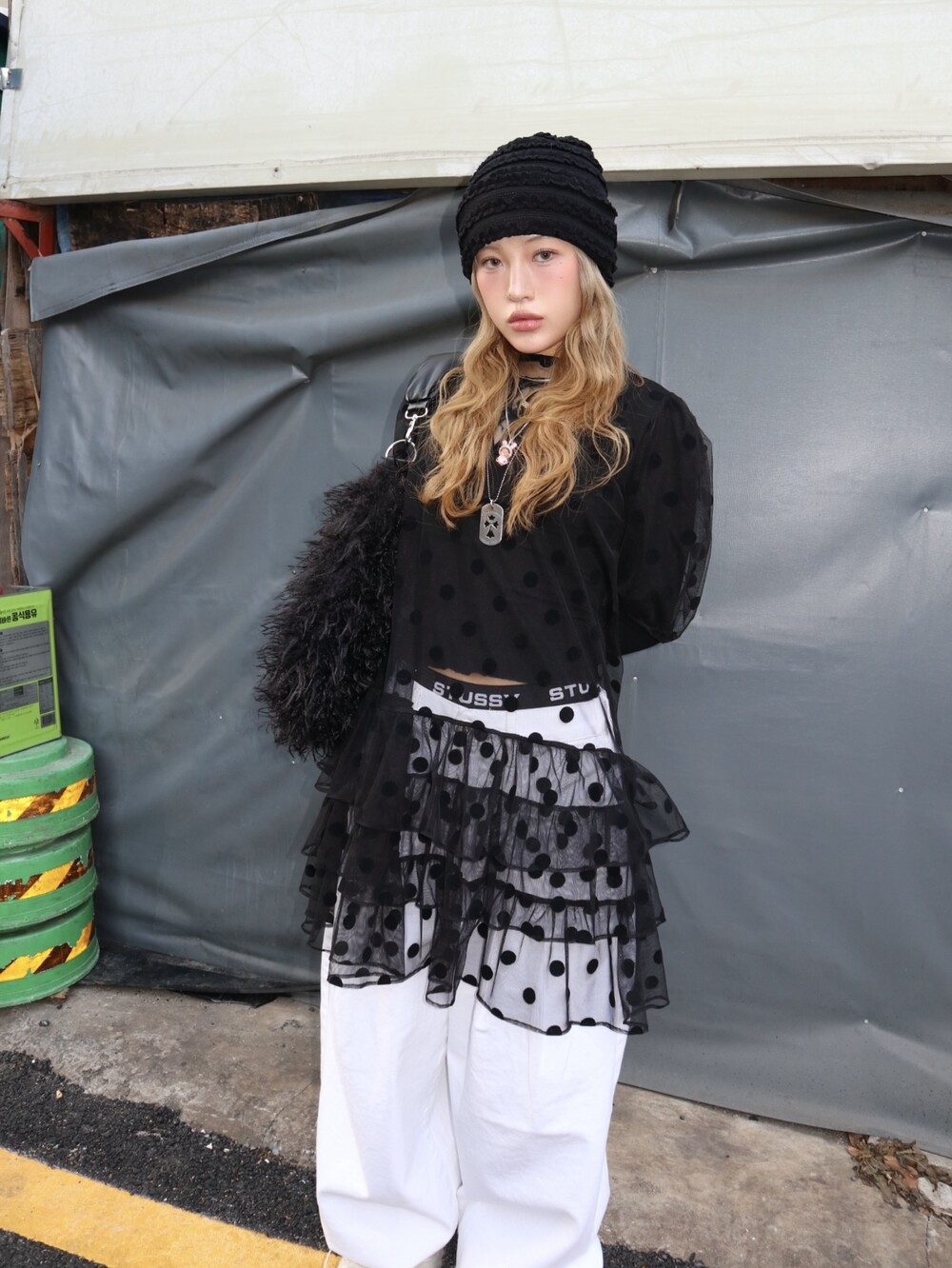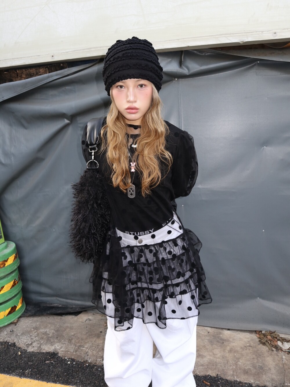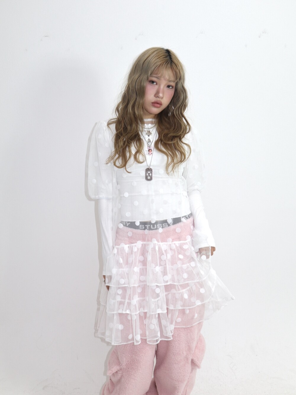 은은한 도트 패턴과 시스루 메쉬 소재가 어우러져 빈티지, 페미닌 무드를 연출합니다.