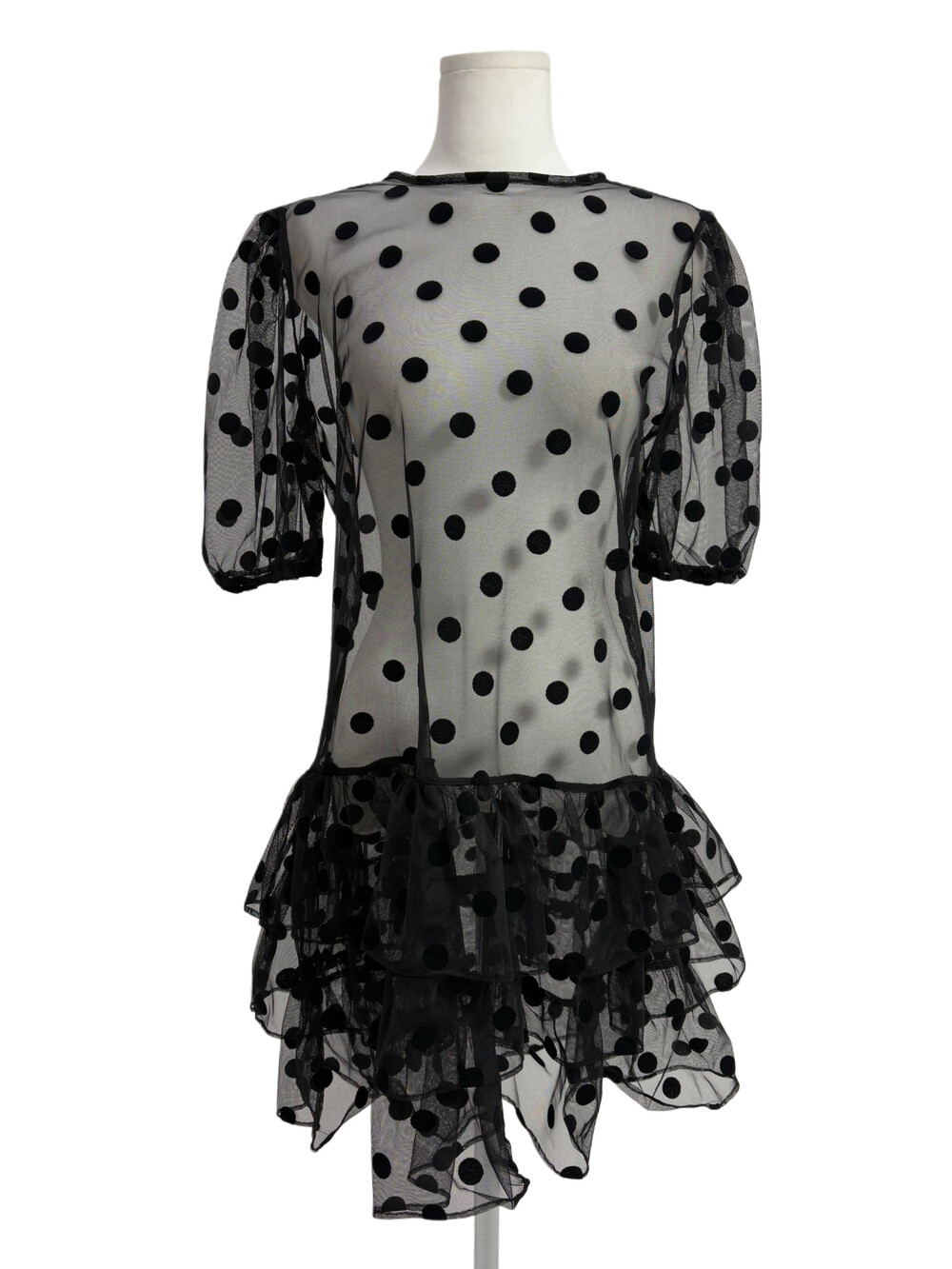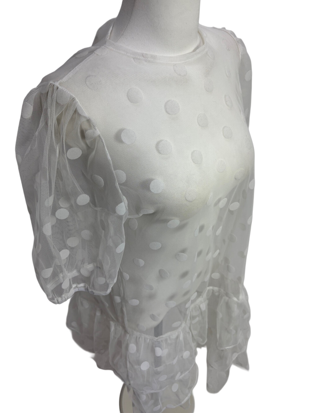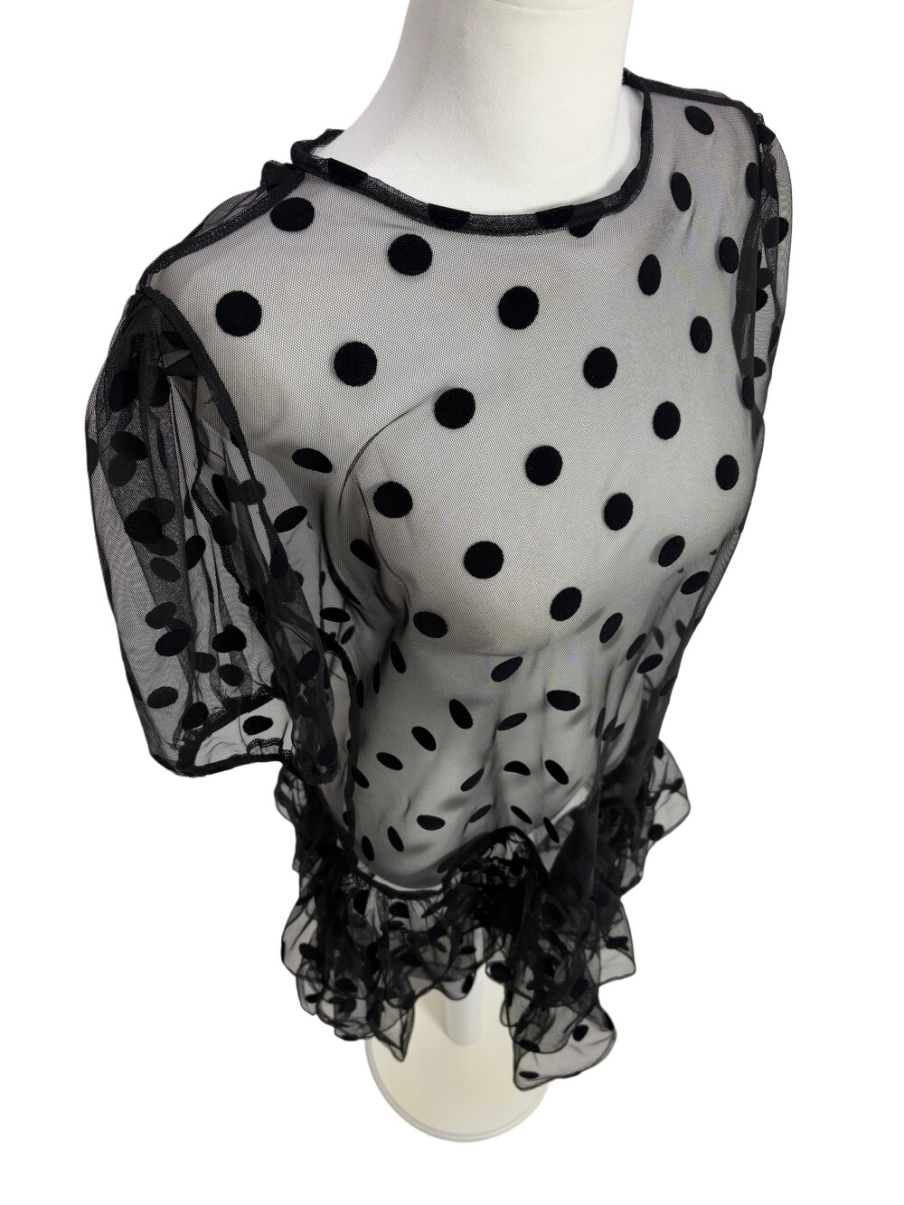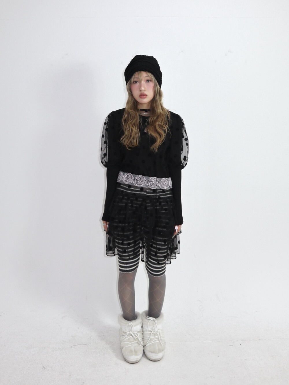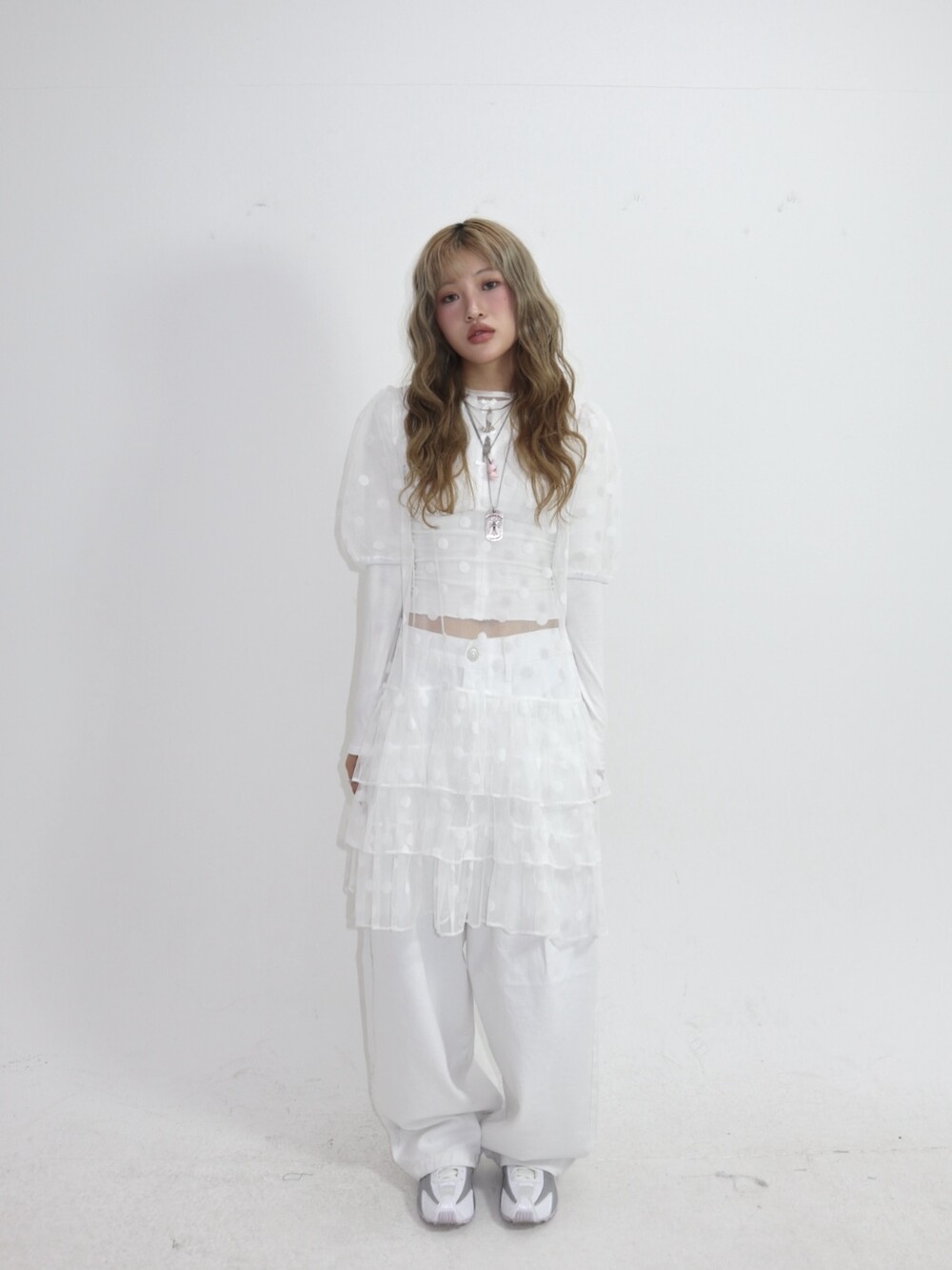 은은한 도트 패턴과 시스루 메쉬 소재가 어우러져 빈티지, 페미닌 무드를 연출합니다.