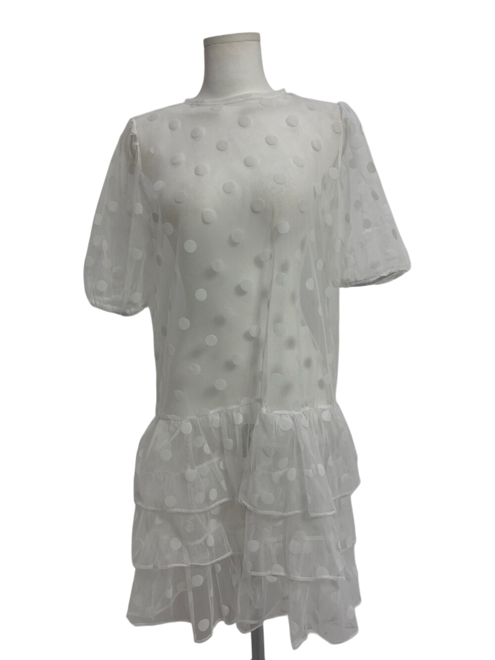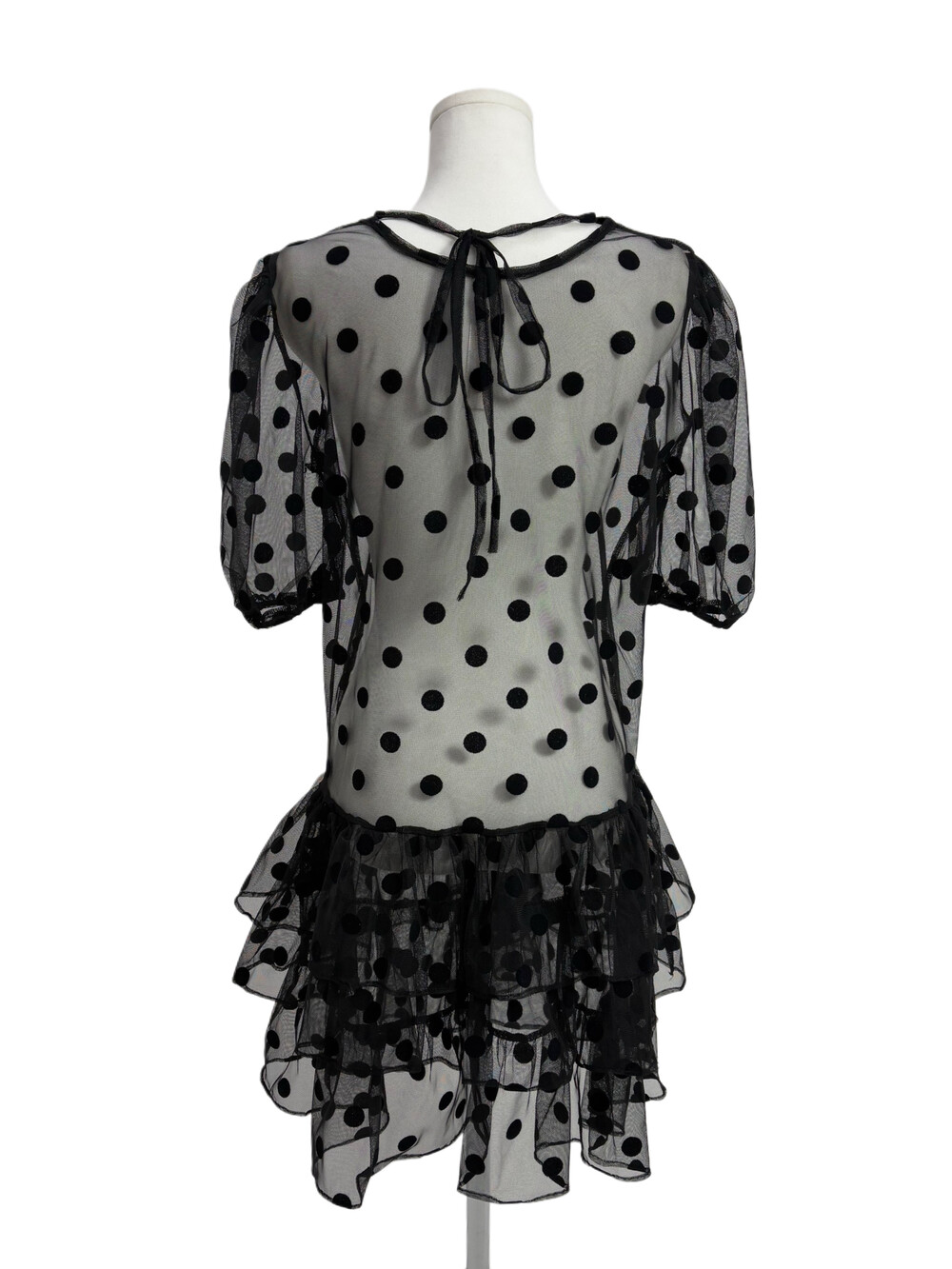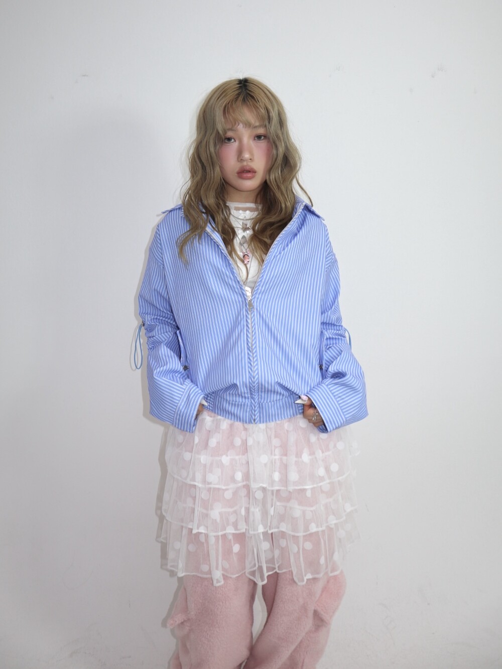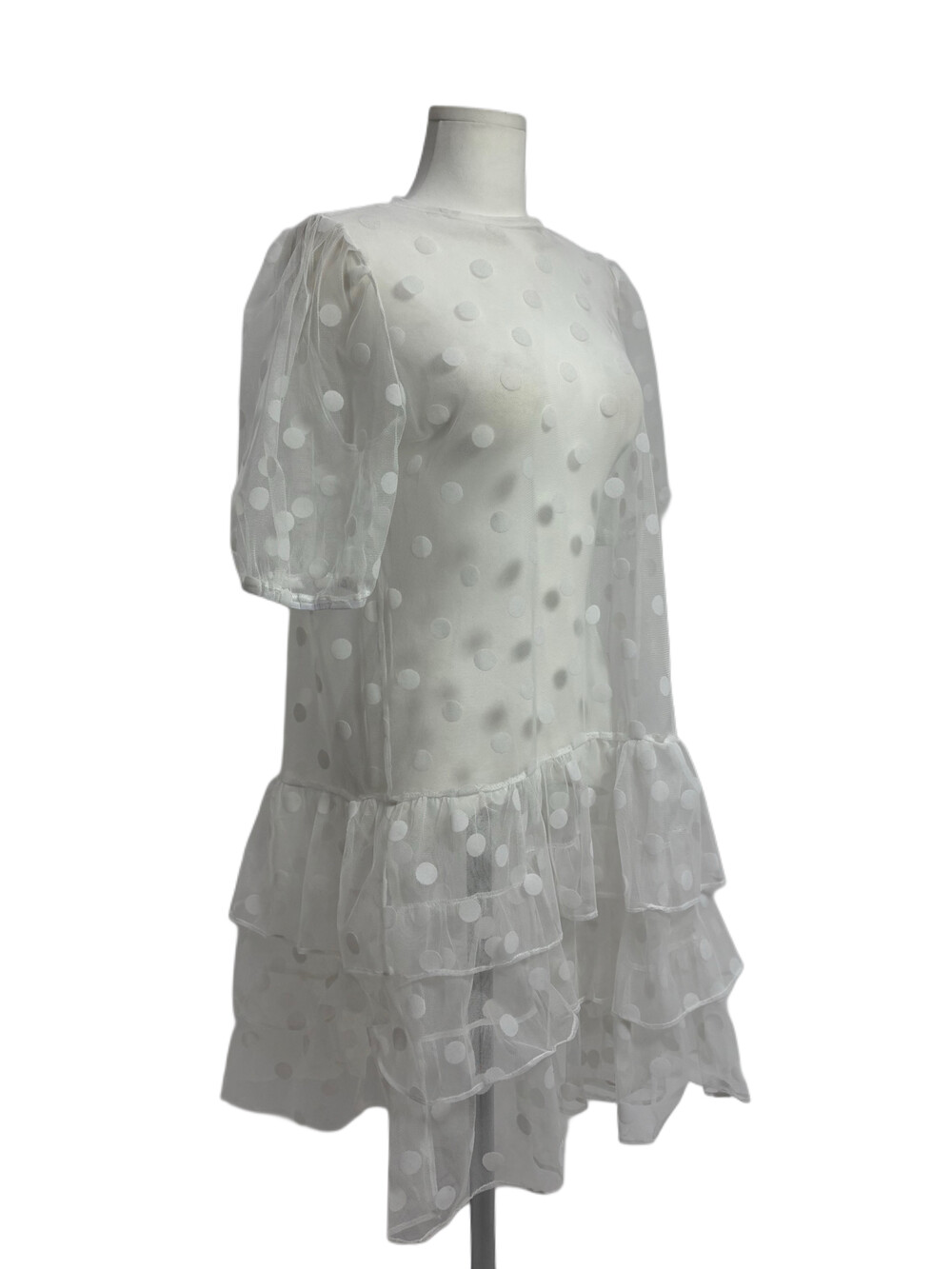 은은한 도트 패턴과 시스루 메쉬 소재가 어우러져 빈티지, 페미닌 무드를 연출합니다.