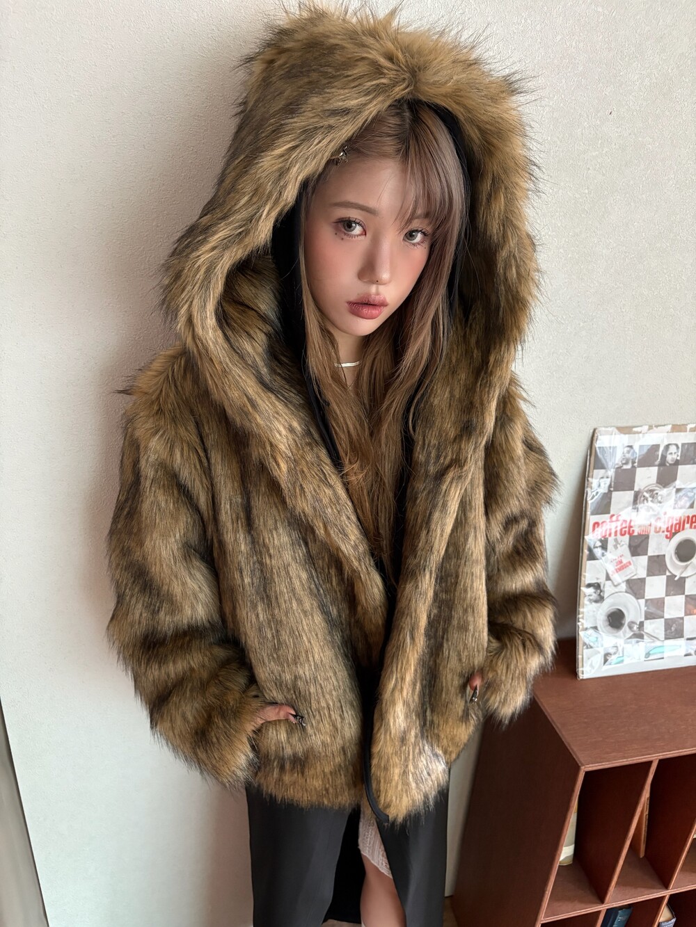 브라운 블랙 믹스 컬러의 퍼 자켓