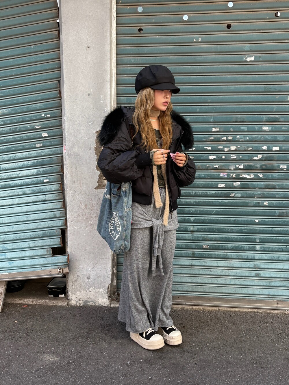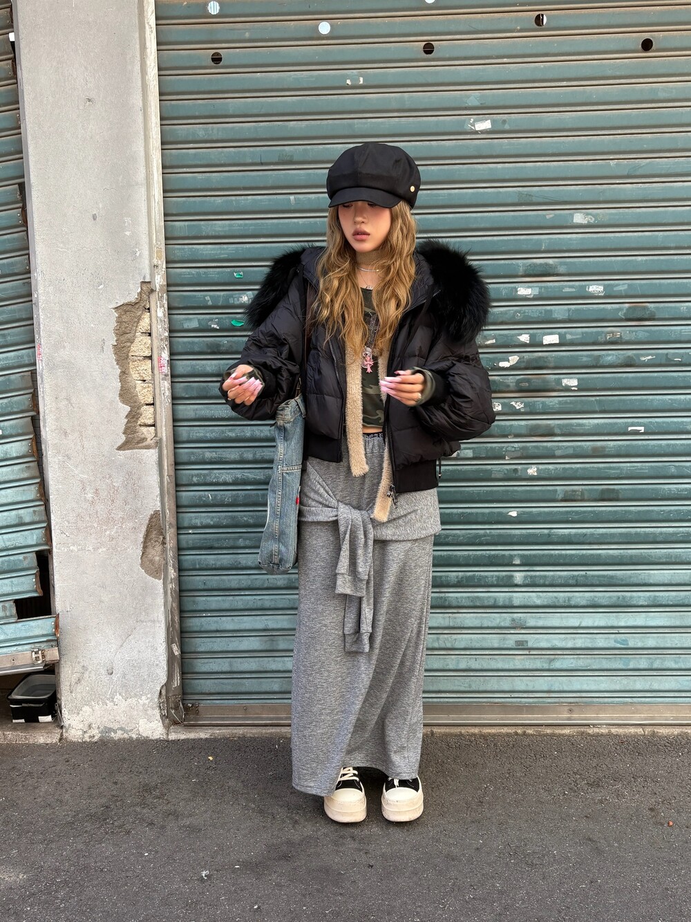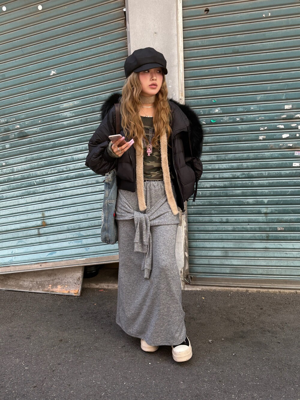 후드를 두른 듯한 독특한 디자인 디테일이 돋보이며, 맥시한 기장감으로 멋스러운 실루엣의 스커트 소개드려요 :)