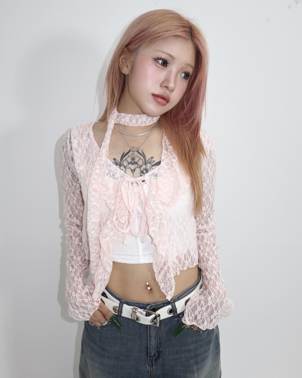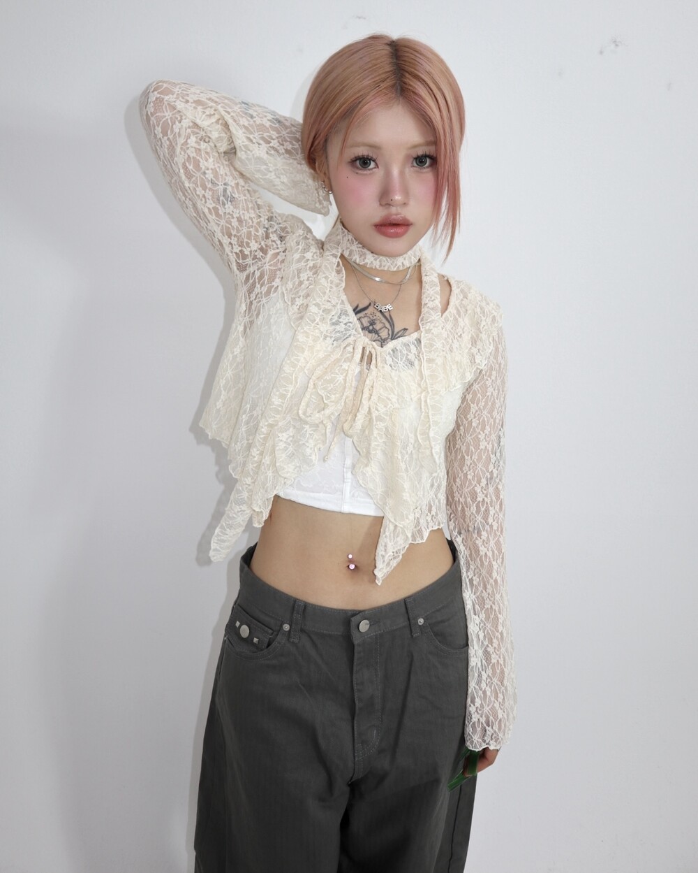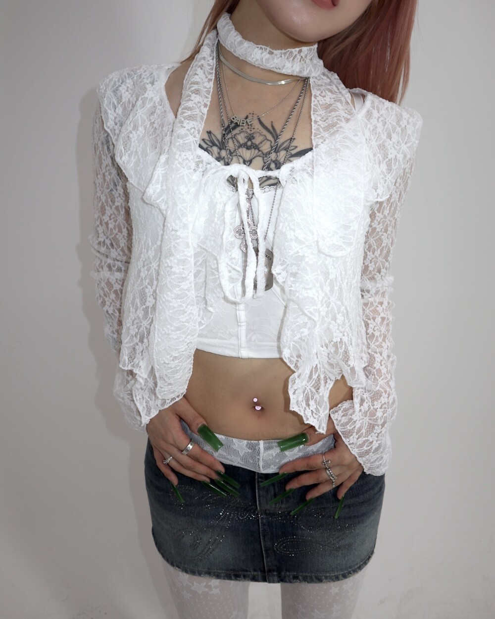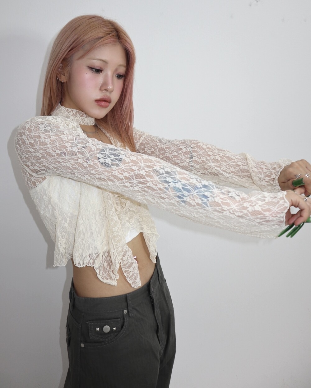 은은한 플라워 레이스와 러플 카라 디테일이 포인트인