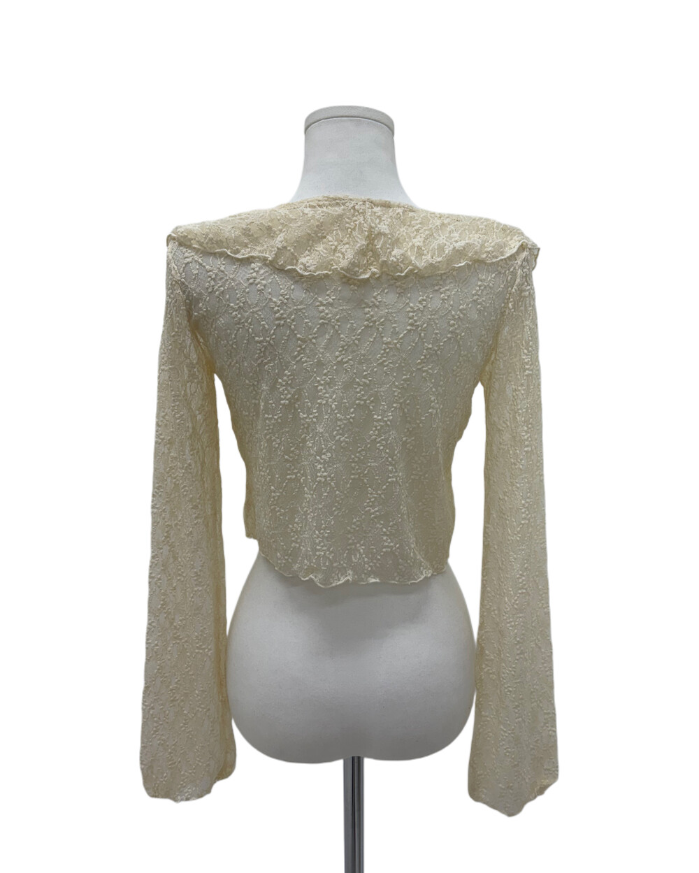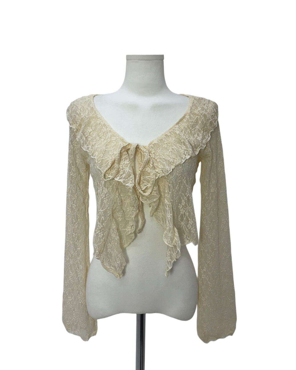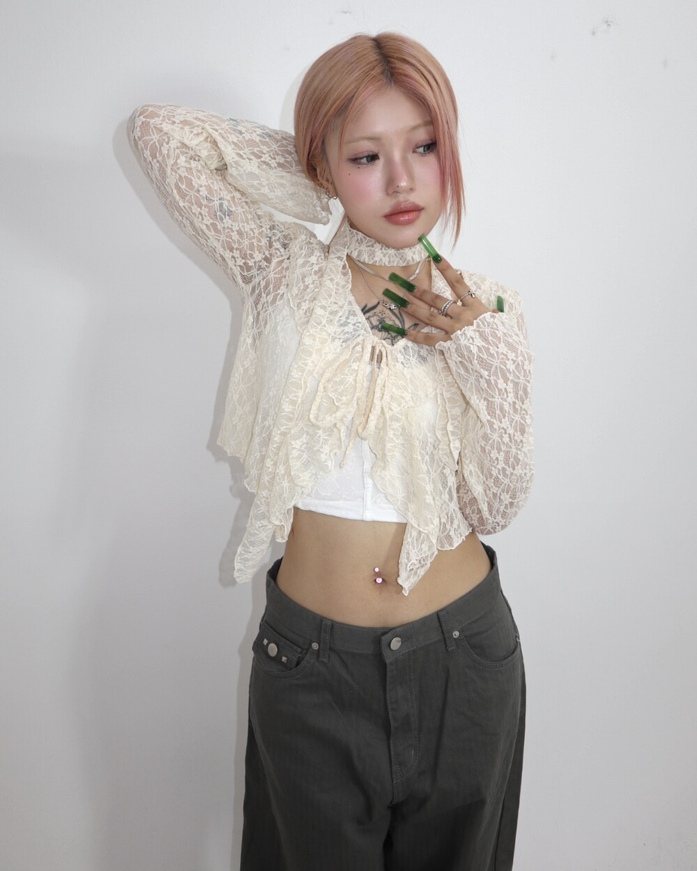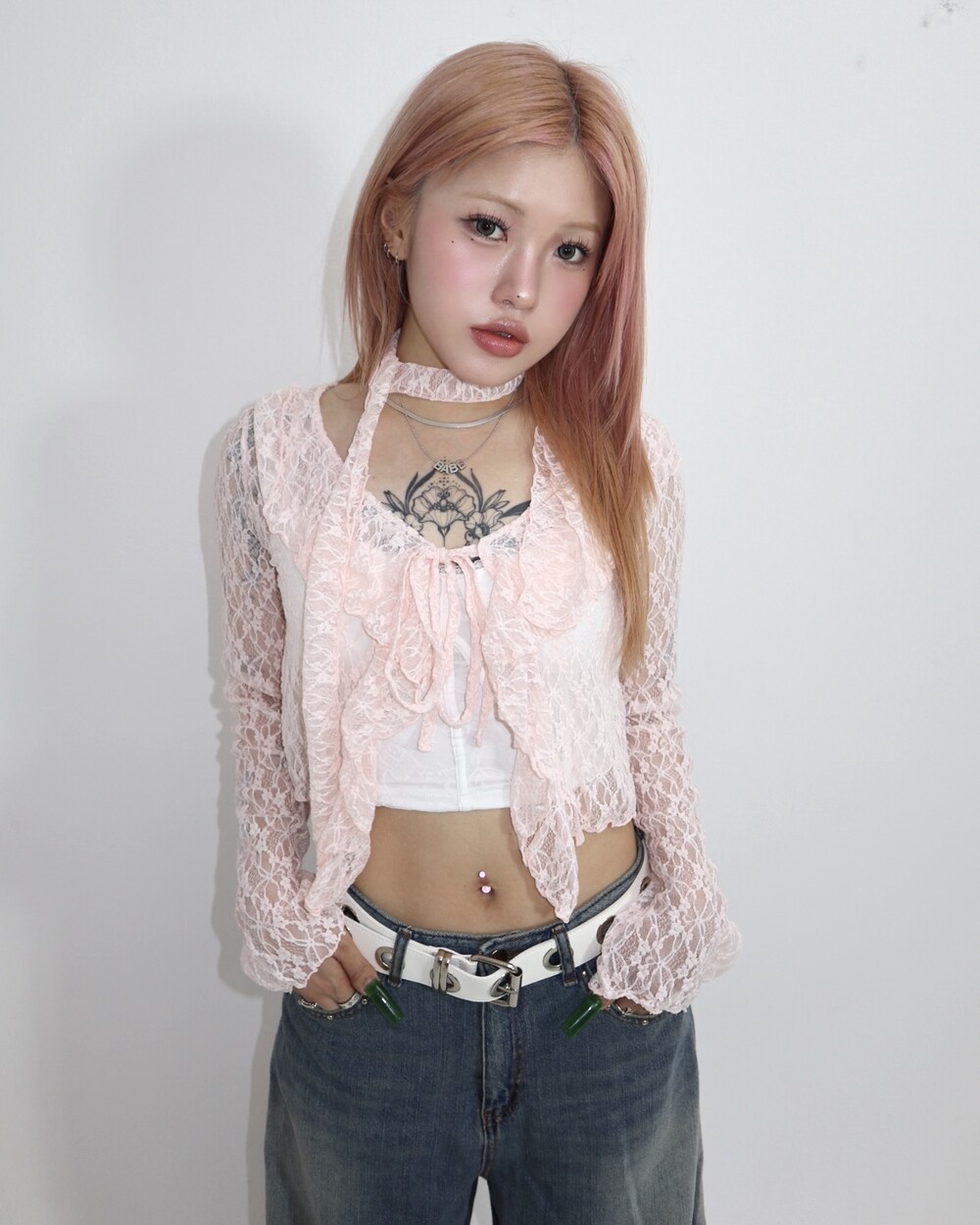 은은한 플라워 레이스와 러플 카라 디테일이 포인트인