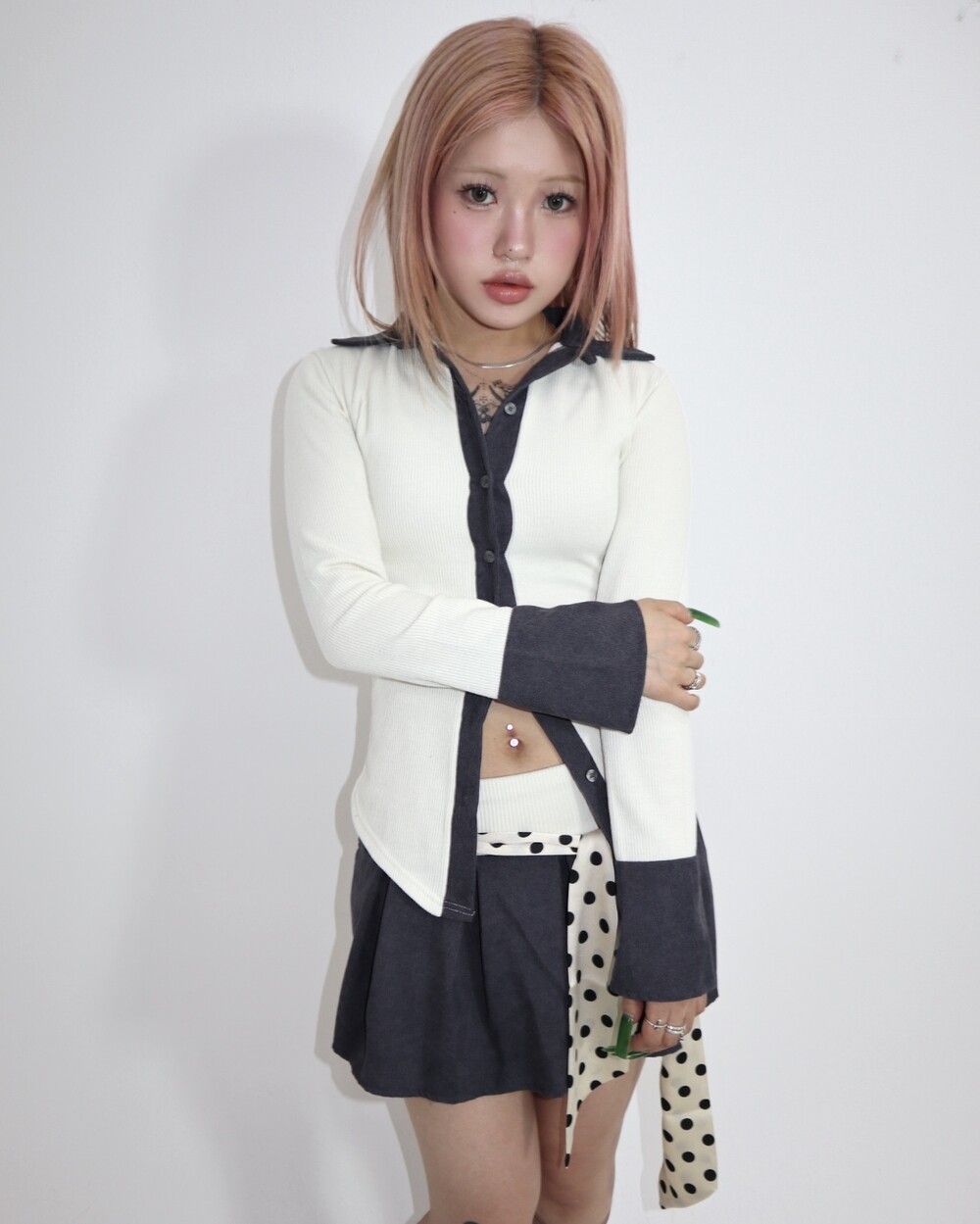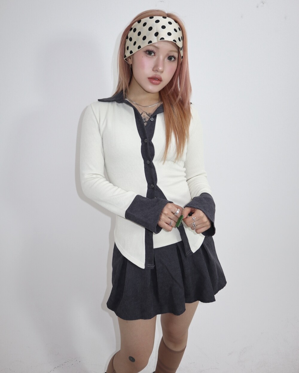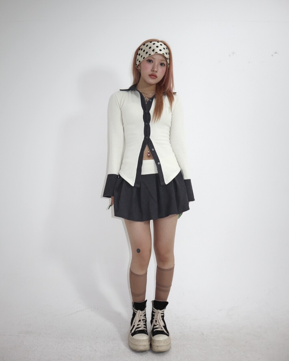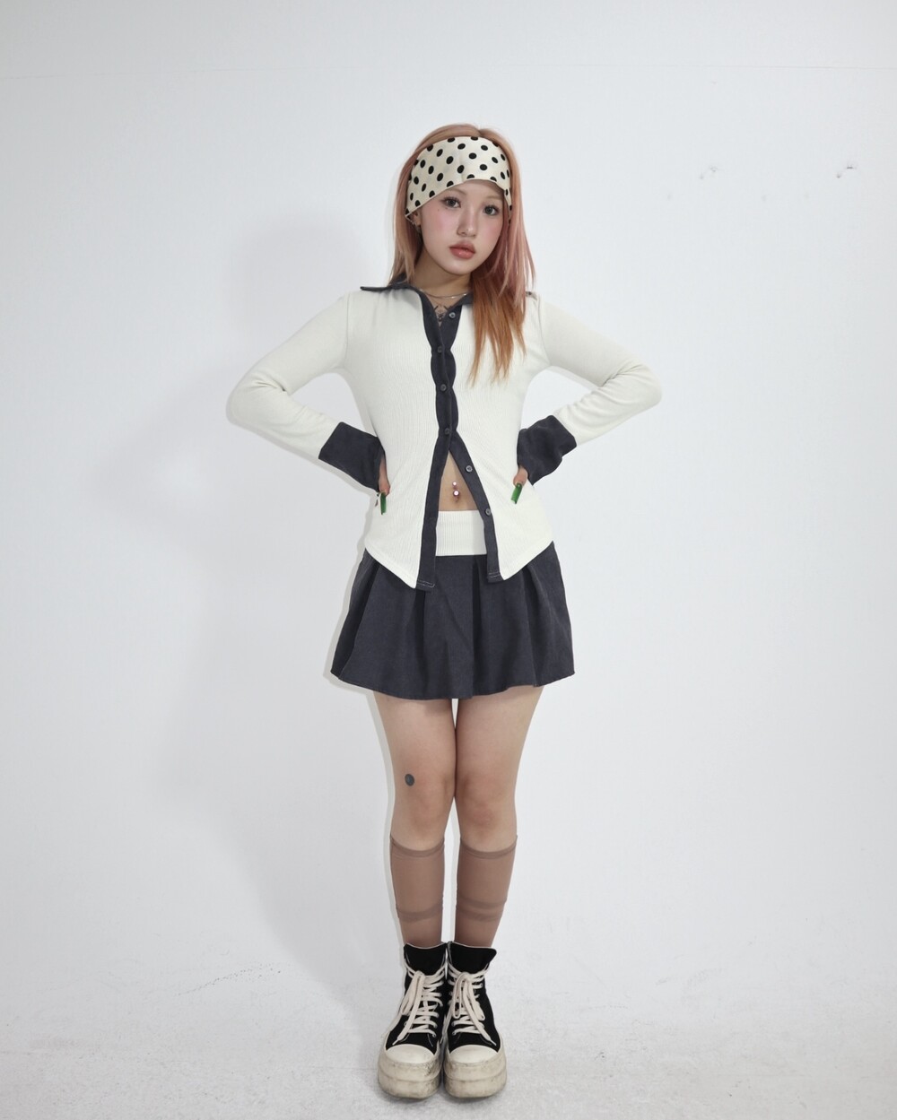 배색 컬러 디테일이 돋보이는 감각적인 디자인의 카라 가디건 + 스커트 팬츠 셋업 소개해드려요.