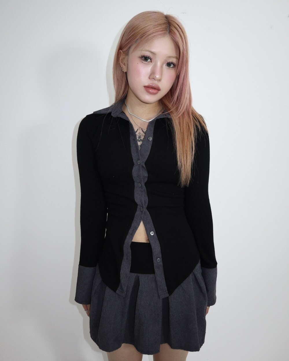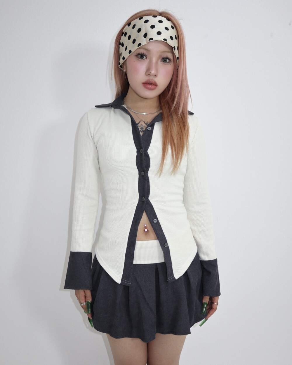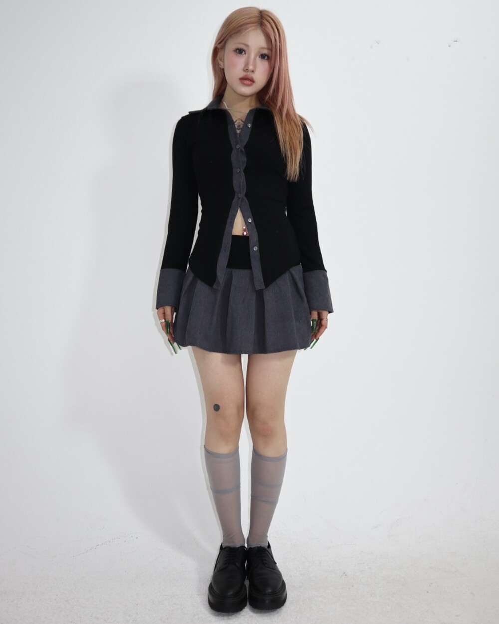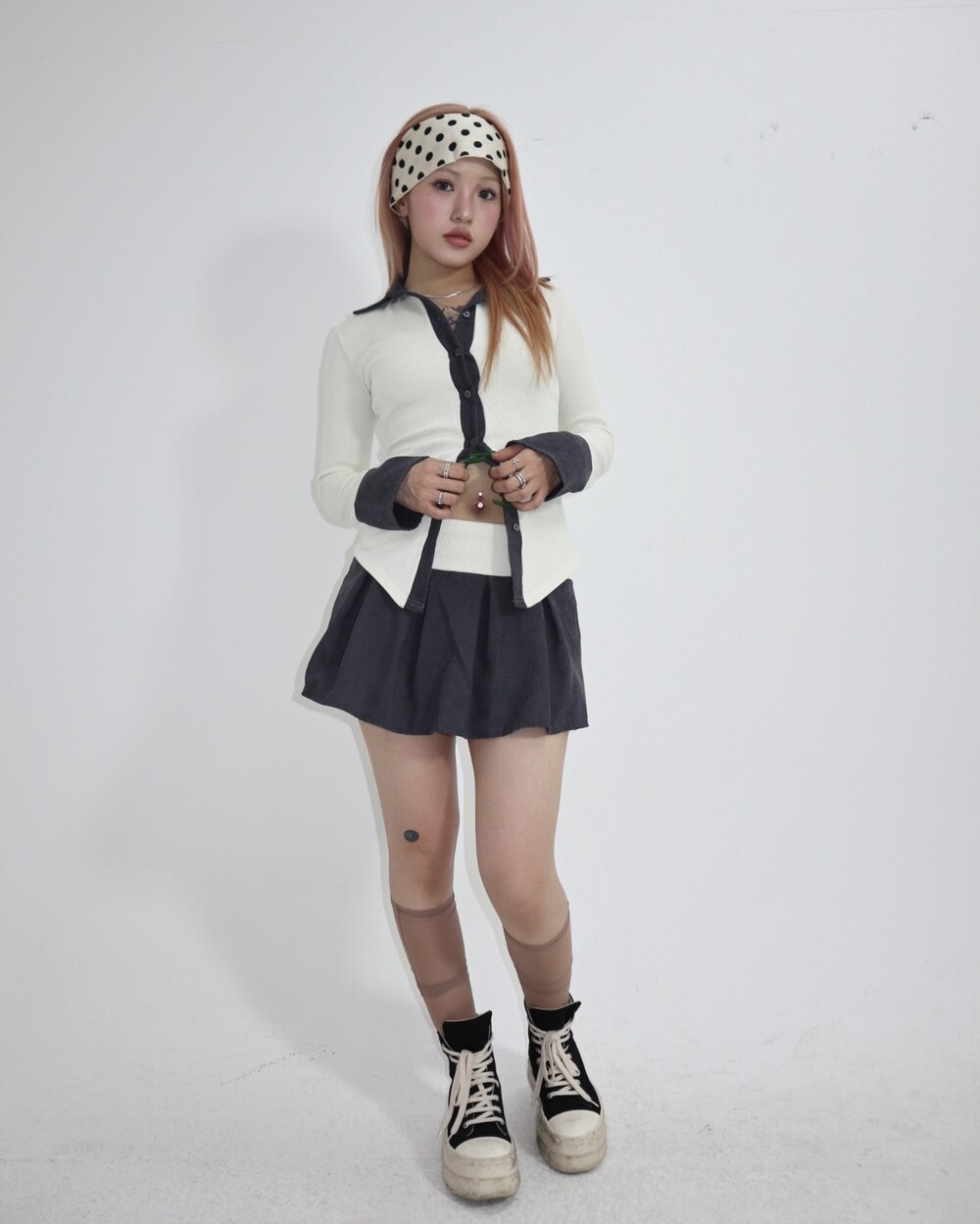 배색 컬러 디테일이 돋보이는 감각적인 디자인의 카라 가디건 + 스커트 팬츠 셋업 소개해드려요.