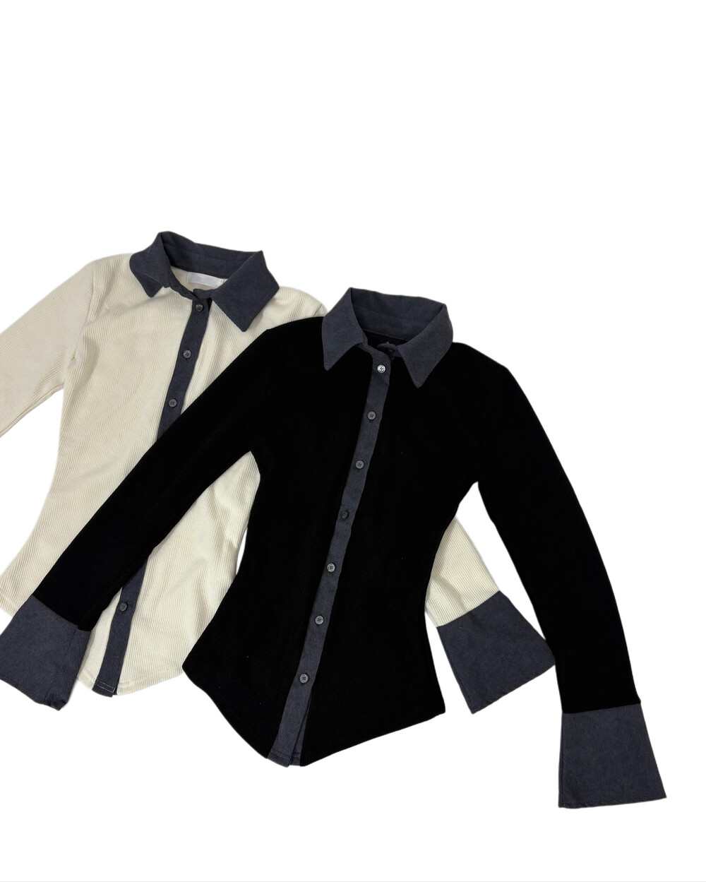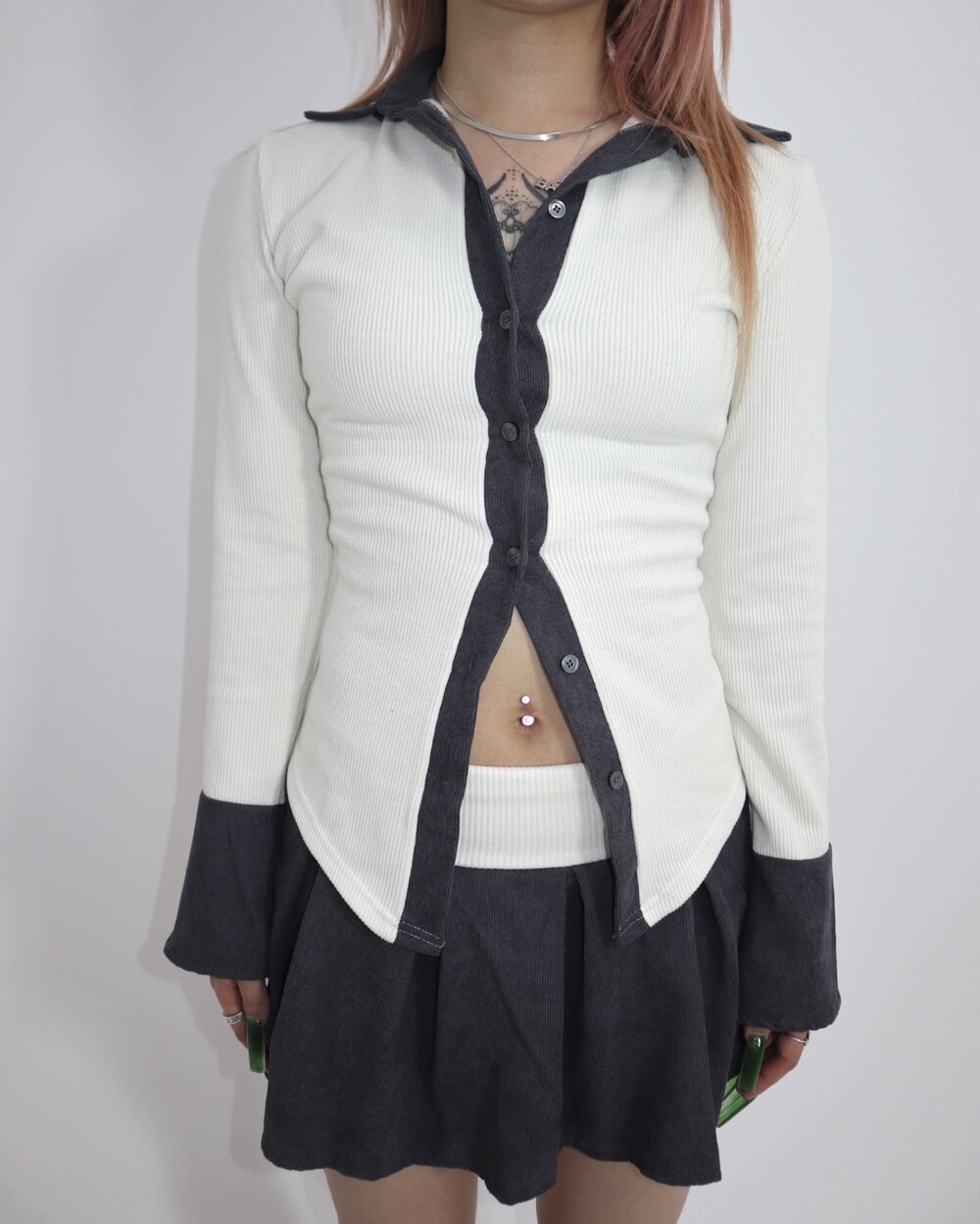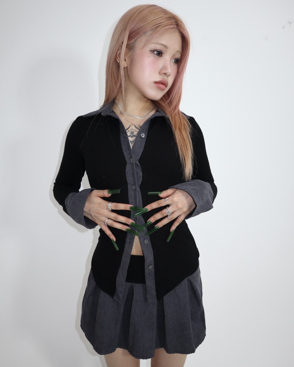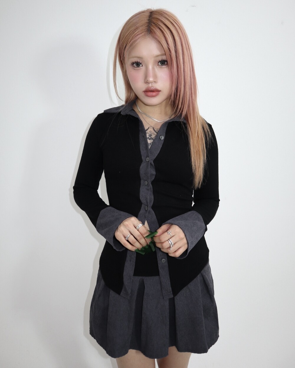 배색 컬러 디테일이 돋보이는 감각적인 디자인의 카라 가디건 + 스커트 팬츠 셋업 소개해드려요.