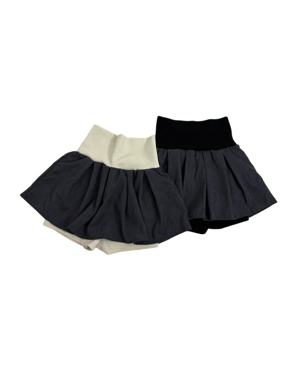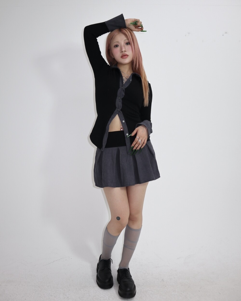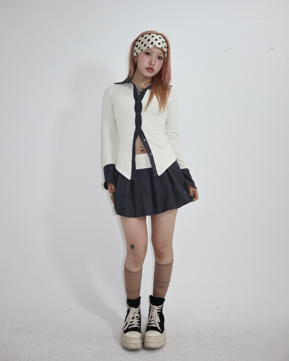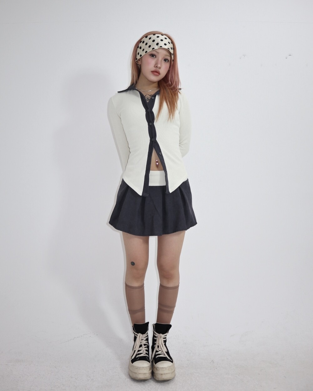 스커트는 허리 배색 디테일이 라인을 잘 잡아줘 슬림한 핏을 만들어줘요.