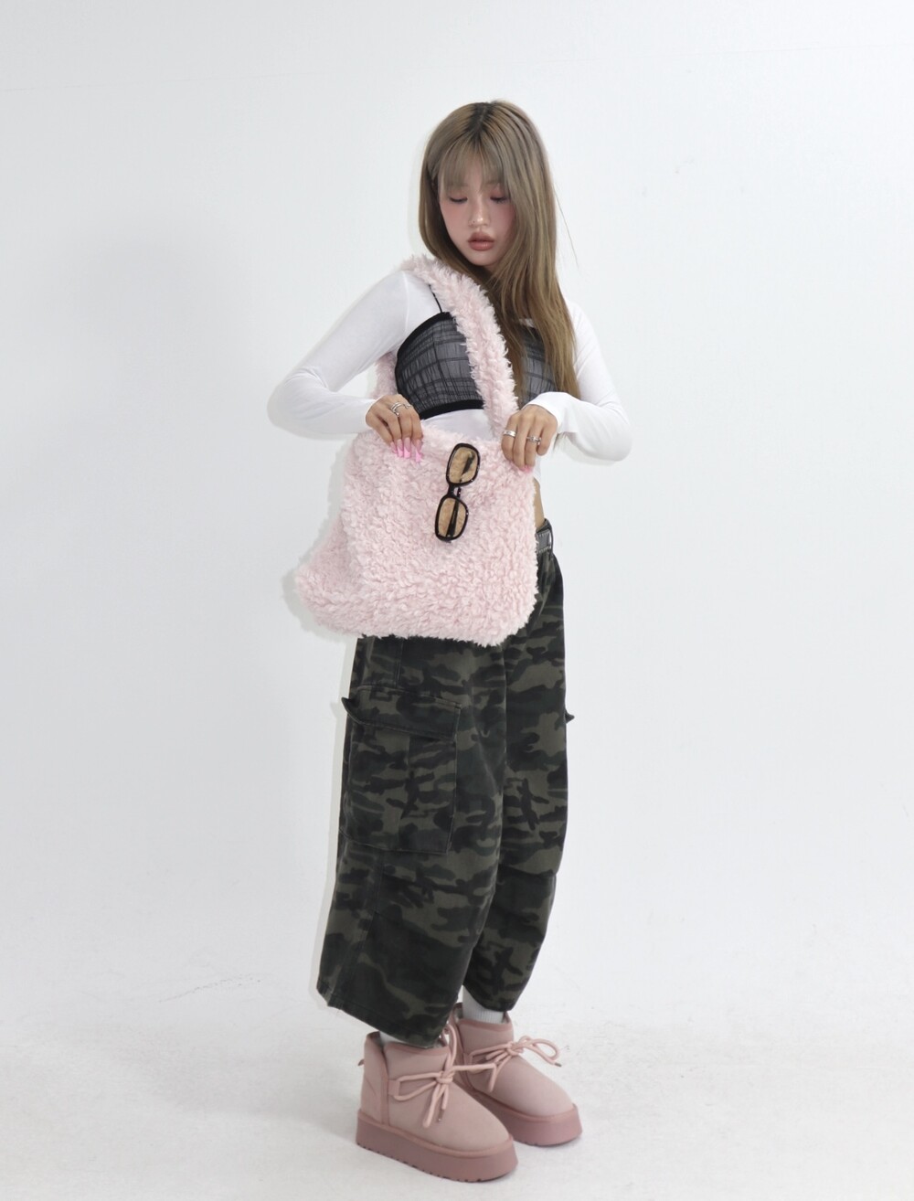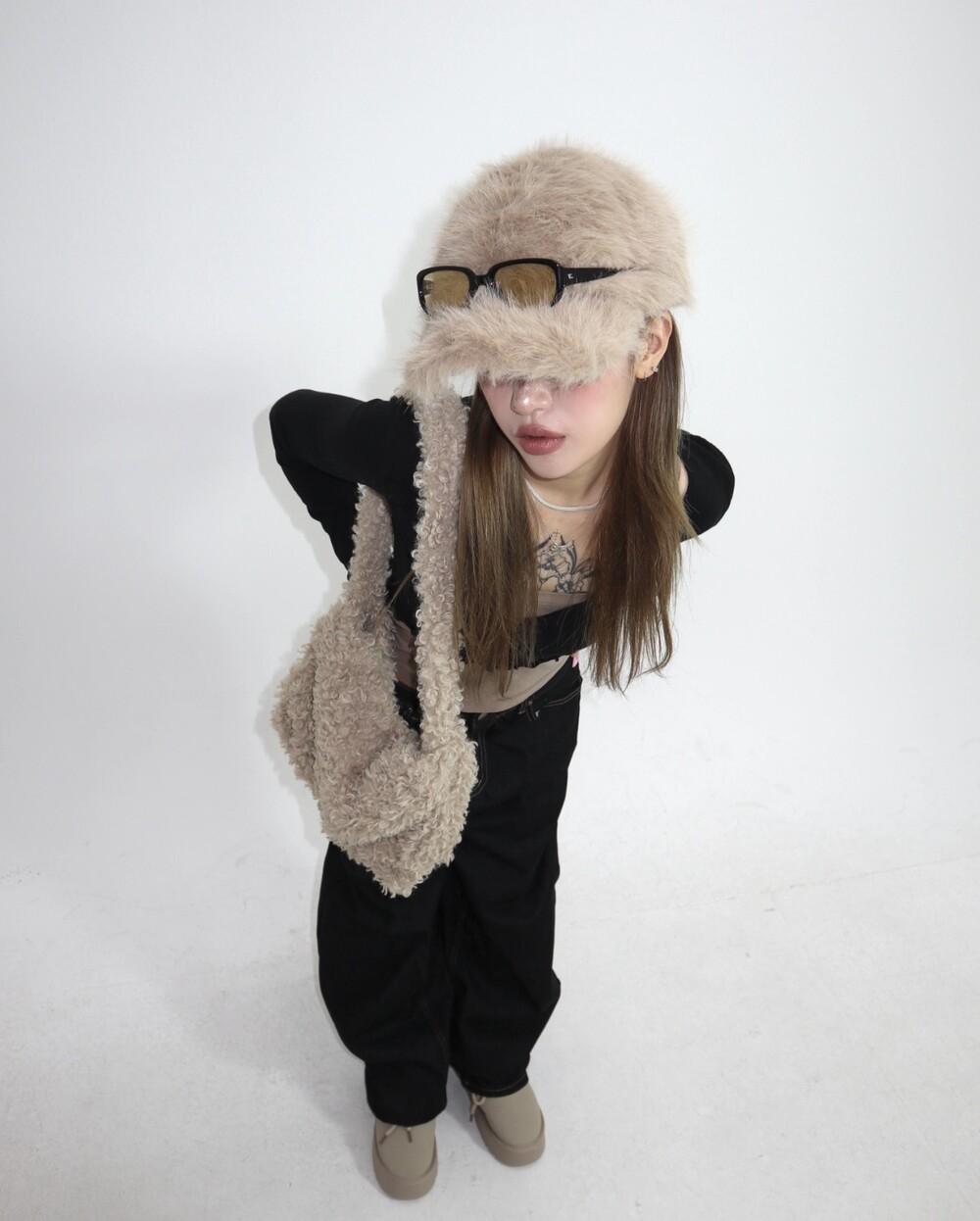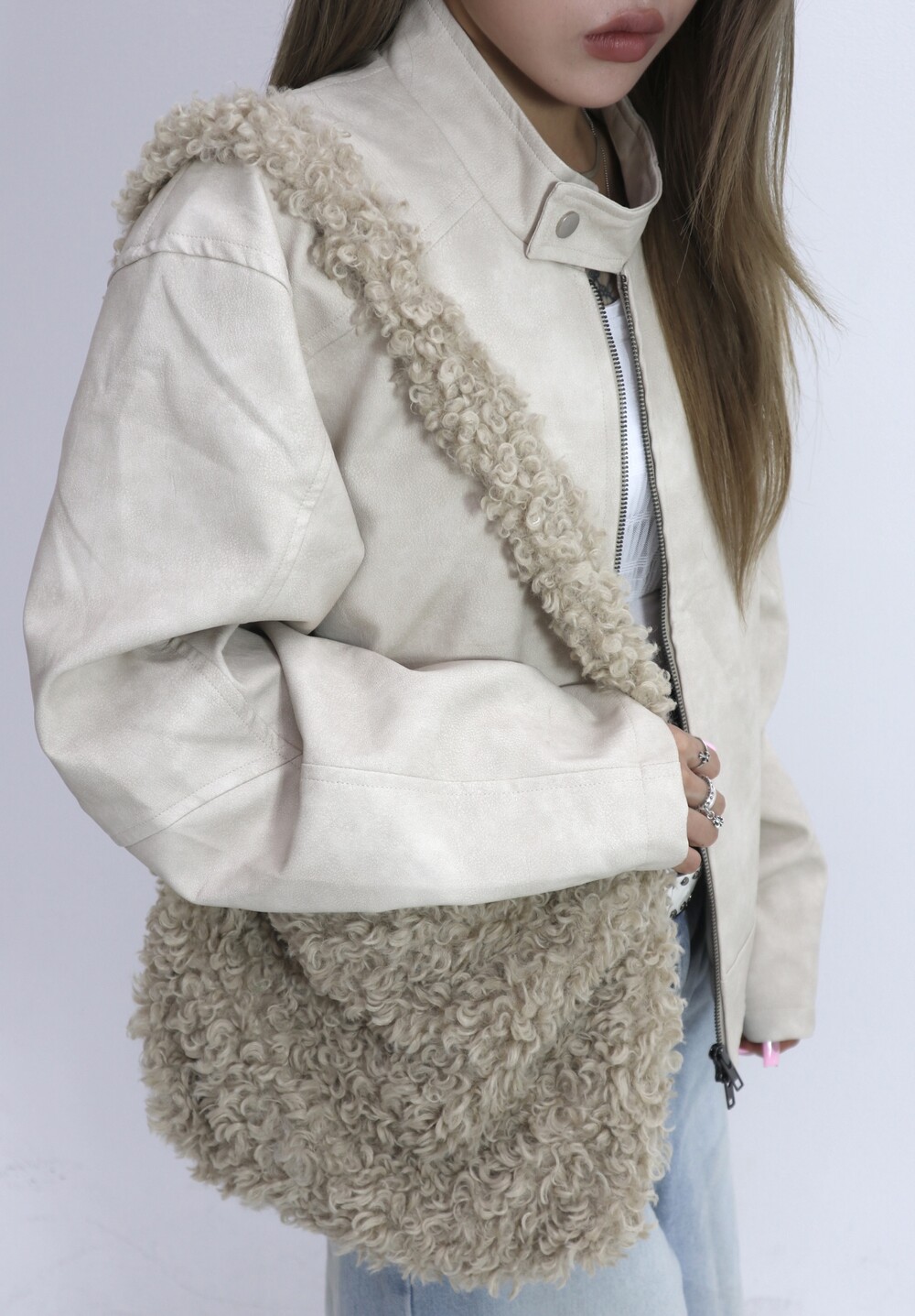 부드러운 퍼 텍스처가 겨울 스타일링에 따뜻한 매력을 더해주며,