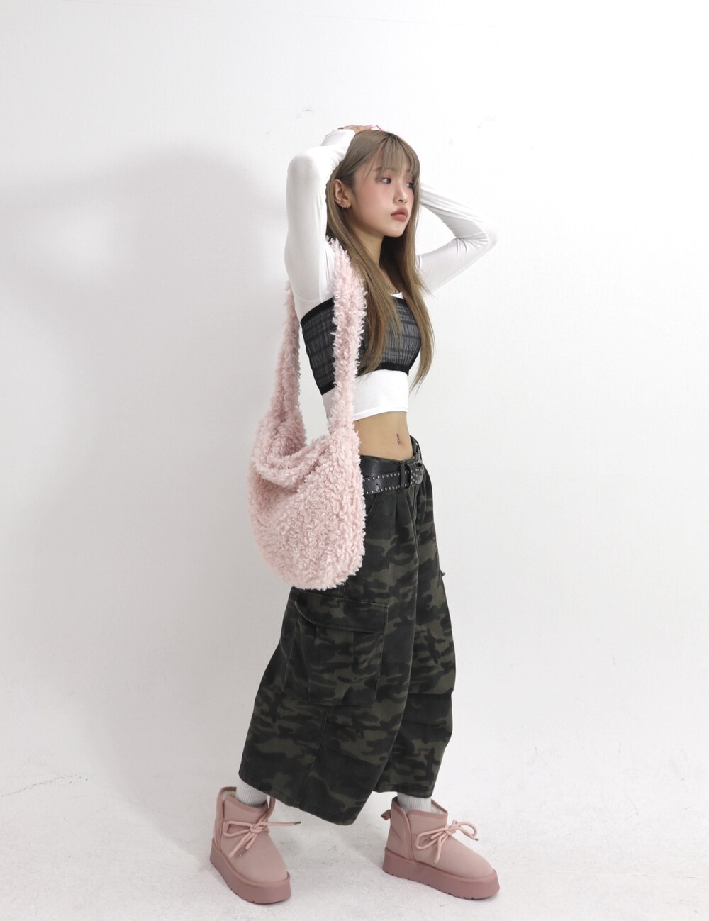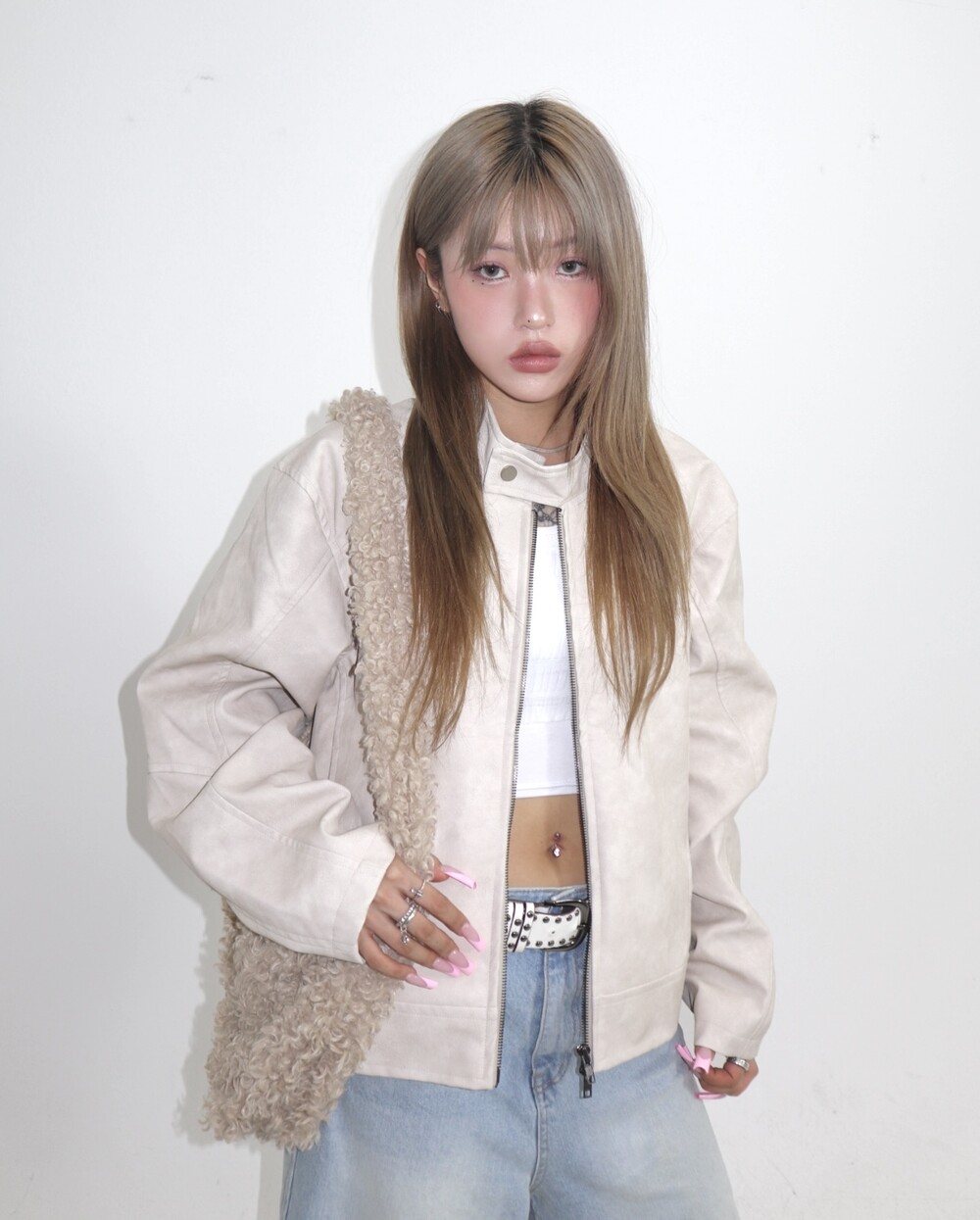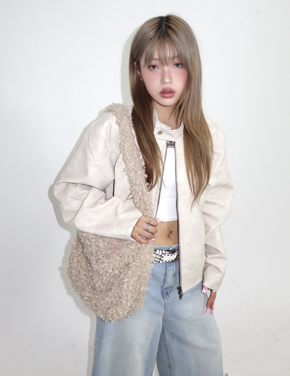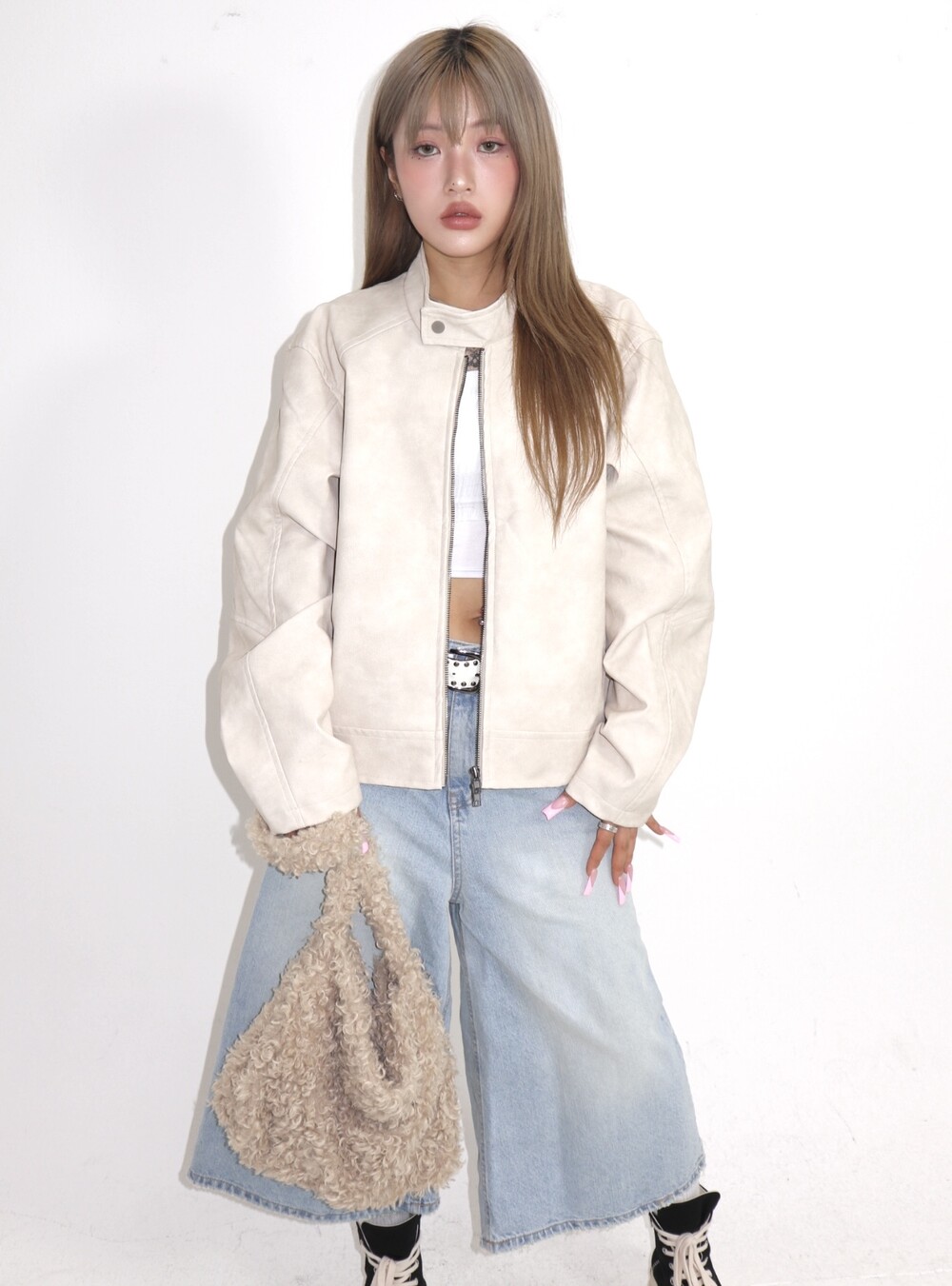 부드러운 퍼 텍스처가 겨울 스타일링에 따뜻한 매력을 더해주며,