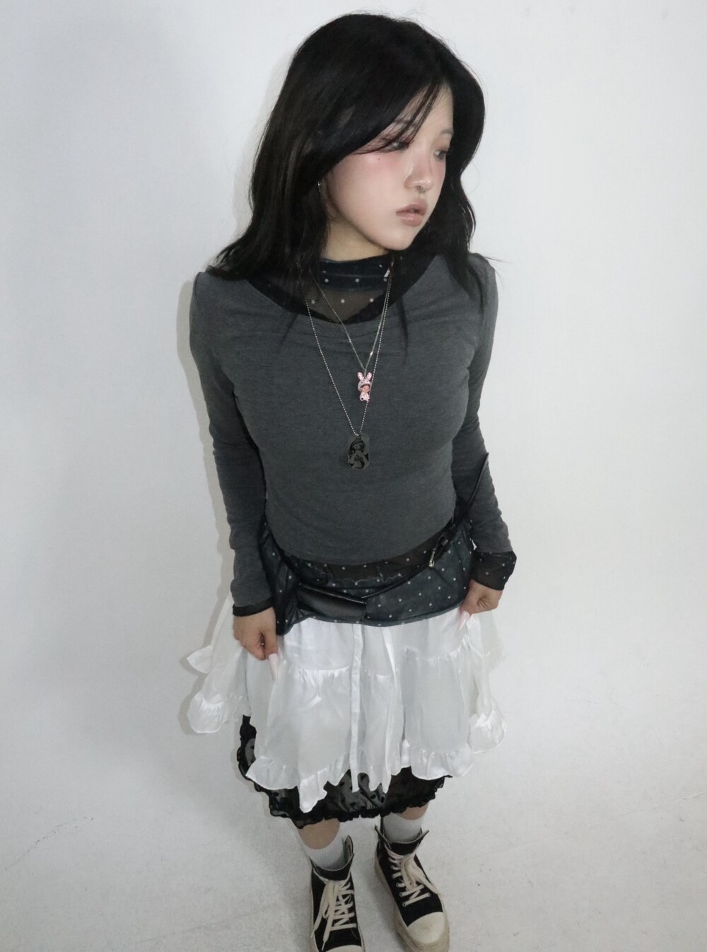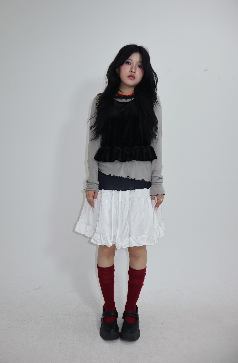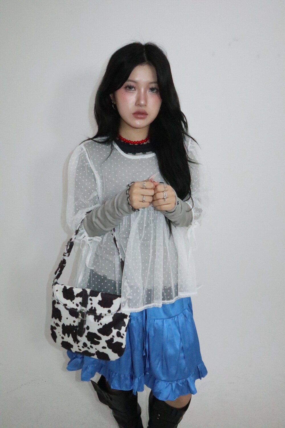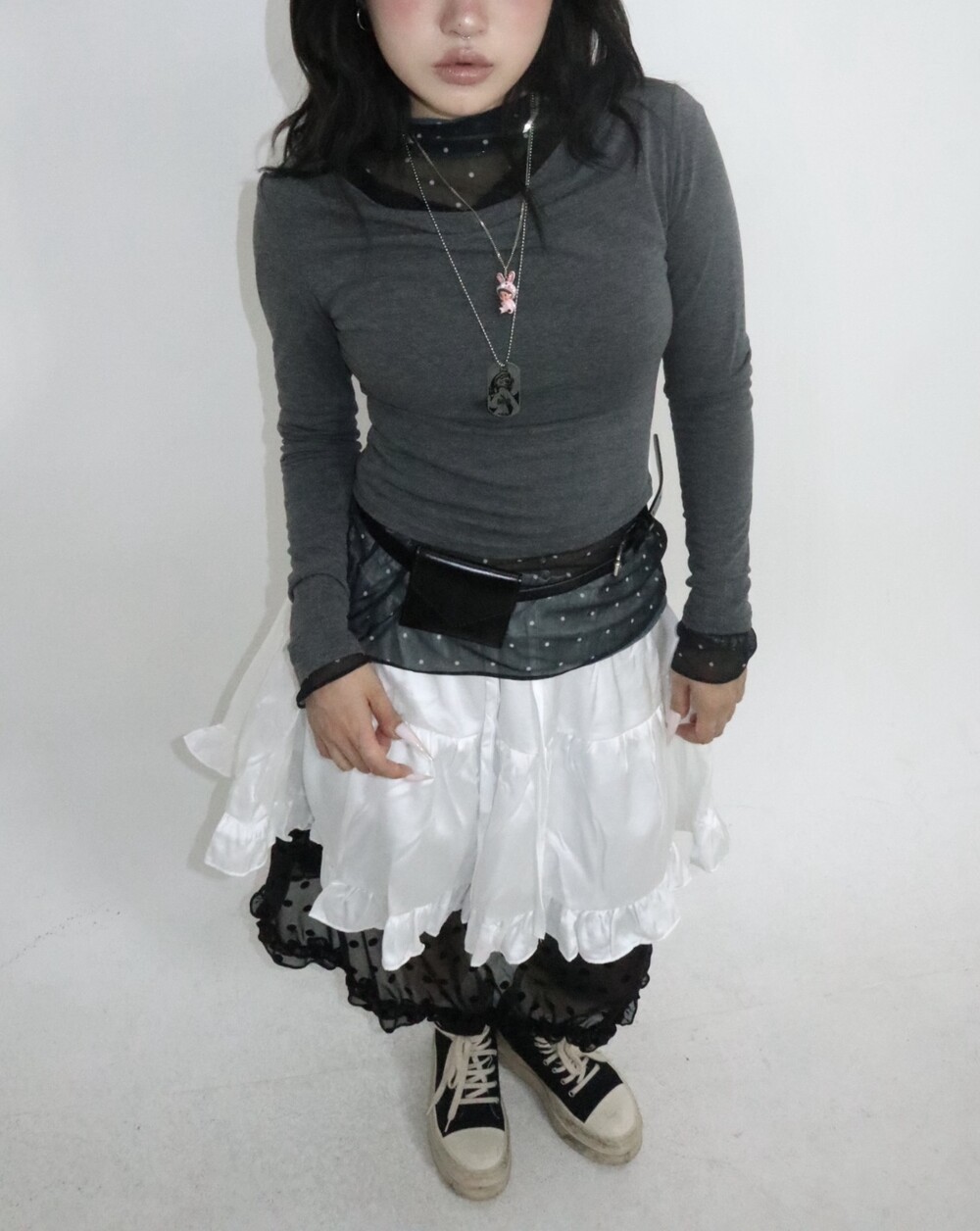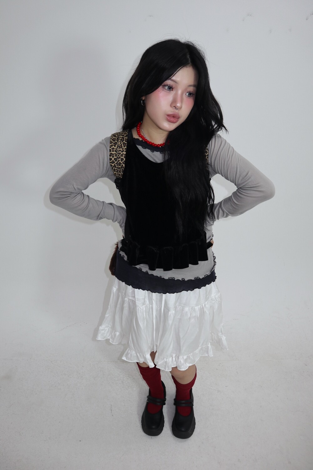 은은하게 빛나는 새틴 소재에 프릴 캉캉 디테일을 더해,