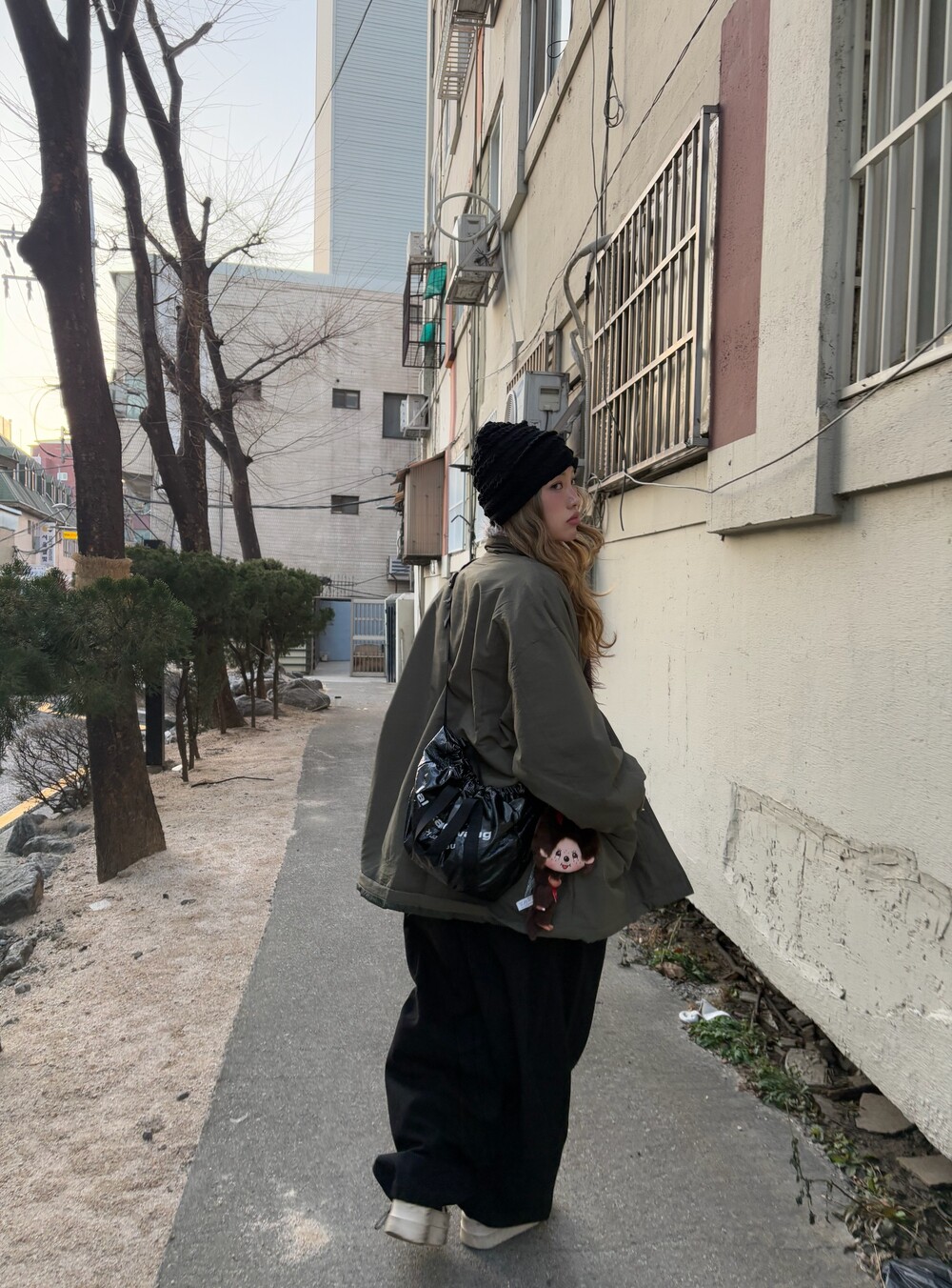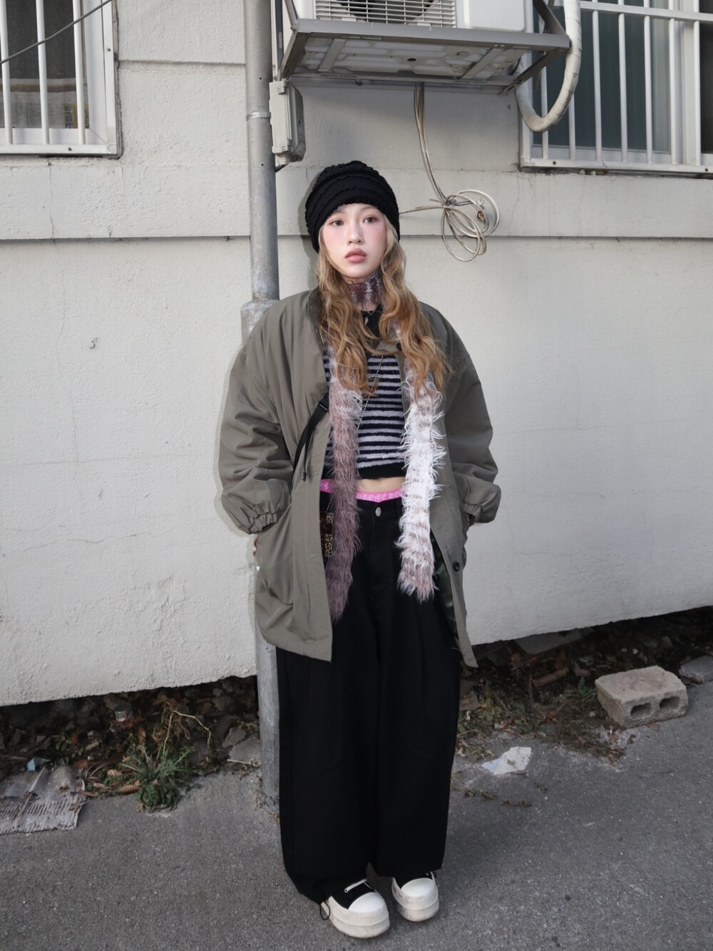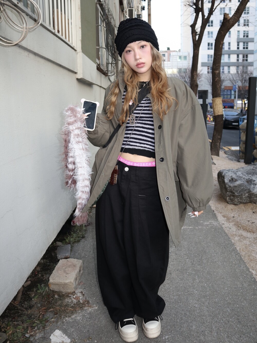 밑단에 스트링이 있어 핏을 조절할 수 있어 다양한 스타일링이 가능하답니다.