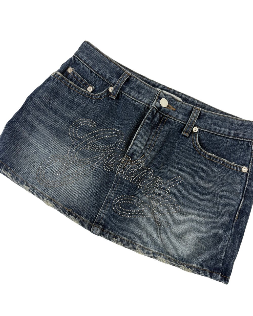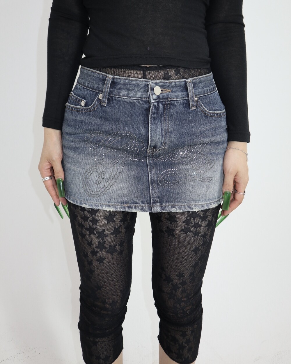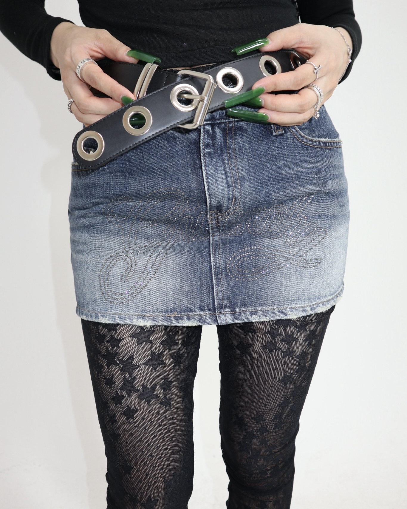 Y2K 무드를 제대로 담아낸 큐빅 레터링 포인트의 데님 미니스커트 소개드려요.
