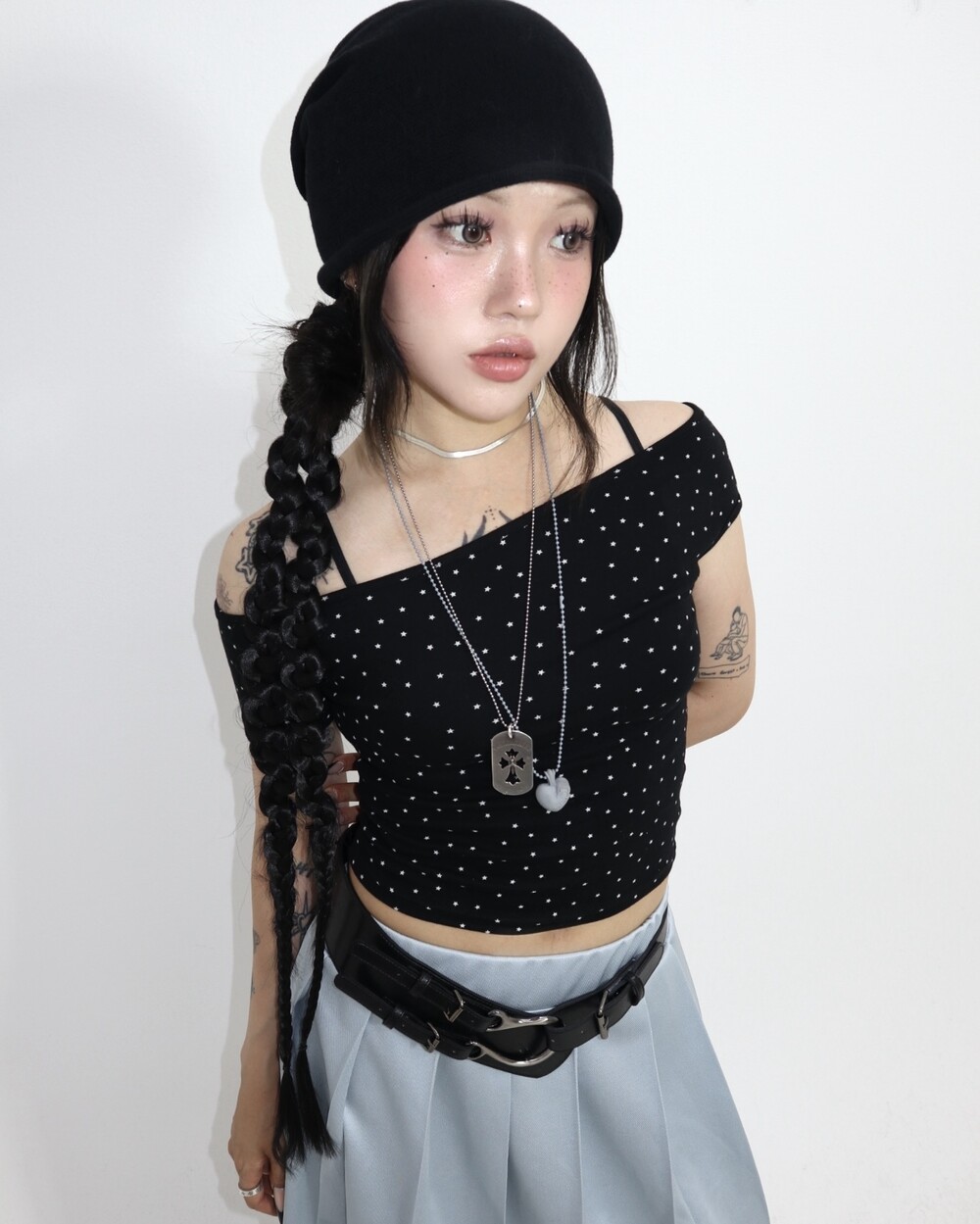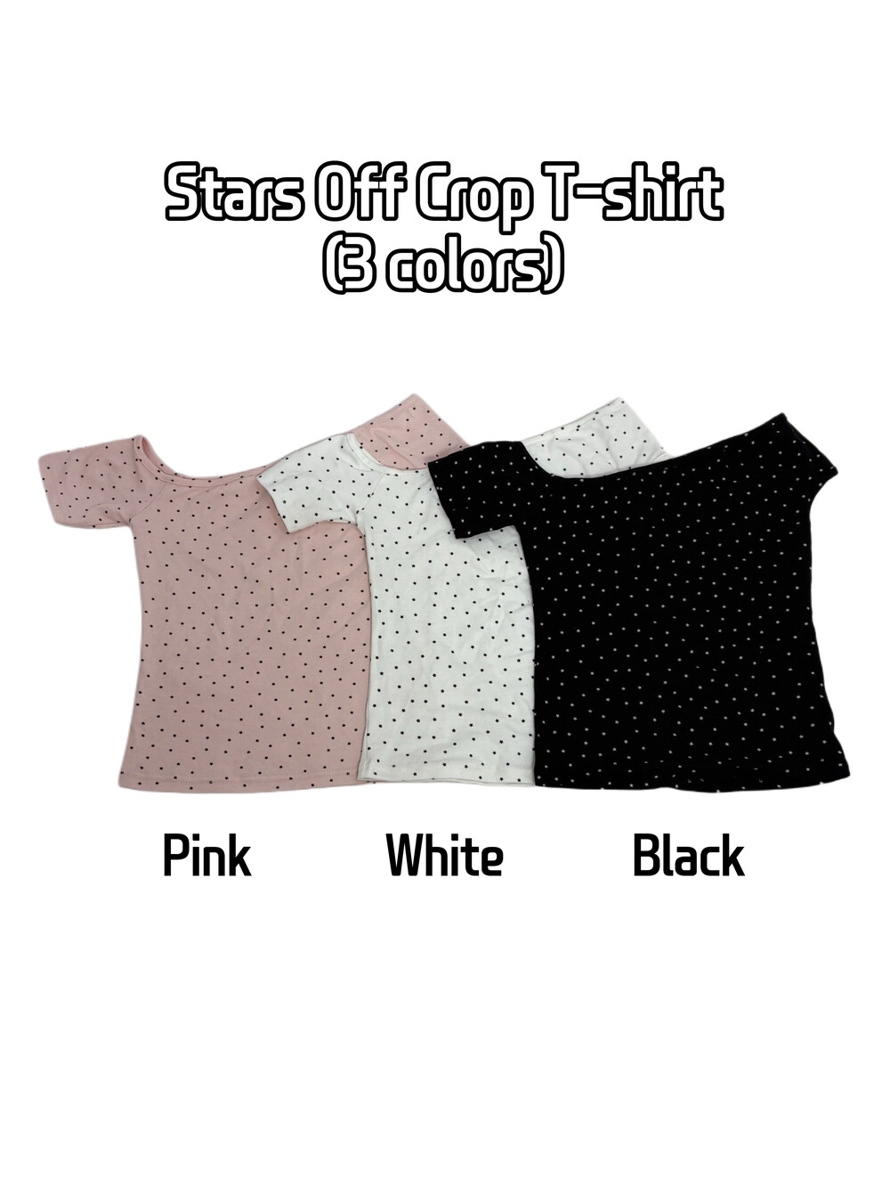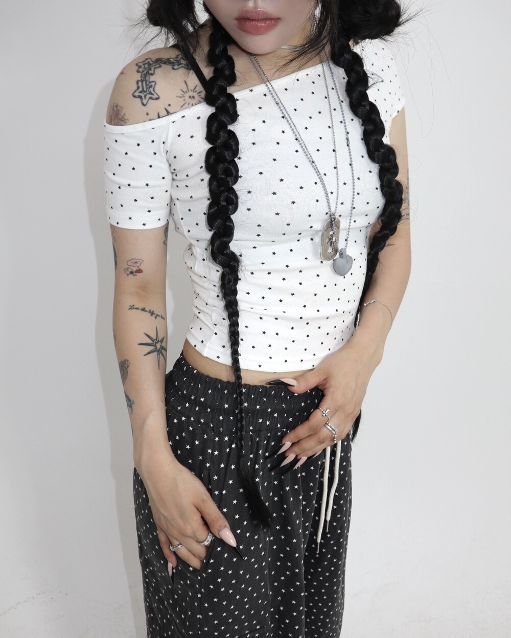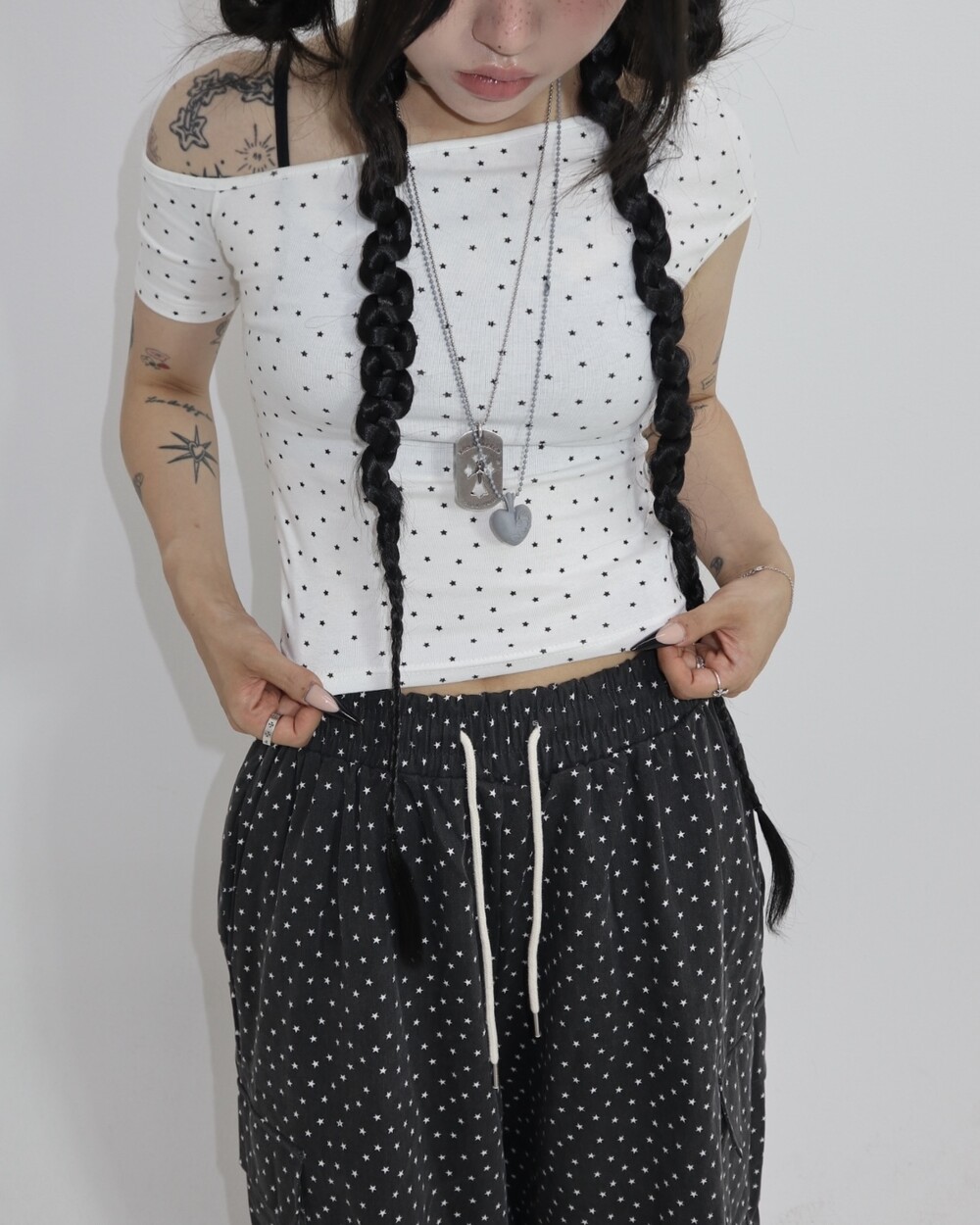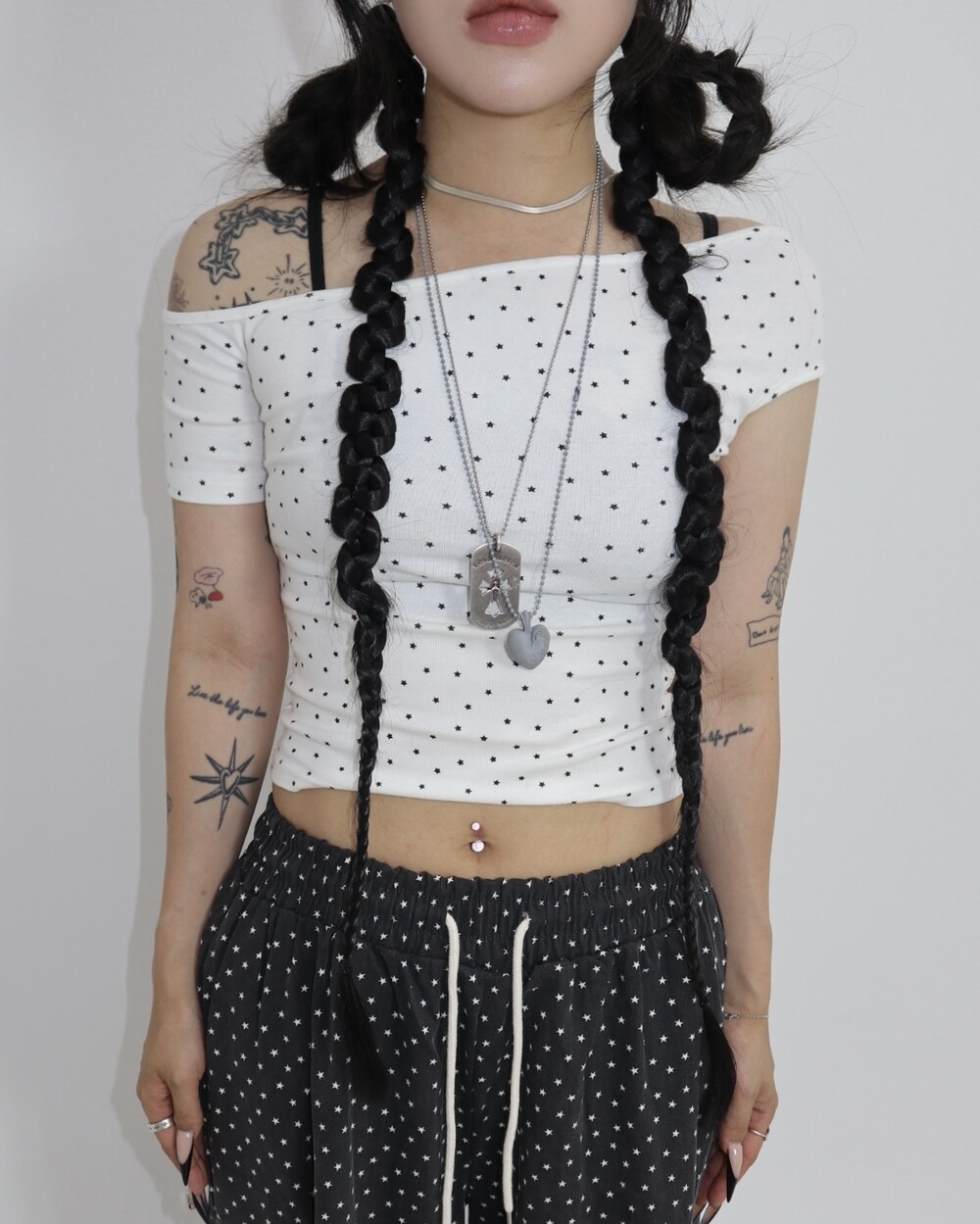 톡톡한 별 프린팅으로 포인트를 준 오프숄더 크롭 티셔츠예요.
