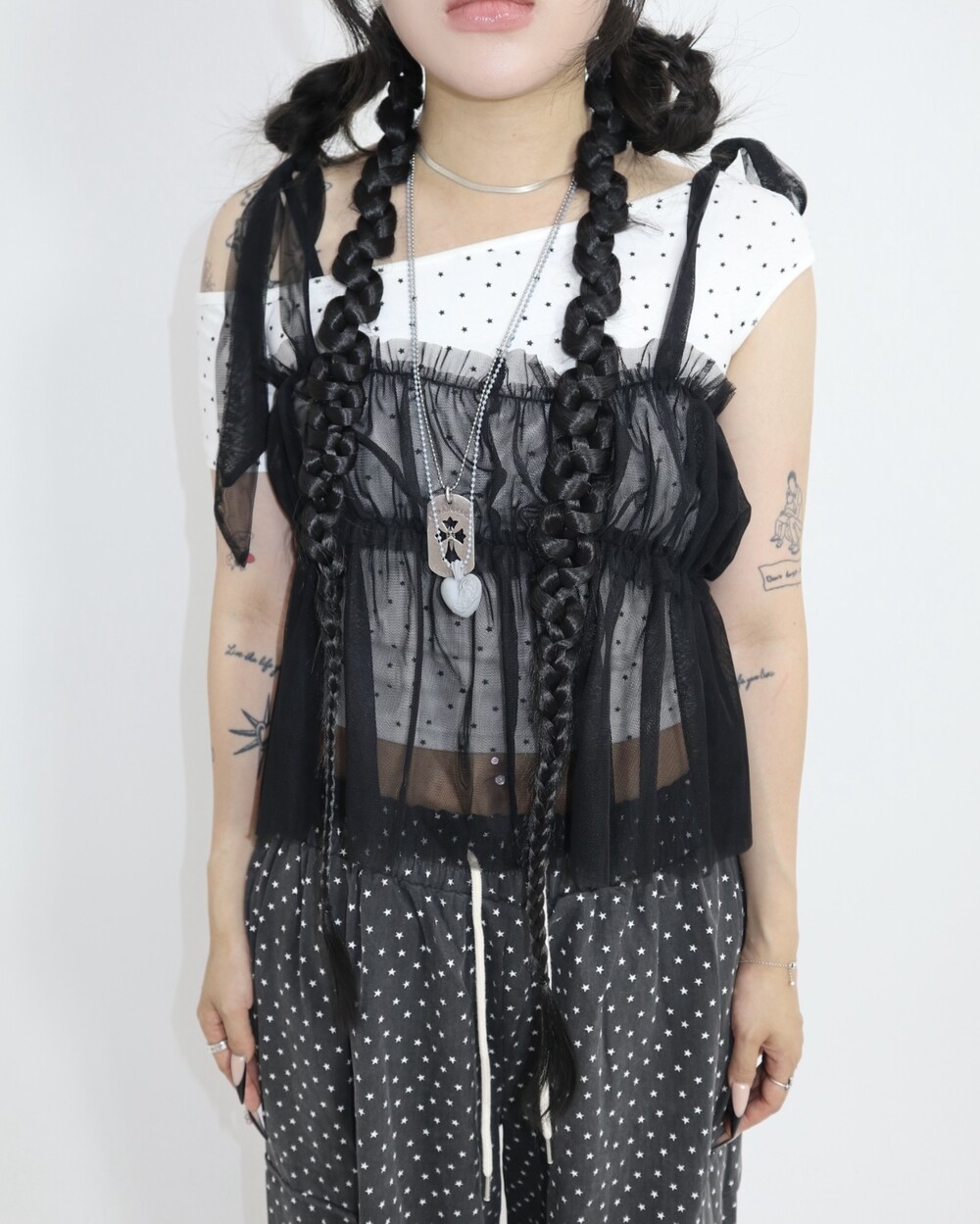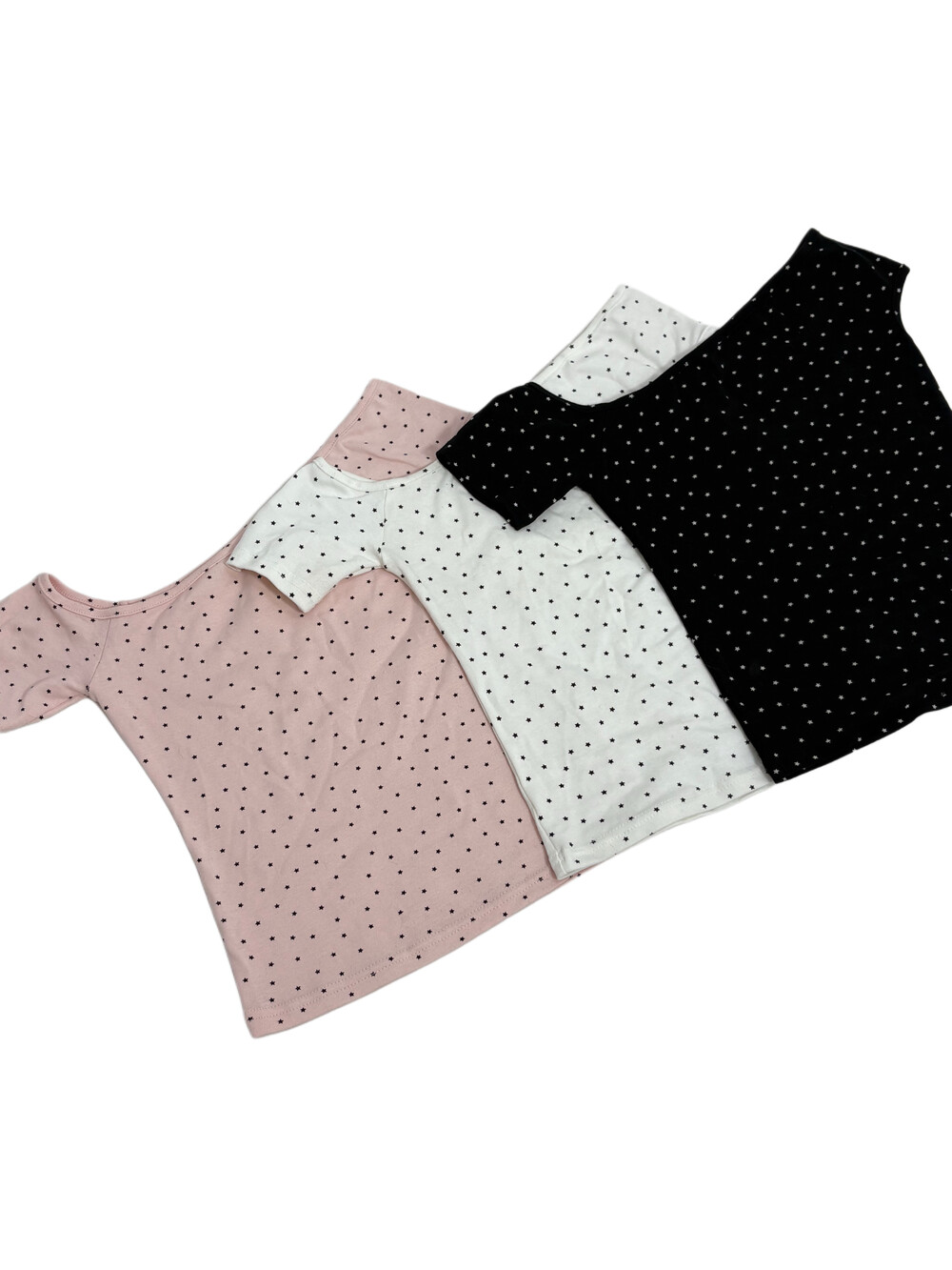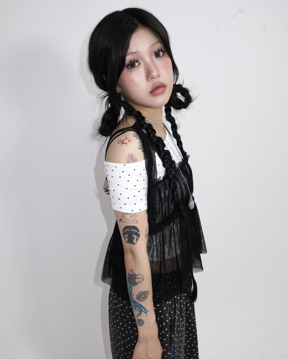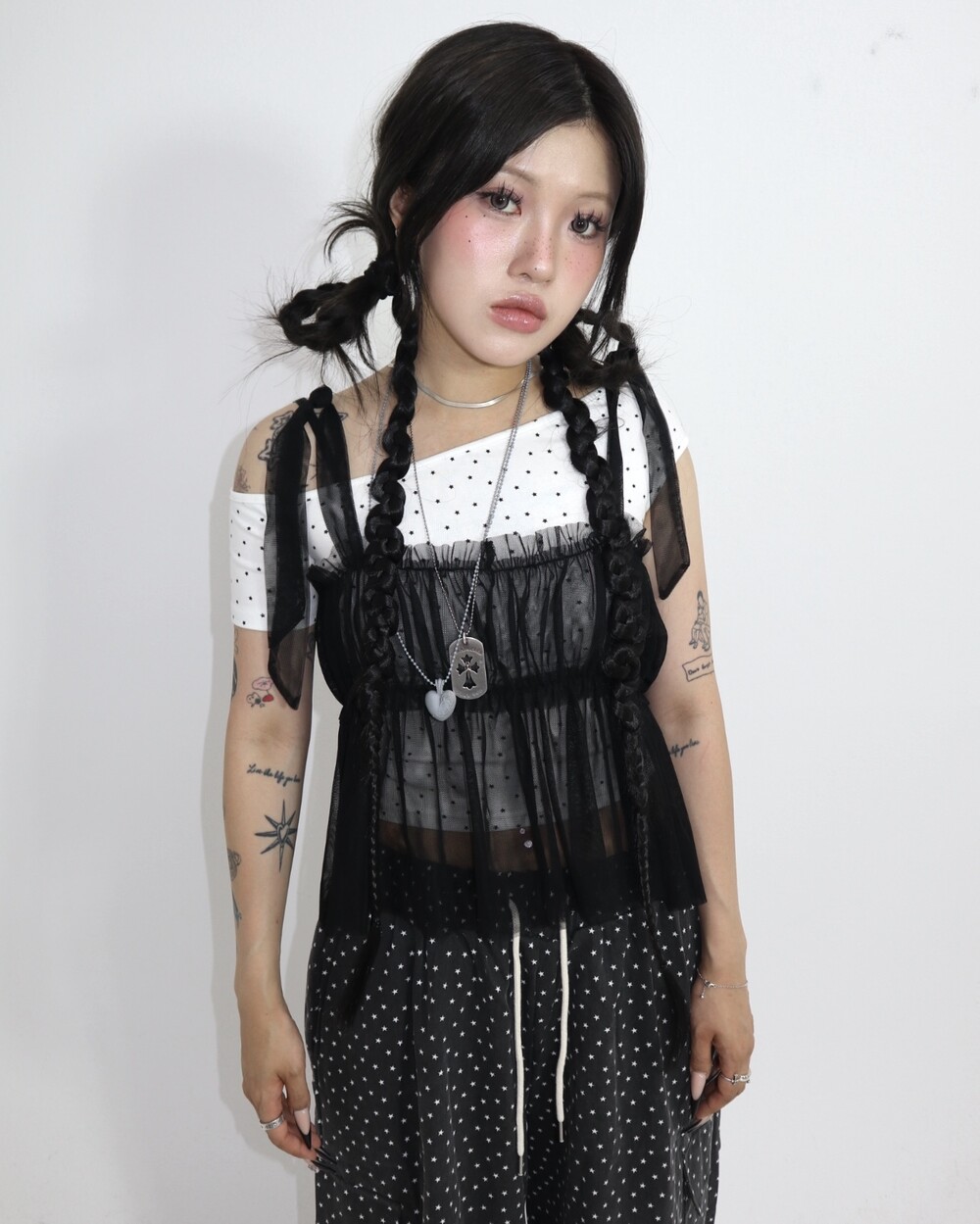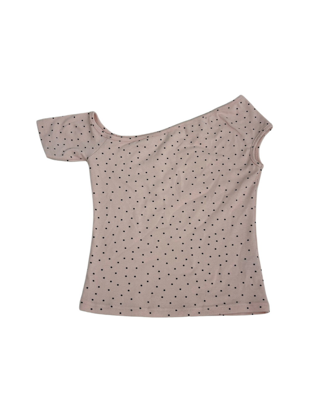 톡톡한 별 프린팅으로 포인트를 준 오프숄더 크롭 티셔츠예요.