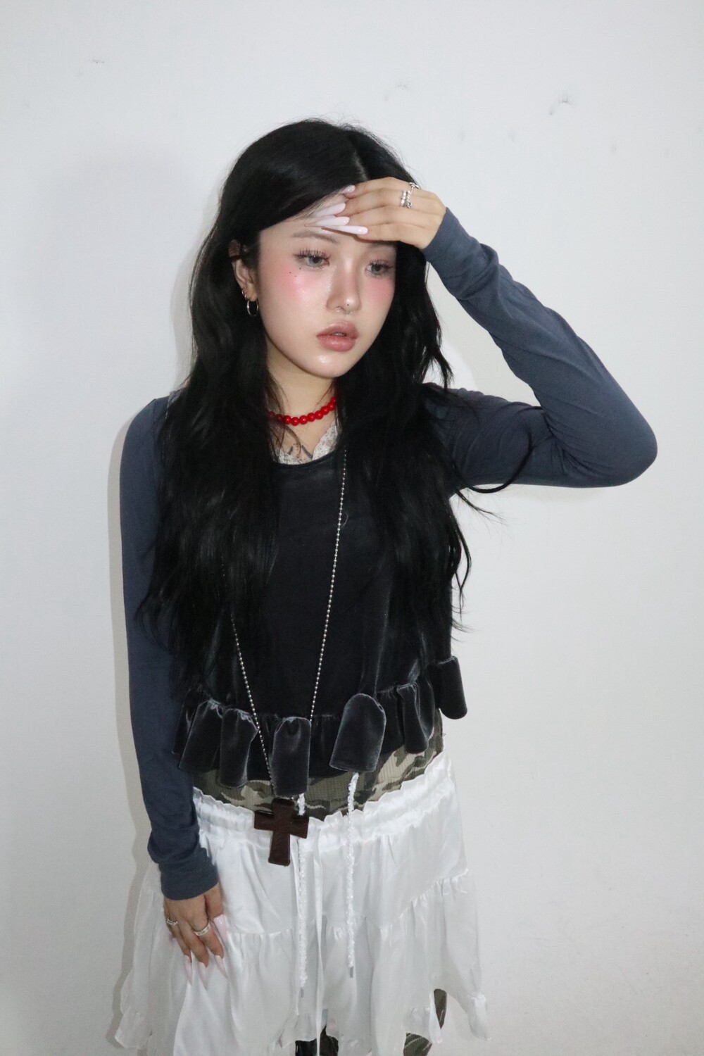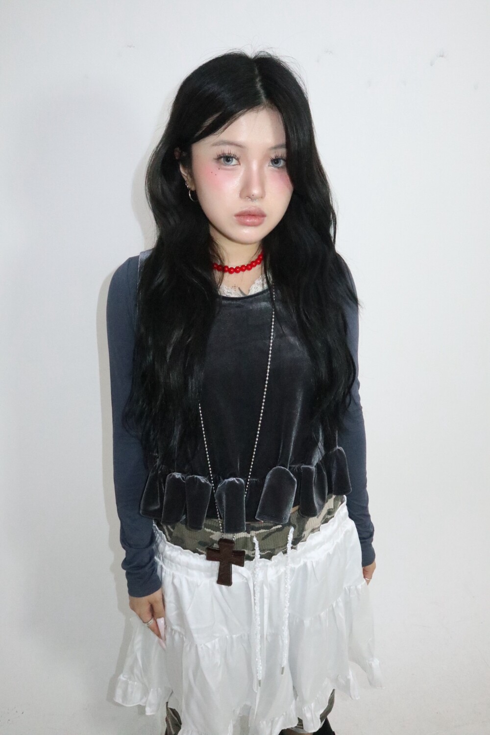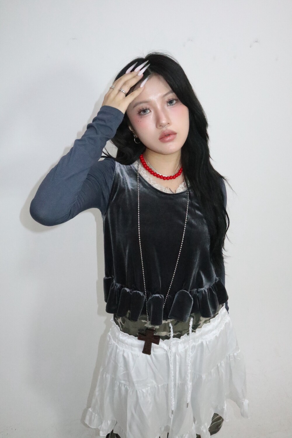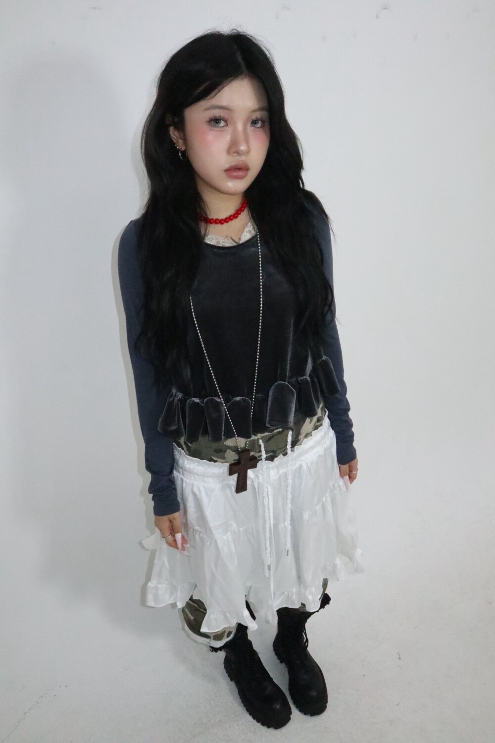 고급스러운 벨벳소재에 프릴 밑단 디테일이 더해져