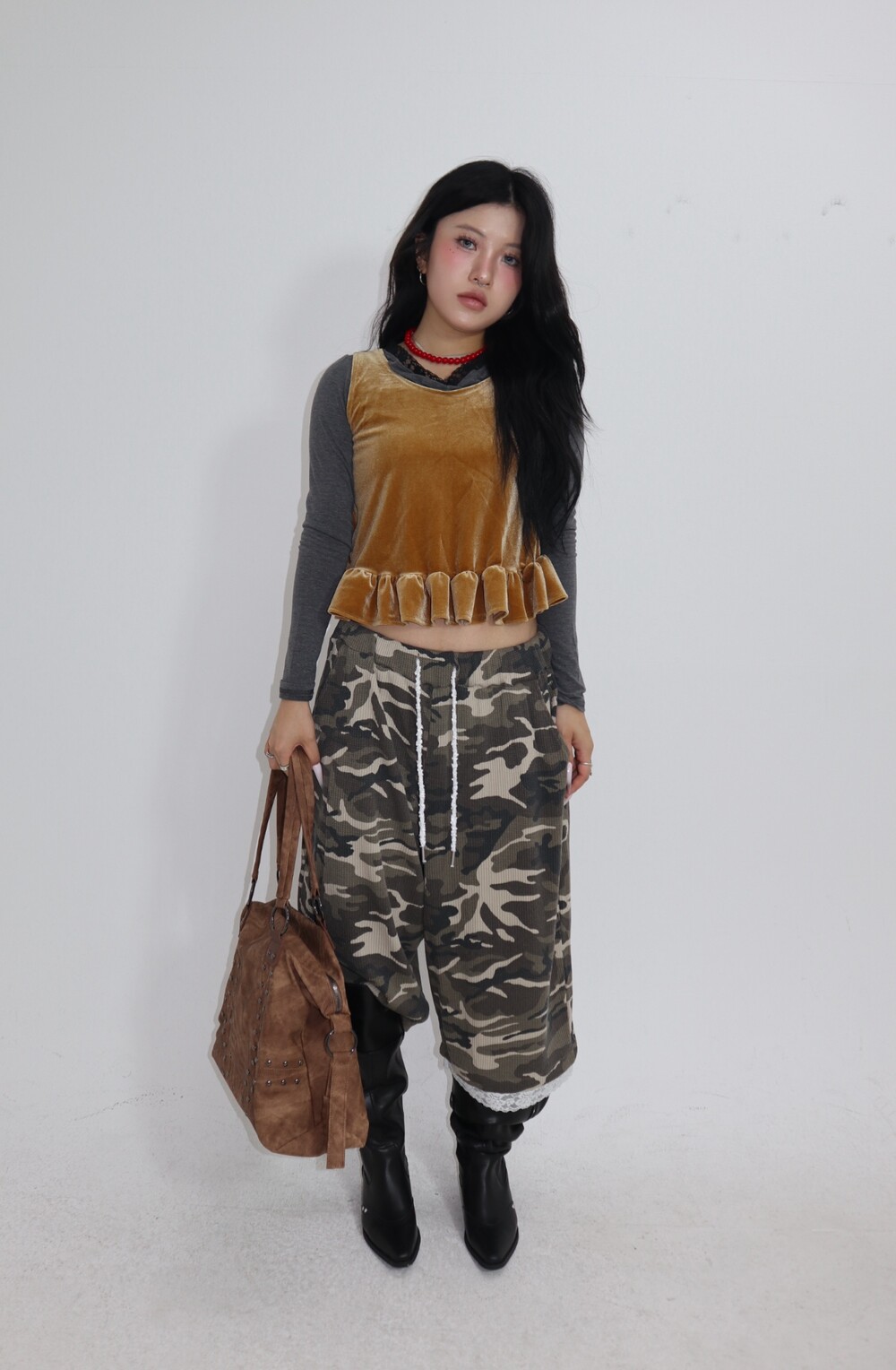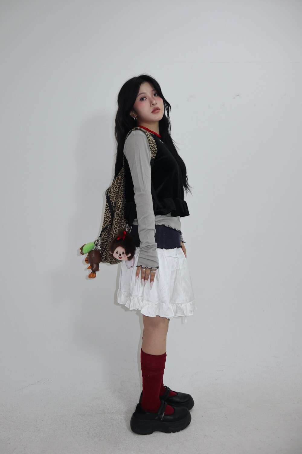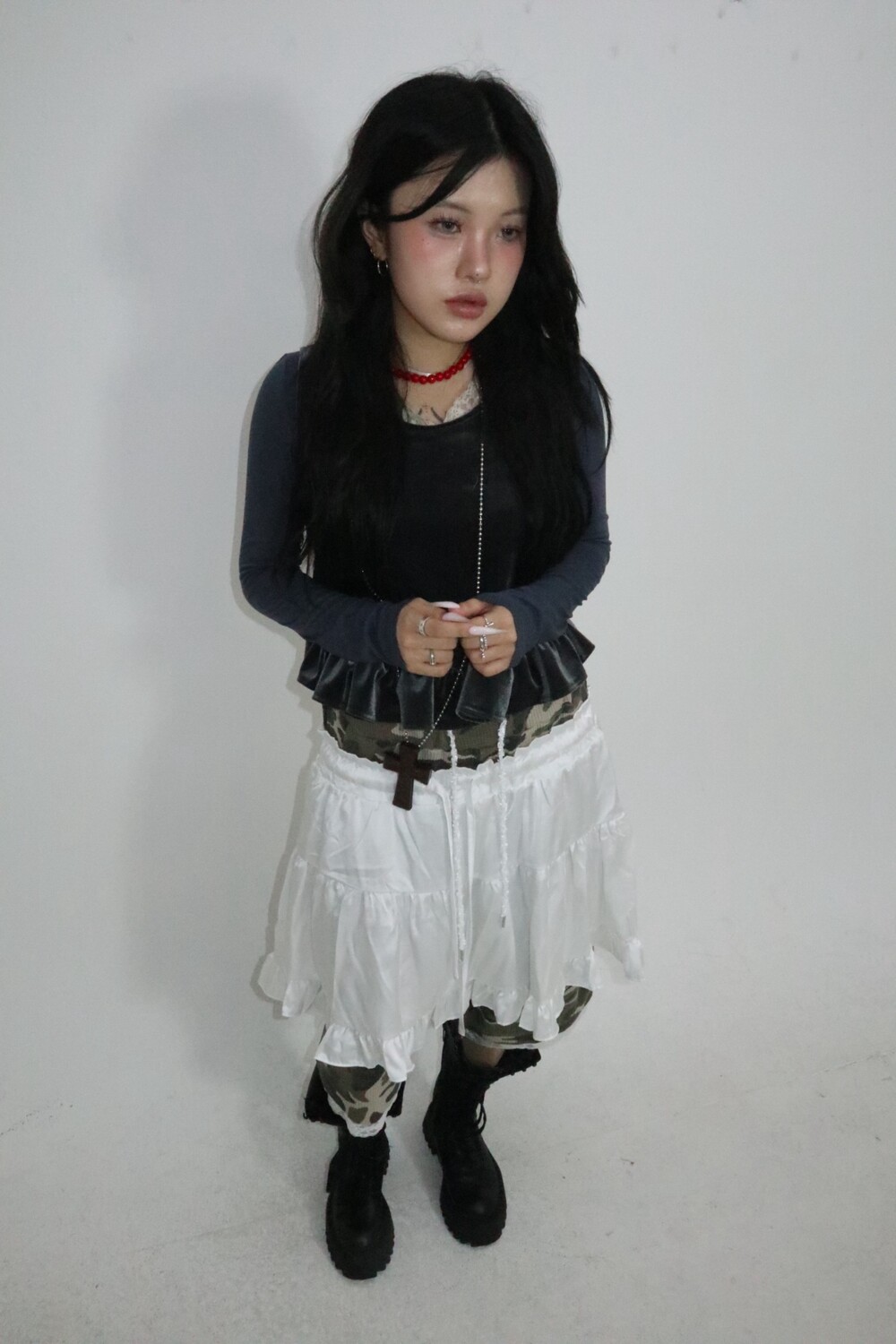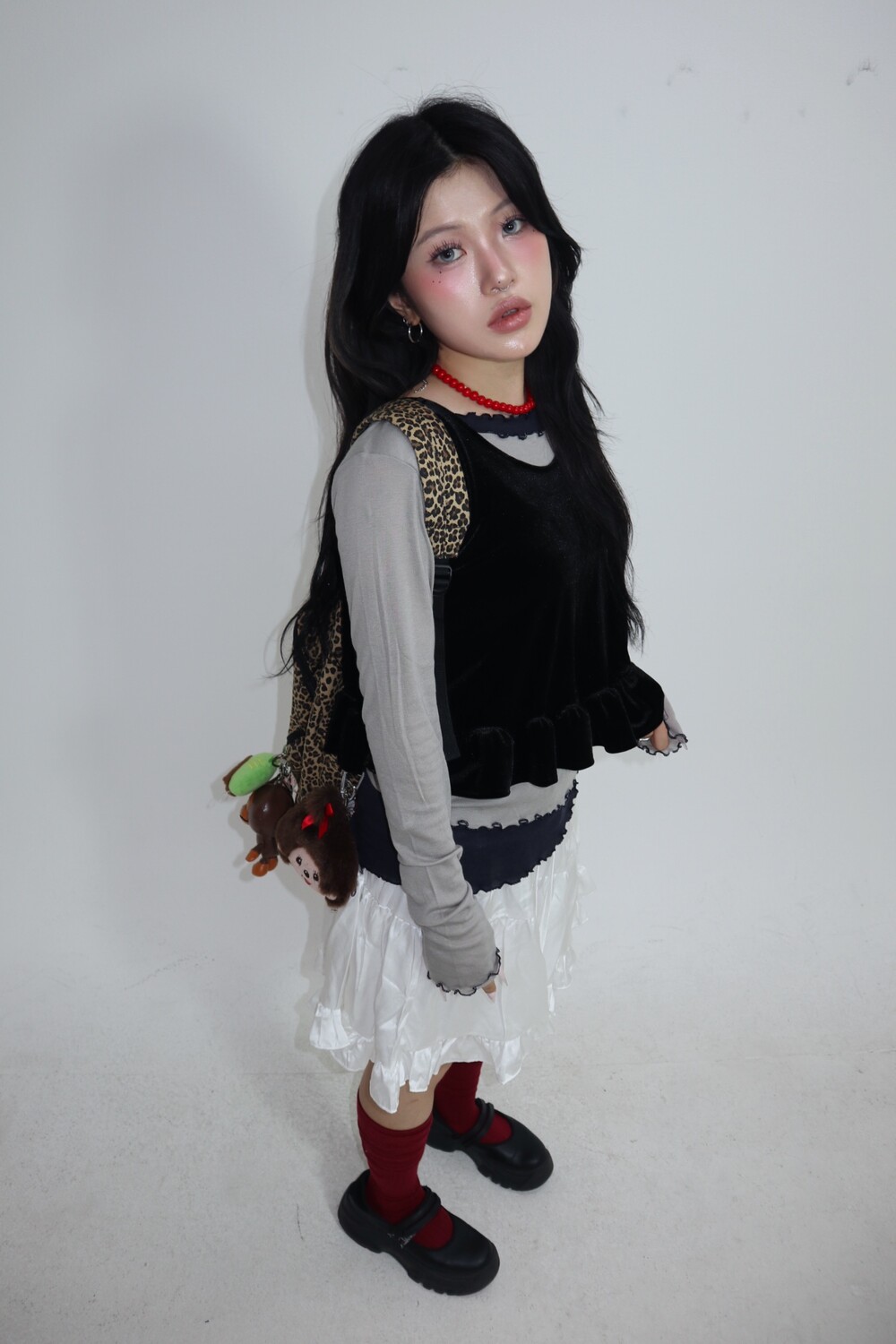 고급스러운 벨벳소재에 프릴 밑단 디테일이 더해져