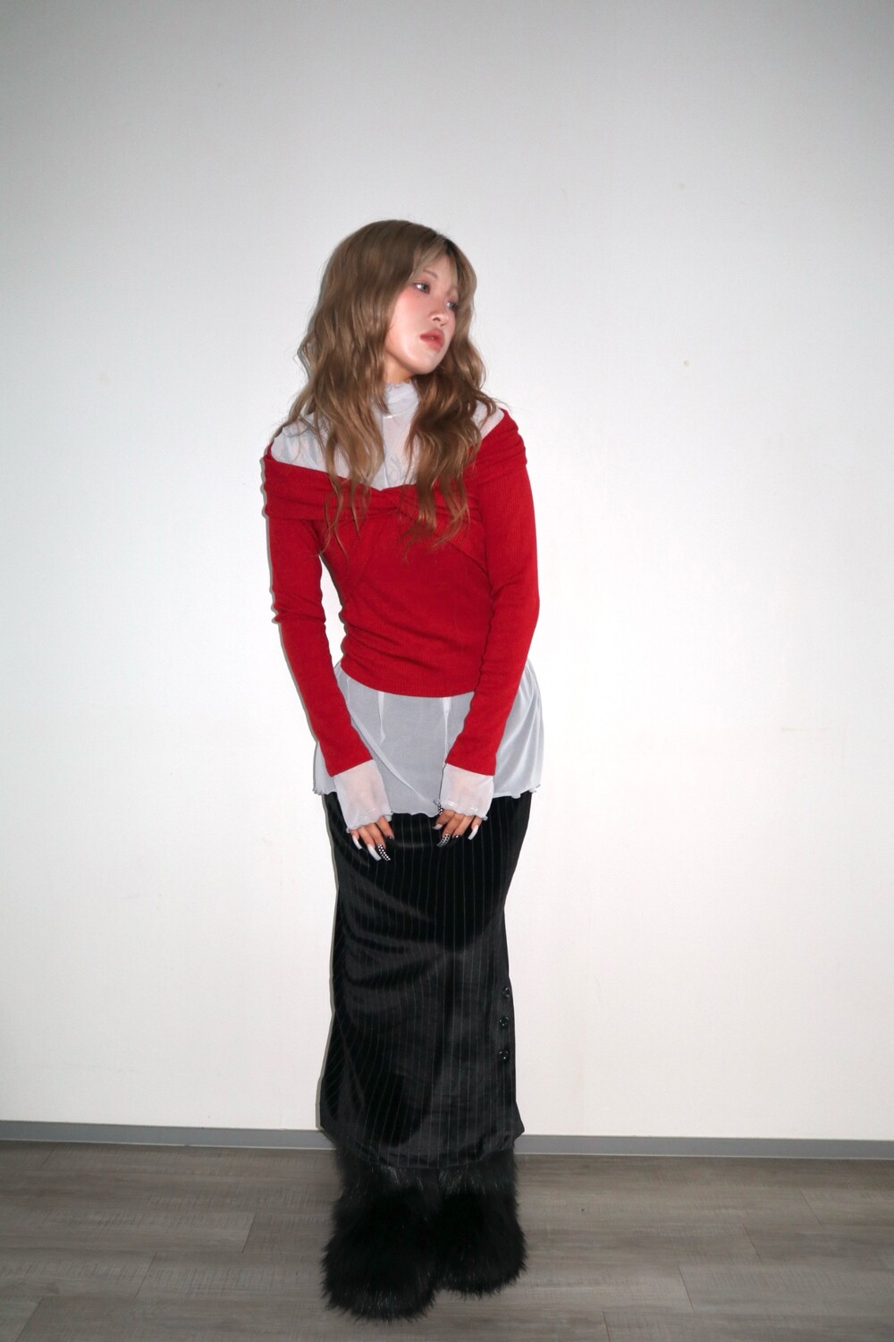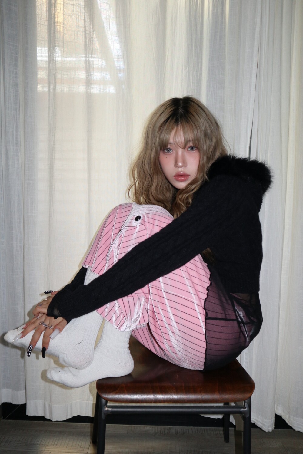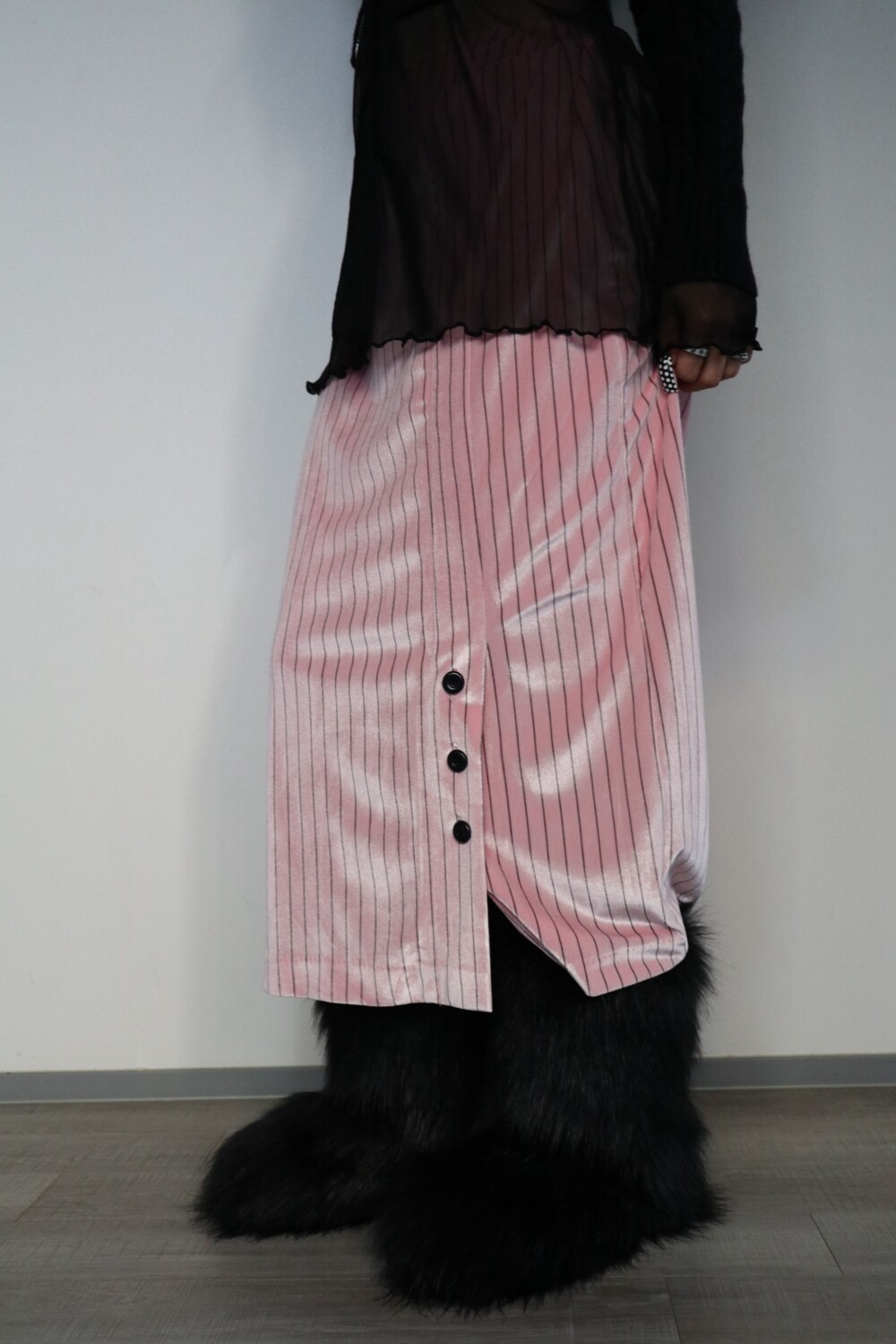 고급스러운 벨벳 소재에 세련된 스트라이프 패턴이 더해져, 빛에 따라 은은하게 변하는 오묘한 매력의 스커트에요.